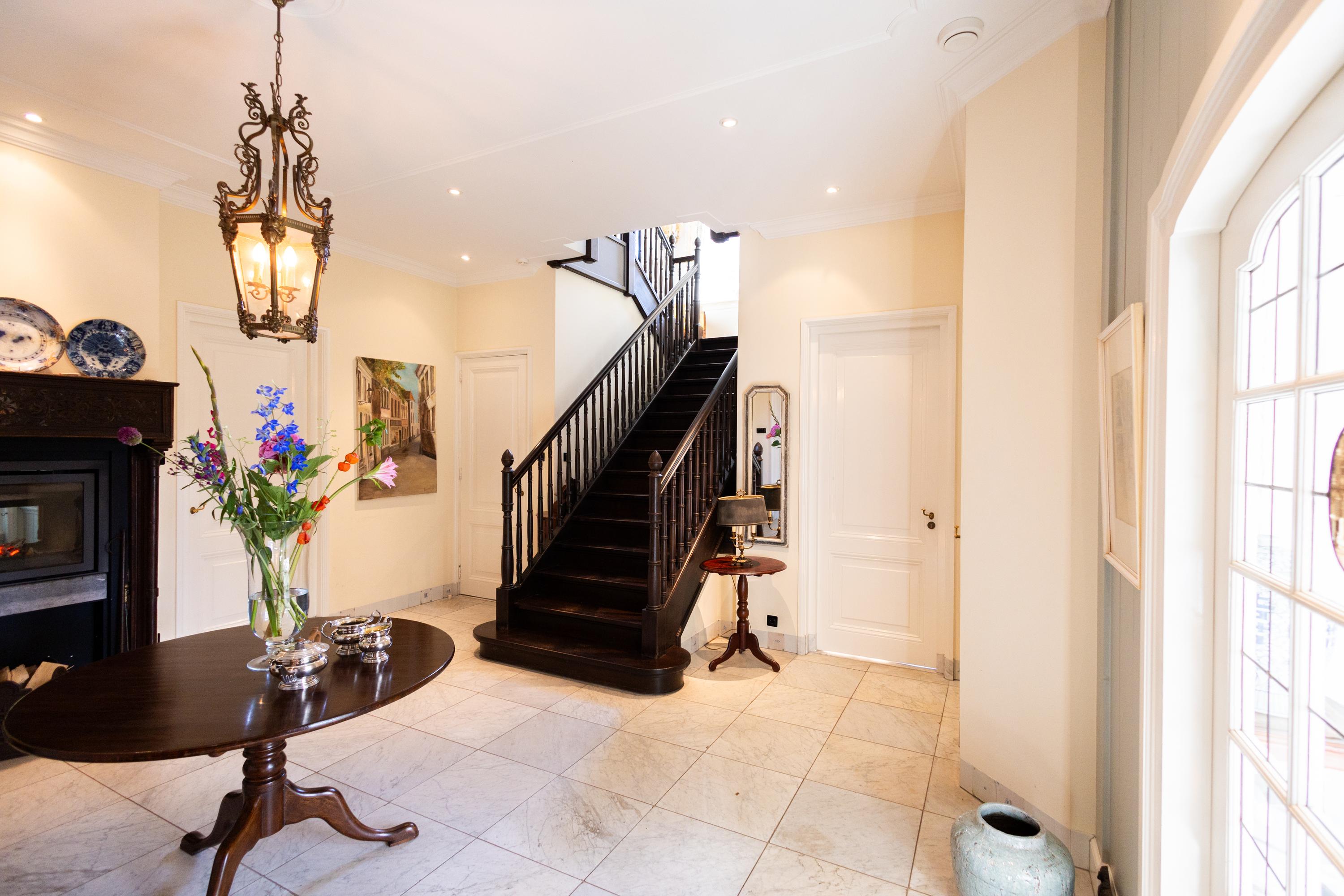 Inside, the villa is as surprising as it is enchanting. With a living area of approximately 350 m² and an additional 150 m² in the basement, the house offers an abundance of space. The ceilings on the ground floor reach nearly three meters high, giving every room a sense of airy openness. The stately entrance hall, with its fireplace and sweeping staircase, feels like a promise of what’s to come.