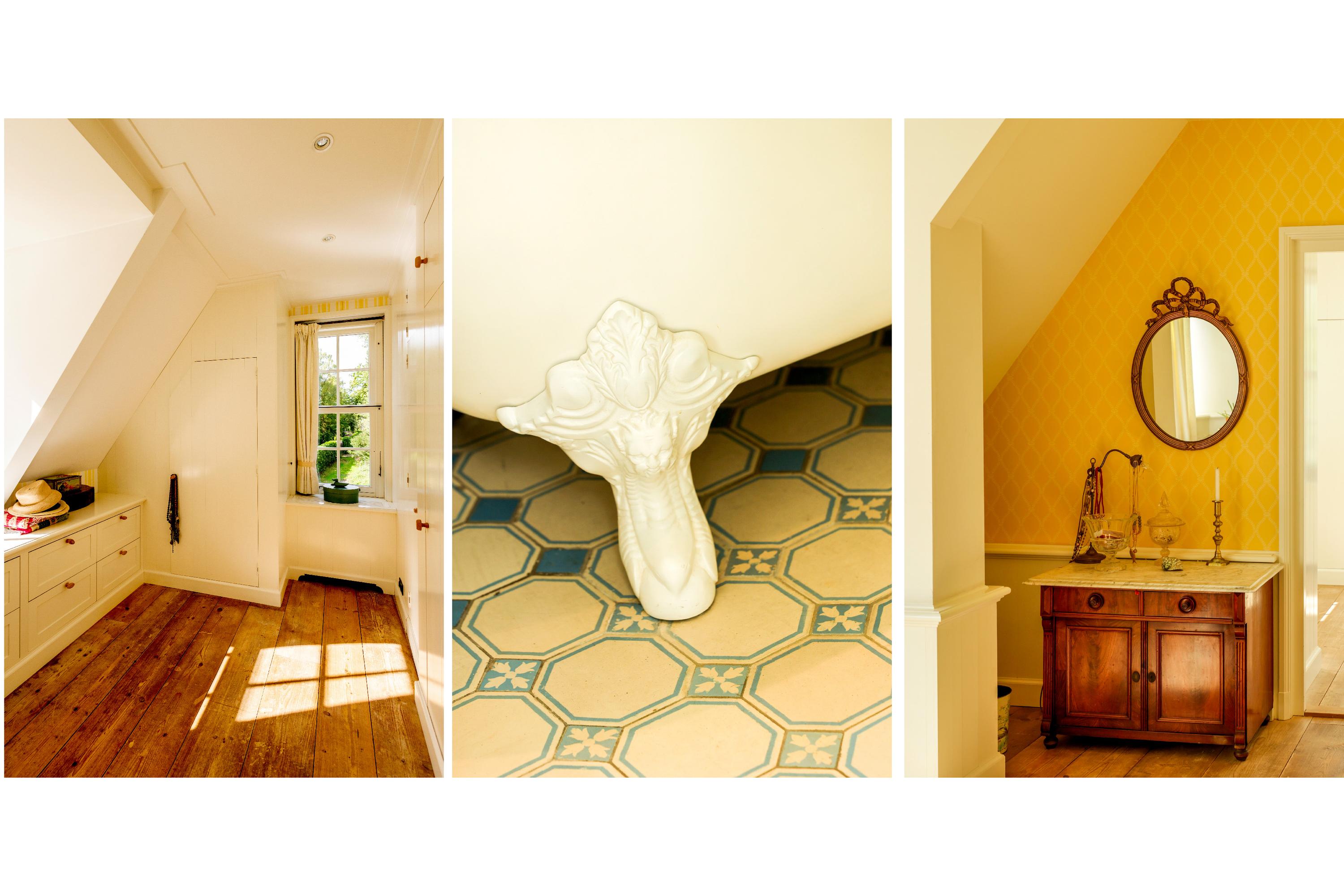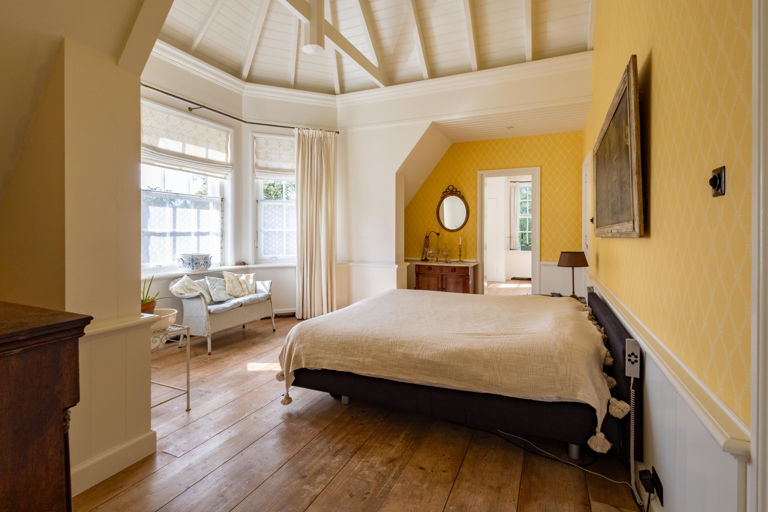 Continuing up the staircase, the second floor reveals a charming attic room, also with a private bathroom.