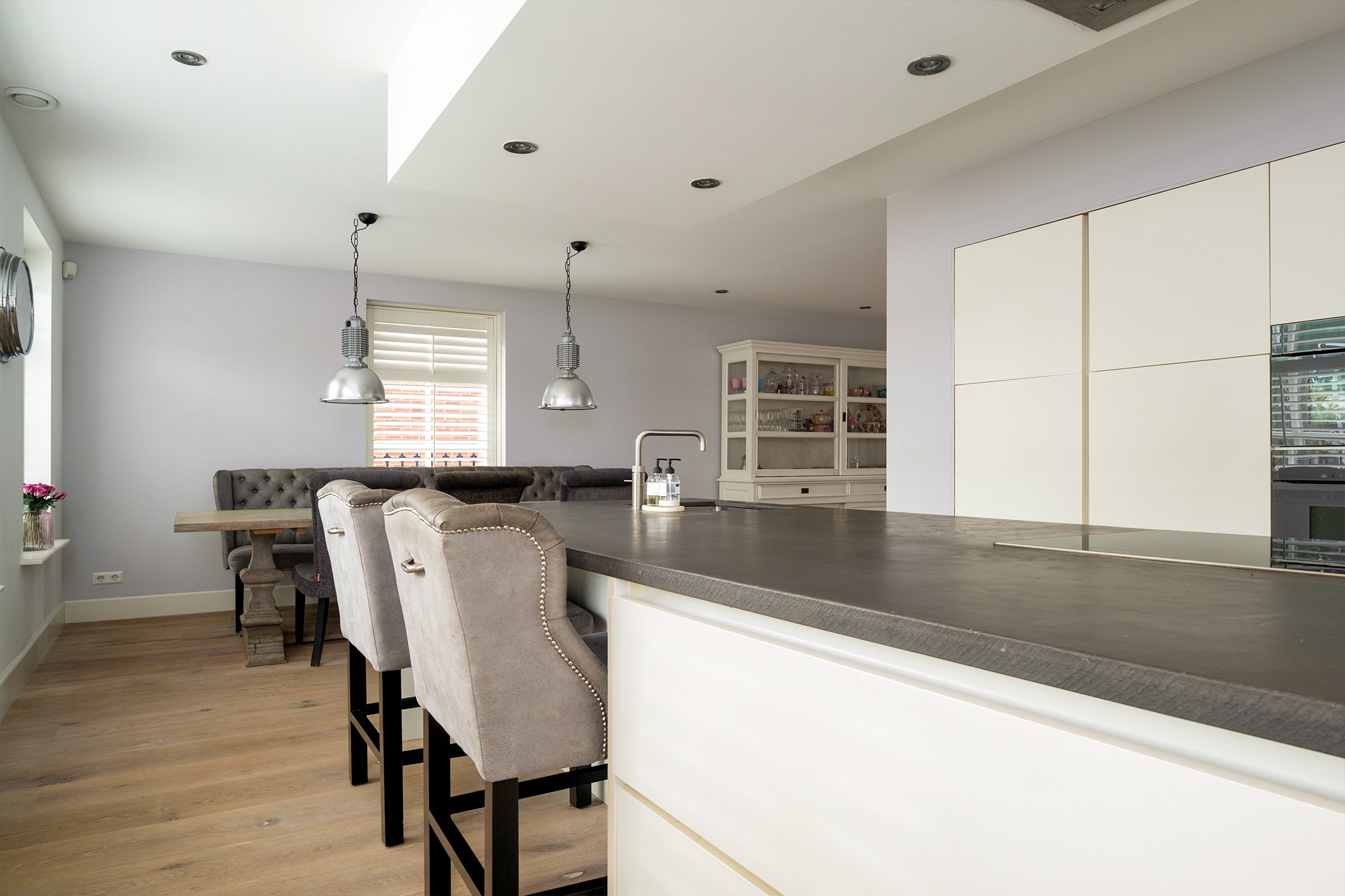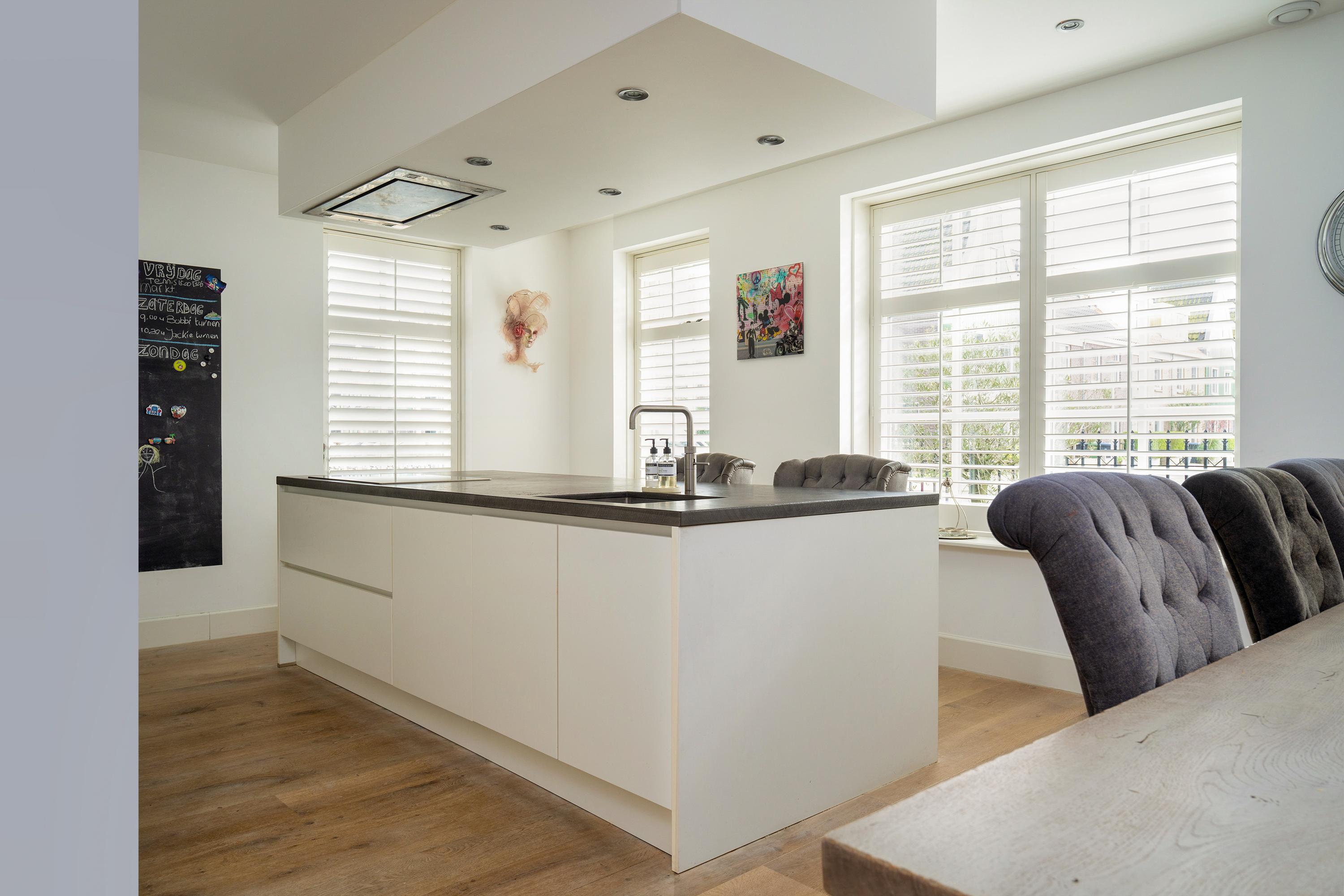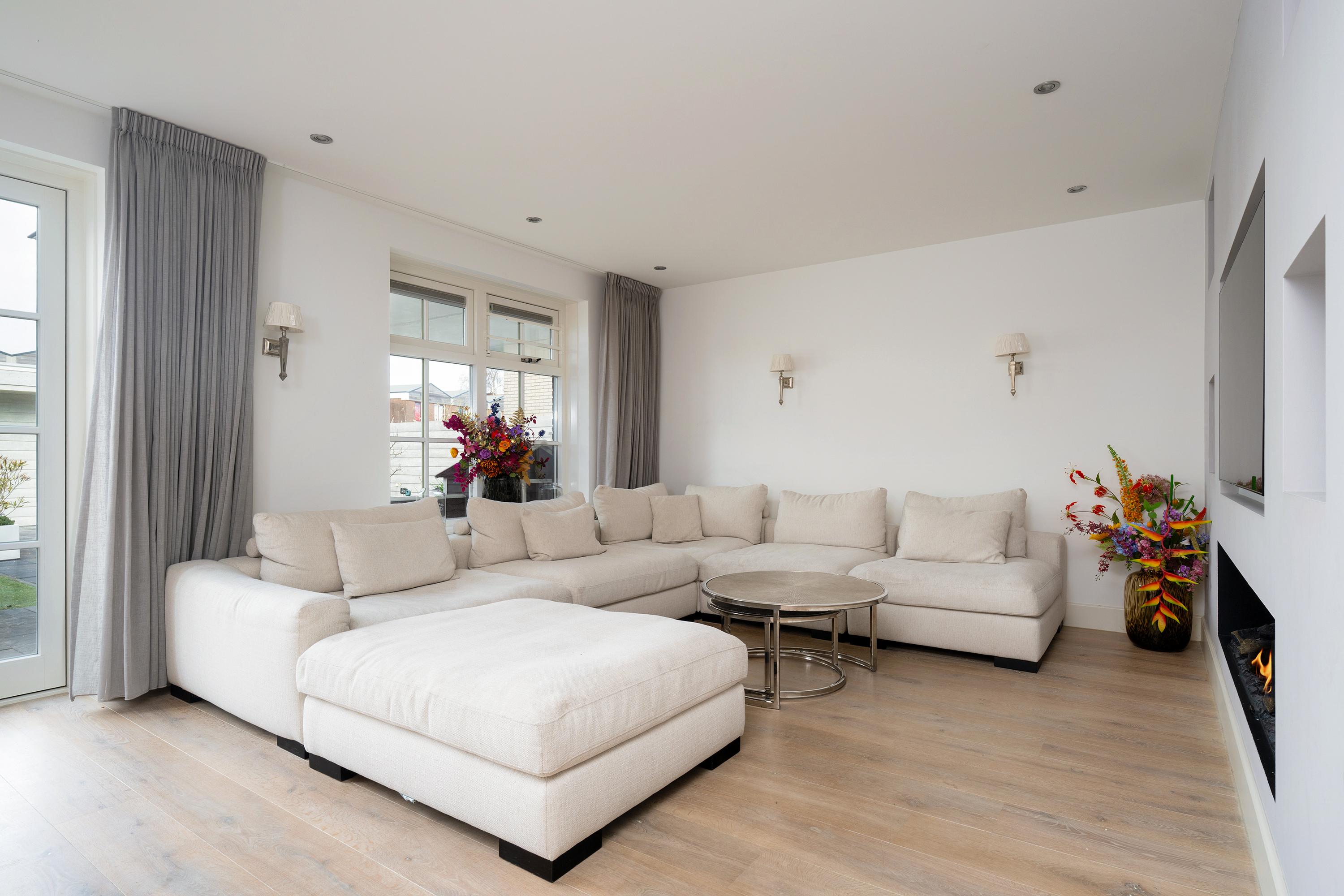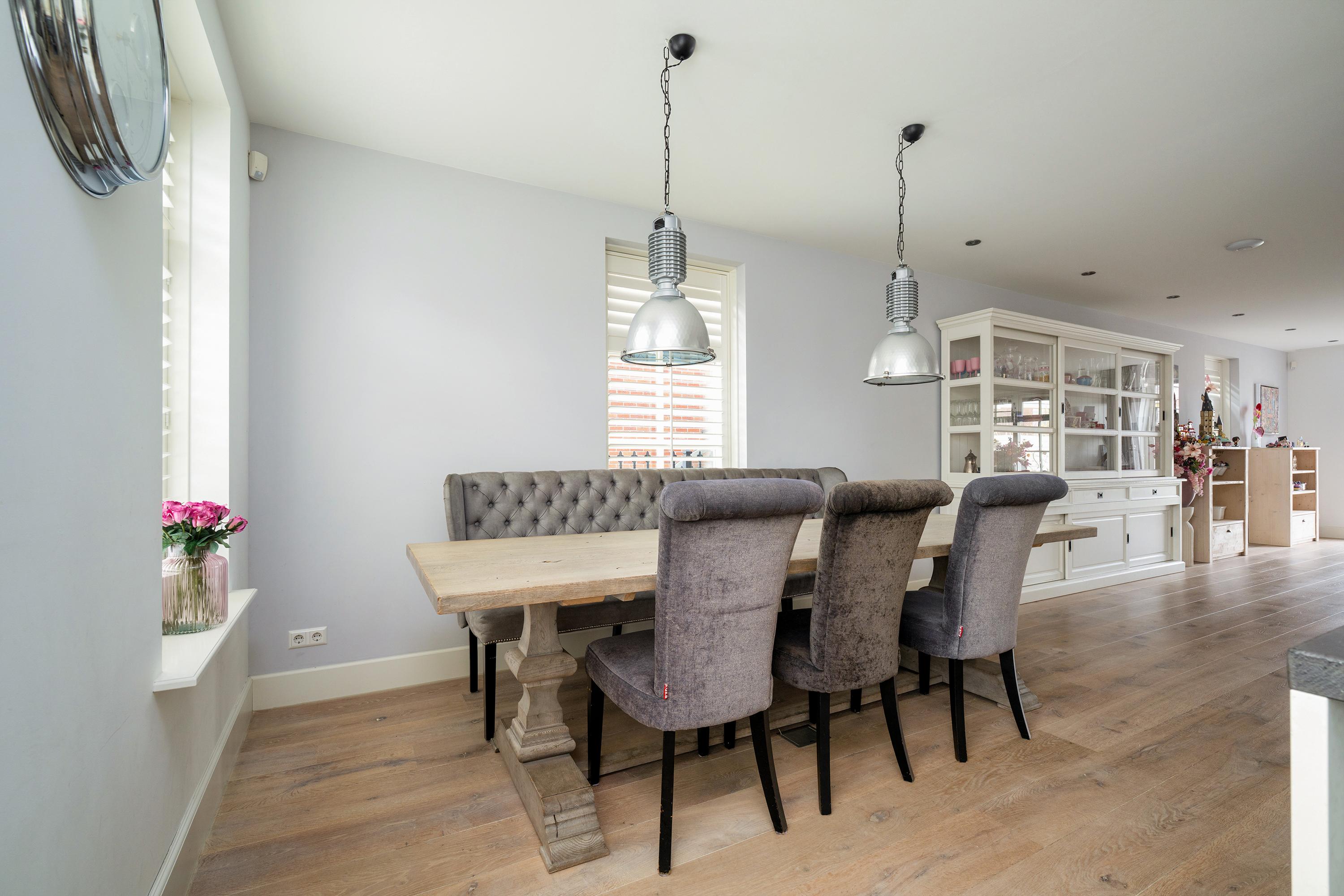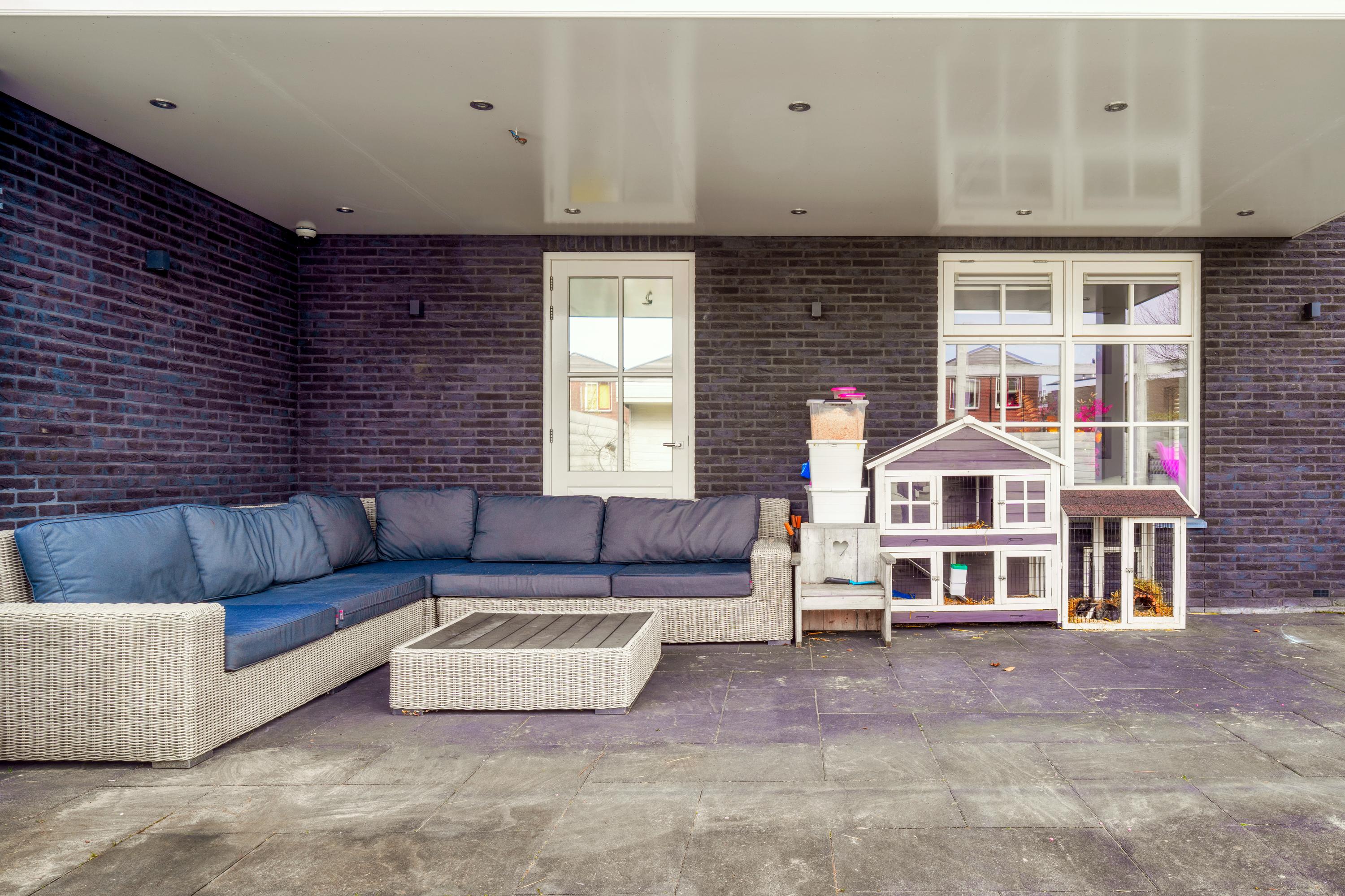 The living room at the garden side is cozy, with a striking cinewall and fireplace. From here, you walk through the double doors into the garden with a very large porch. Perfect for long evenings and outdoor gatherings on the terrace. Built-in trampoline and a swing for the kids. With a glass of wine in hand, you can keep a (small) eye on things. The garden cushions and those of your sloop can be neatly stored in the wooden shed. And that sloop? You simply moor it directly behind the house. On a beautiful summer day, you can sail straight to Amsterdam.