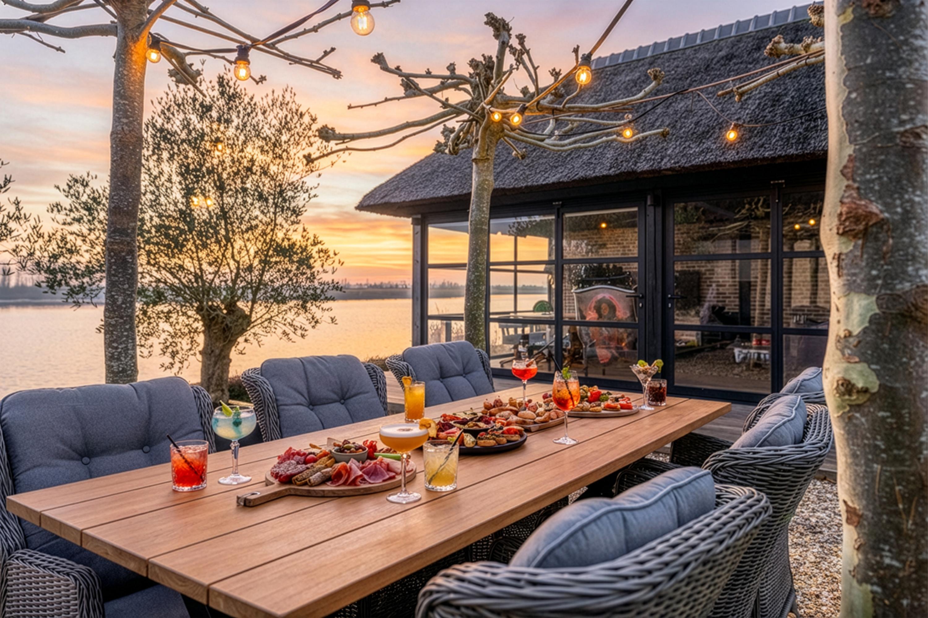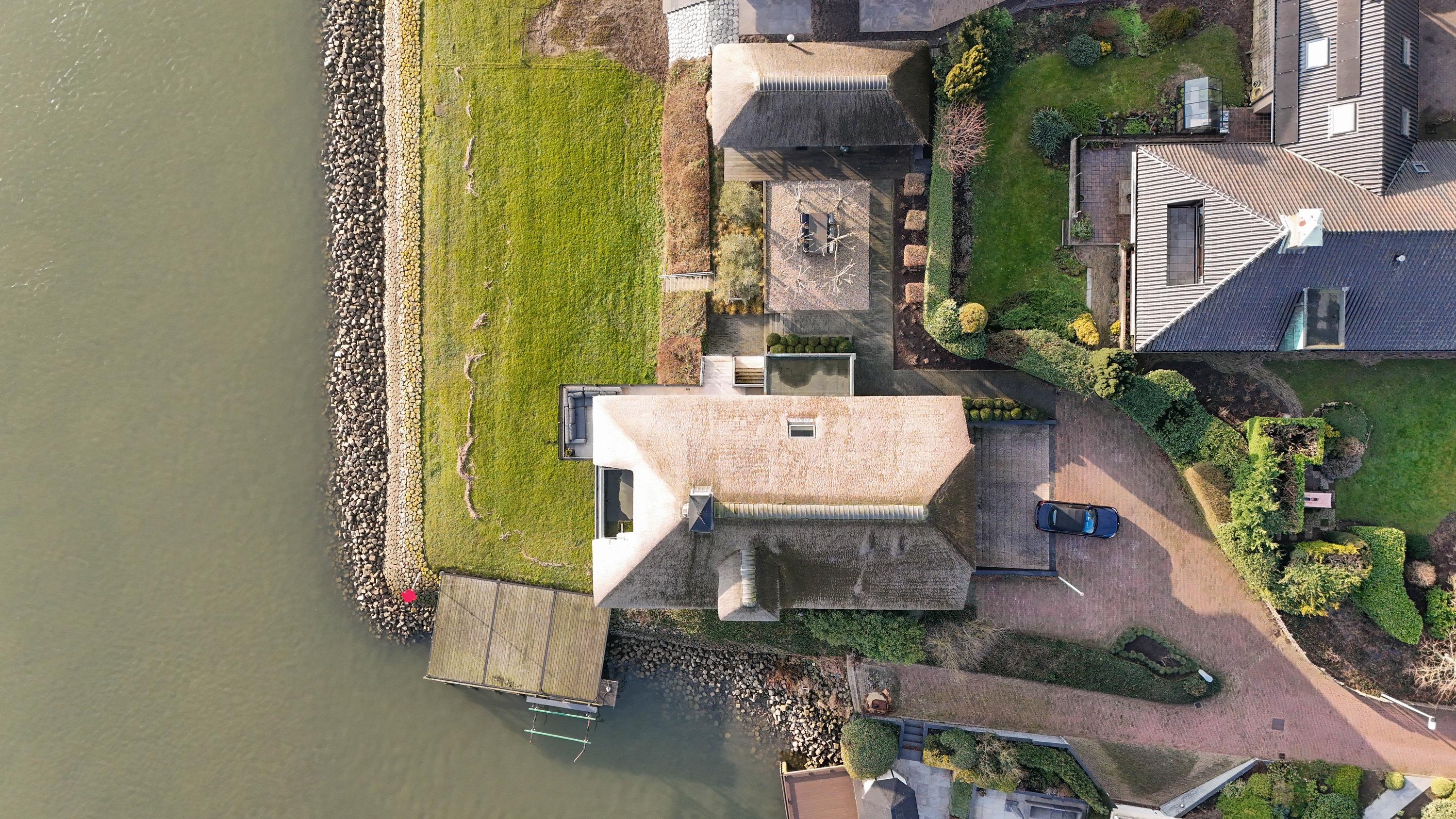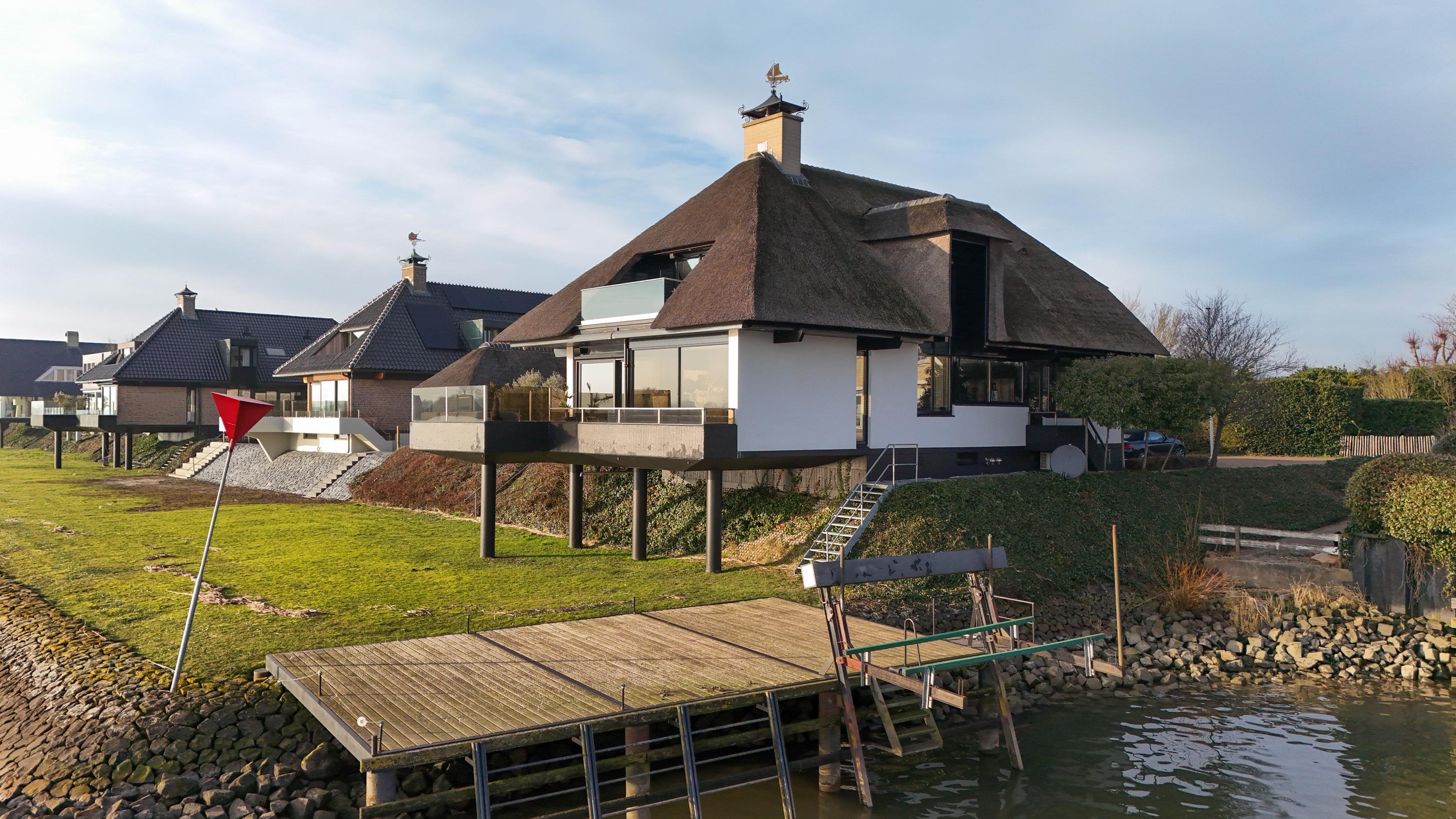 De Werf 5 in Lekkerkerk is a home for people who know what they want. Peace, space, water at your feet and comfort at a high level. This thatched villa is located in a truly rare spot, directly on the river Lek, with its own private jetty and boat lift. Here, you can step straight from your garden onto the boat and sail towards the Biesbosch, Dordrecht or Rotterdam. The view over the water never gets old and changes every moment of the day. This is living with allure, freedom and privacy.