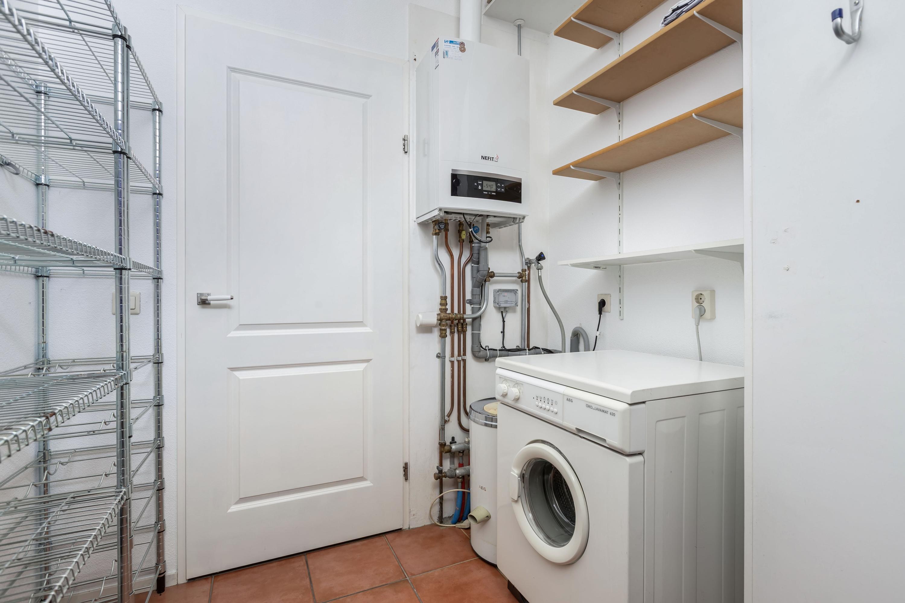 an internal storage room with white goods connections and exterior door;