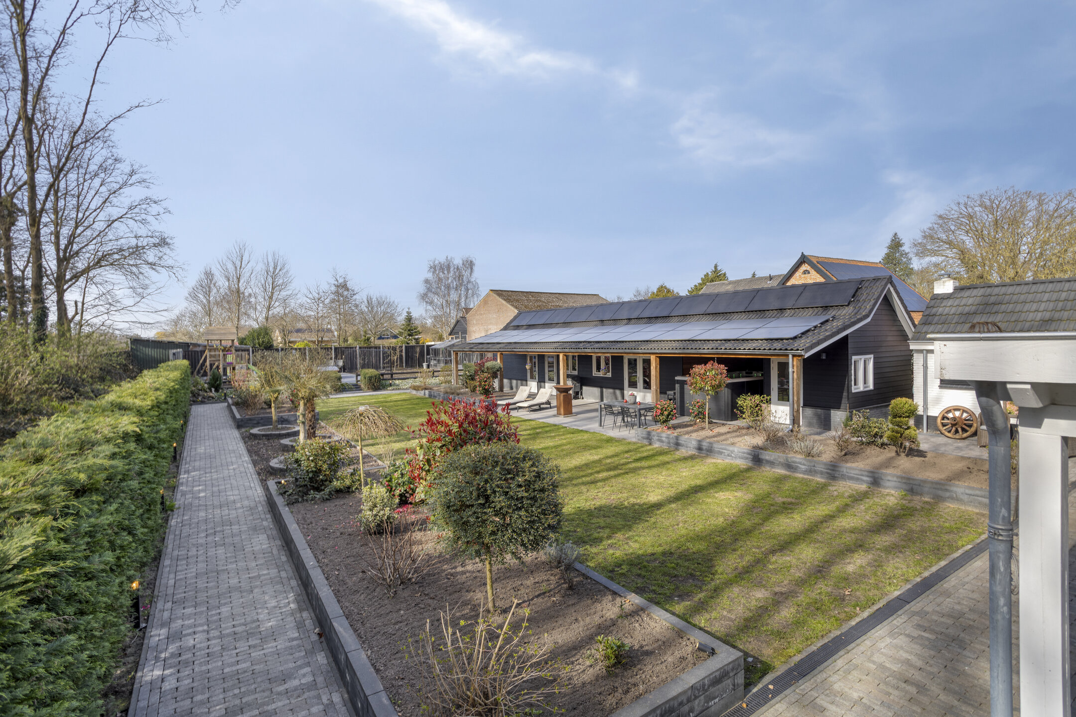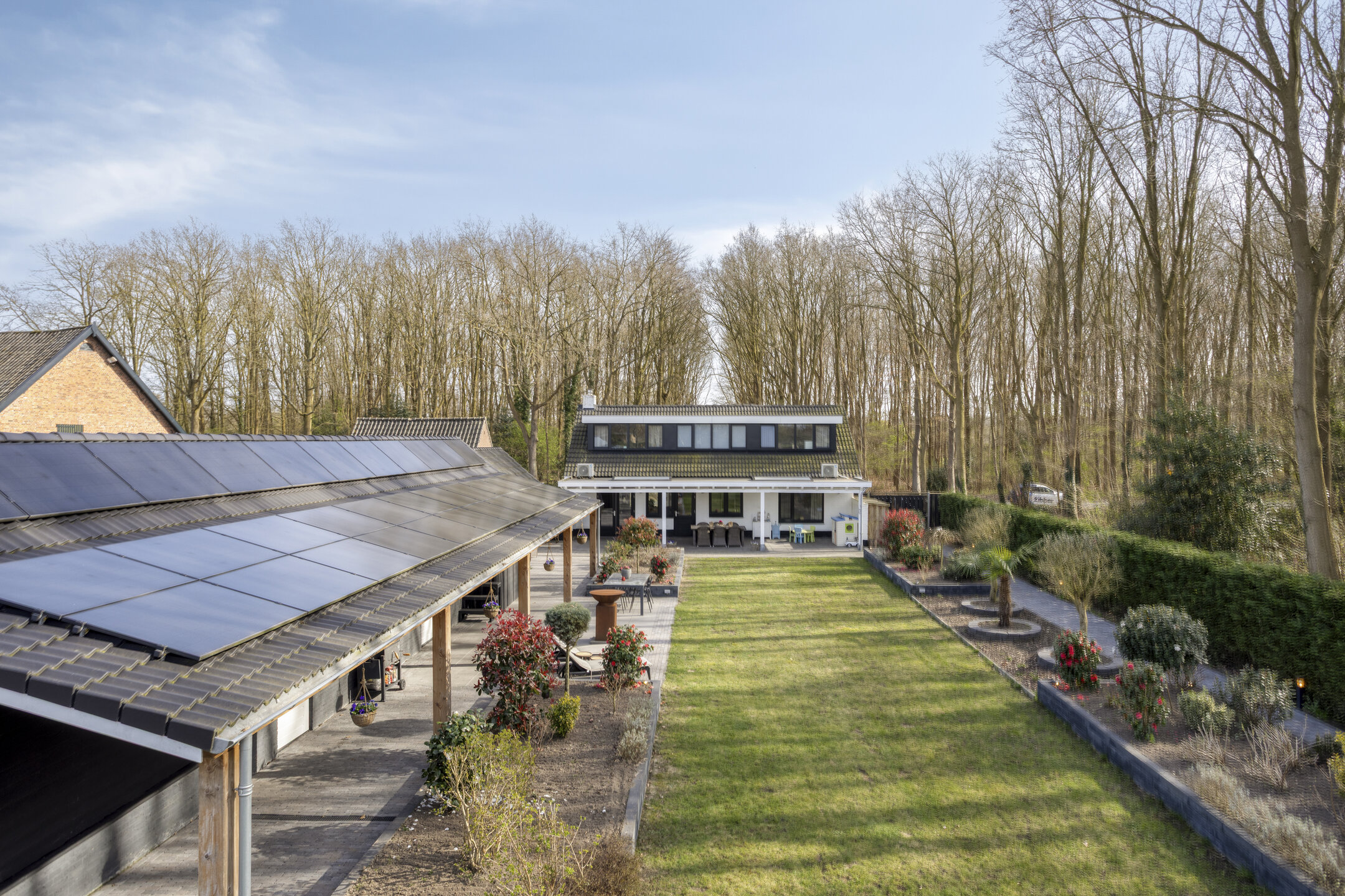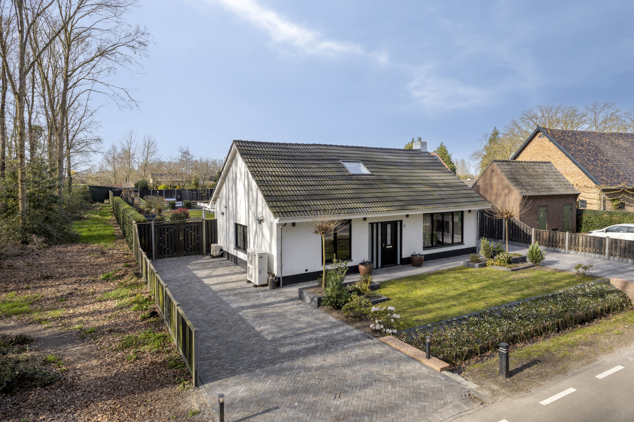 Extremely sustainable and energy-efficient (energy label A+++), this home is fully future-proof and equipped with every conceivable modern installation. Features include double wall insulation, floor and roof insulation, HR++ glazing in hardwood frames, an air-source heat pump with a 260-litre boiler tank, underfloor heating on both the ground and first floors, no fewer than 44 solar panels, and multiple air conditioning units.