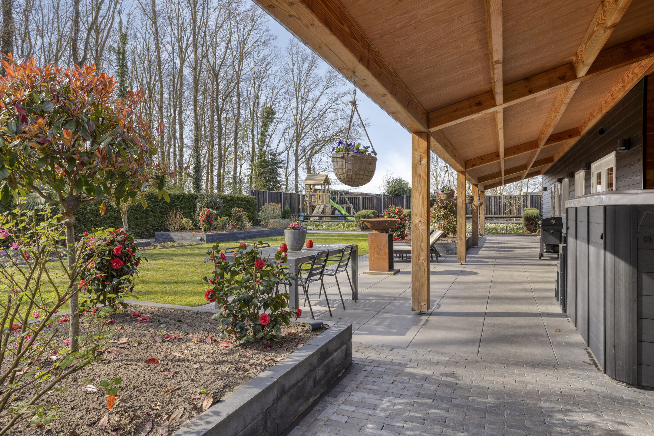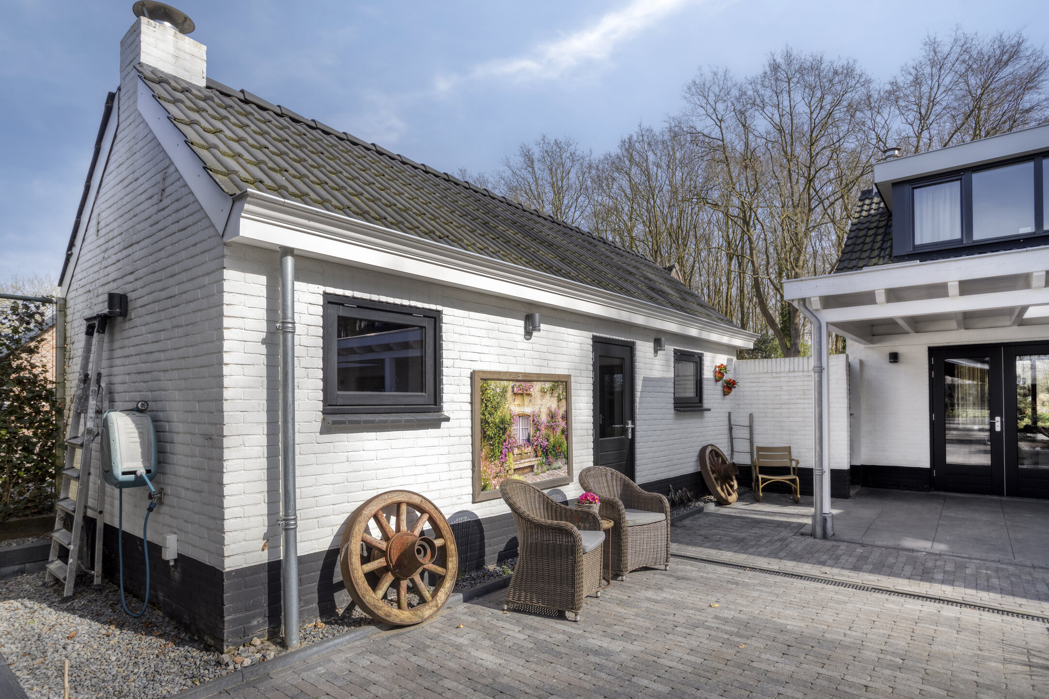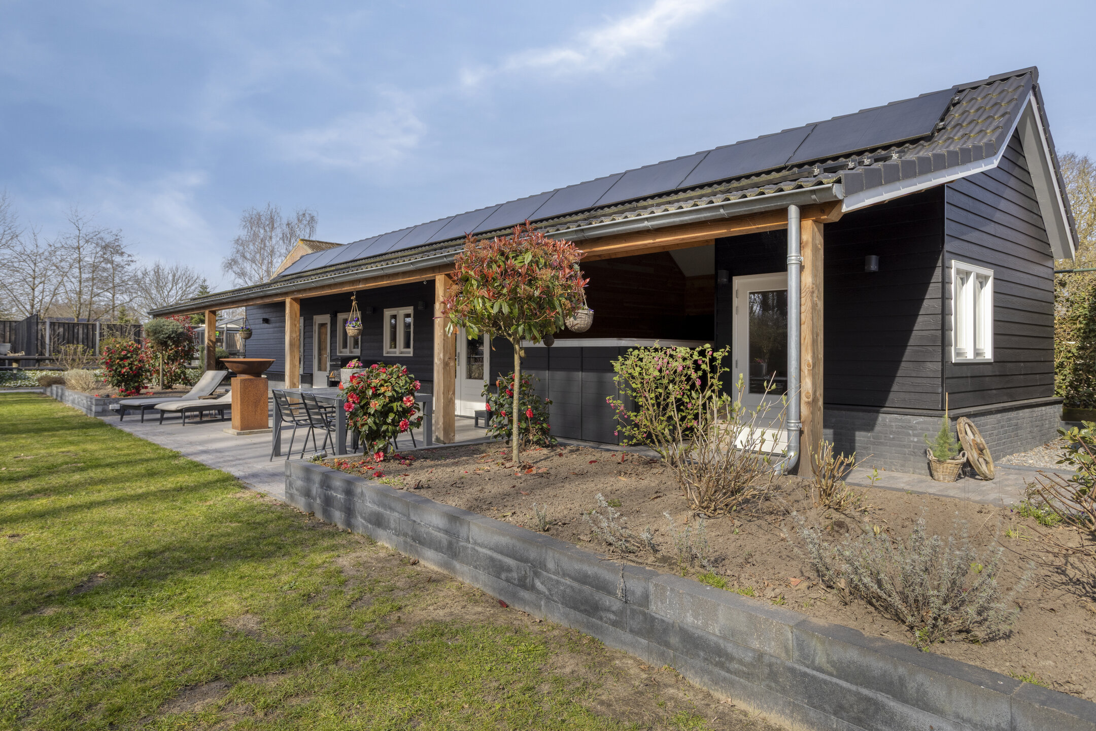 The absolute eye-catcher is the fully insulated outbuilding, finished to a very high standard and offering a wealth of possibilities. With a footprint (including veranda) of approximately 124 m², it is divided into several practical and luxurious spaces.