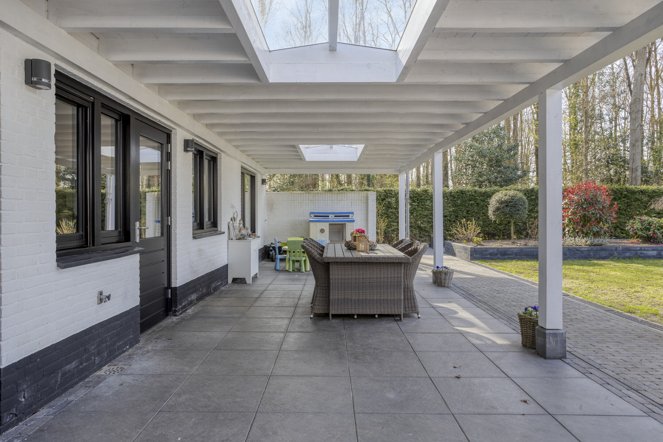 The former garage has been practically converted into a utility room with all necessary connections for household appliances. Thanks to its double doors, it can also serve perfectly as a bicycle storage area, adding to the overall convenience.