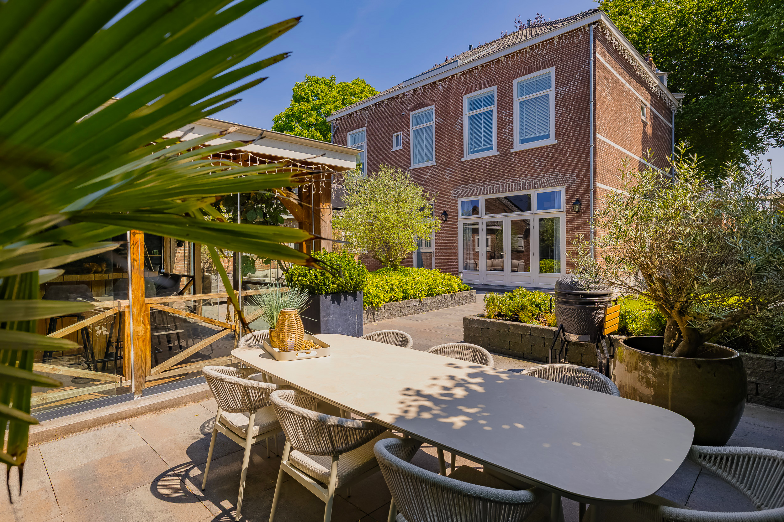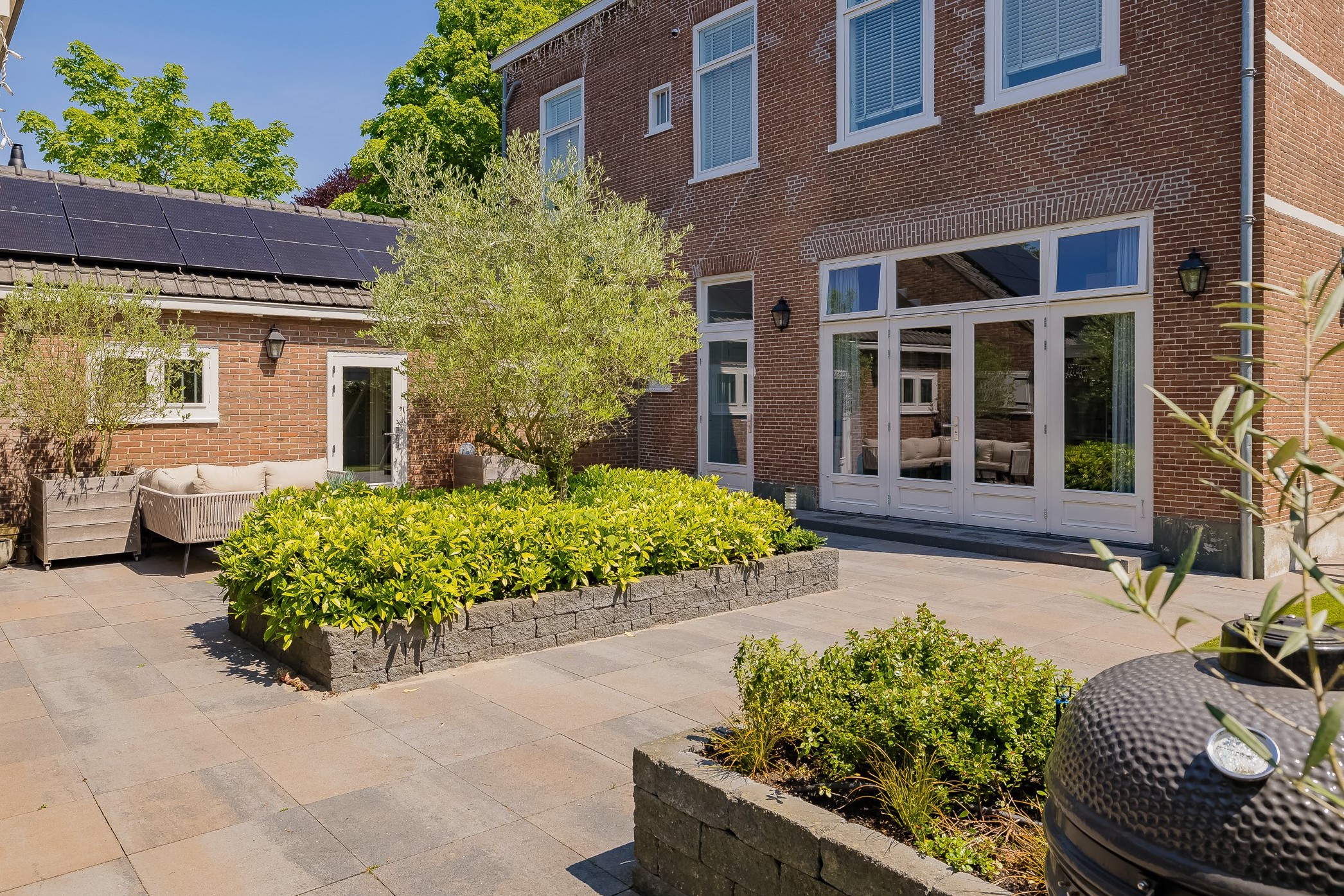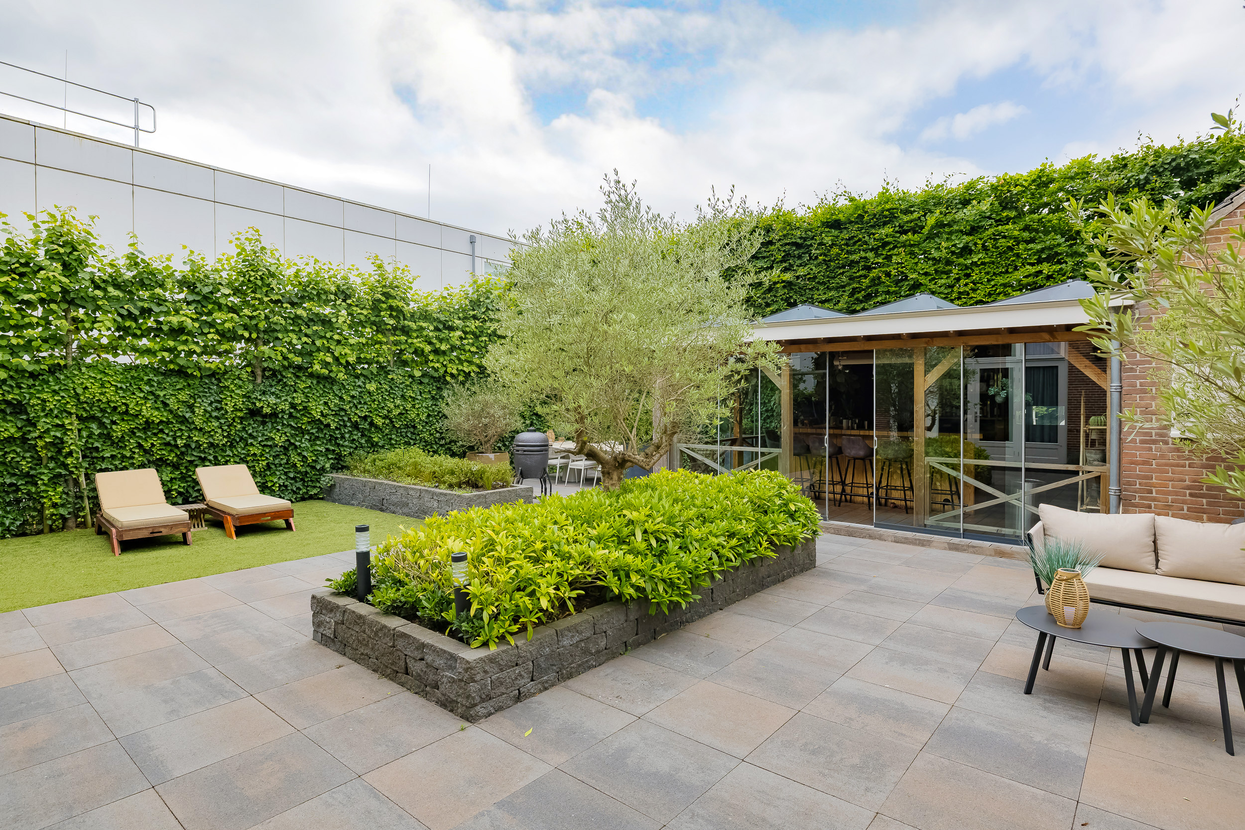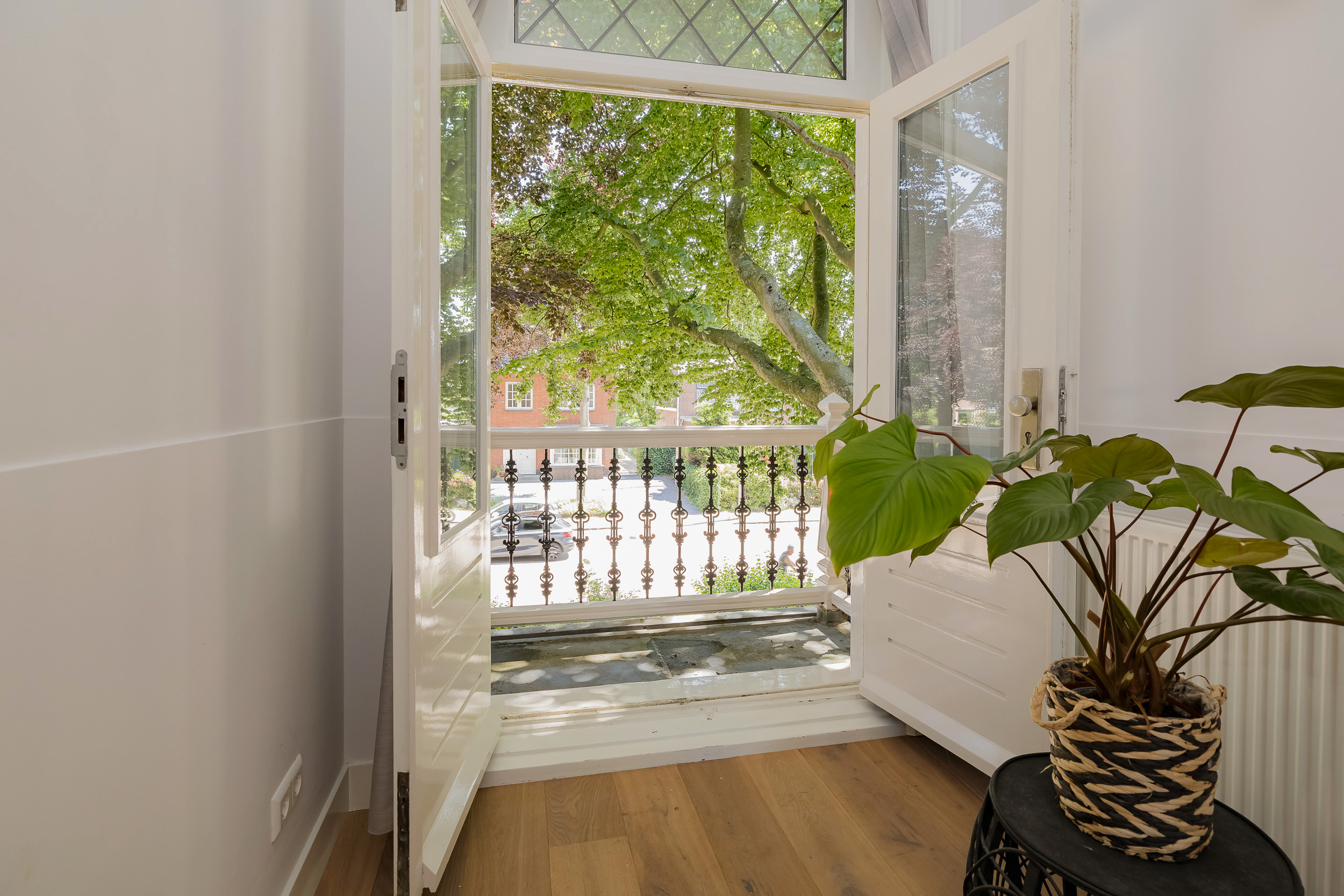 The beautifully landscaped garden surrounds the house and includes a new in authentic style wrought iron fence, lighting and irrigation. The very sunny backyard of 13 meters deep and 7.5 meters wide offers lots of privacy and is equipped with a large veranda where it is also good to stay in the colder months.
