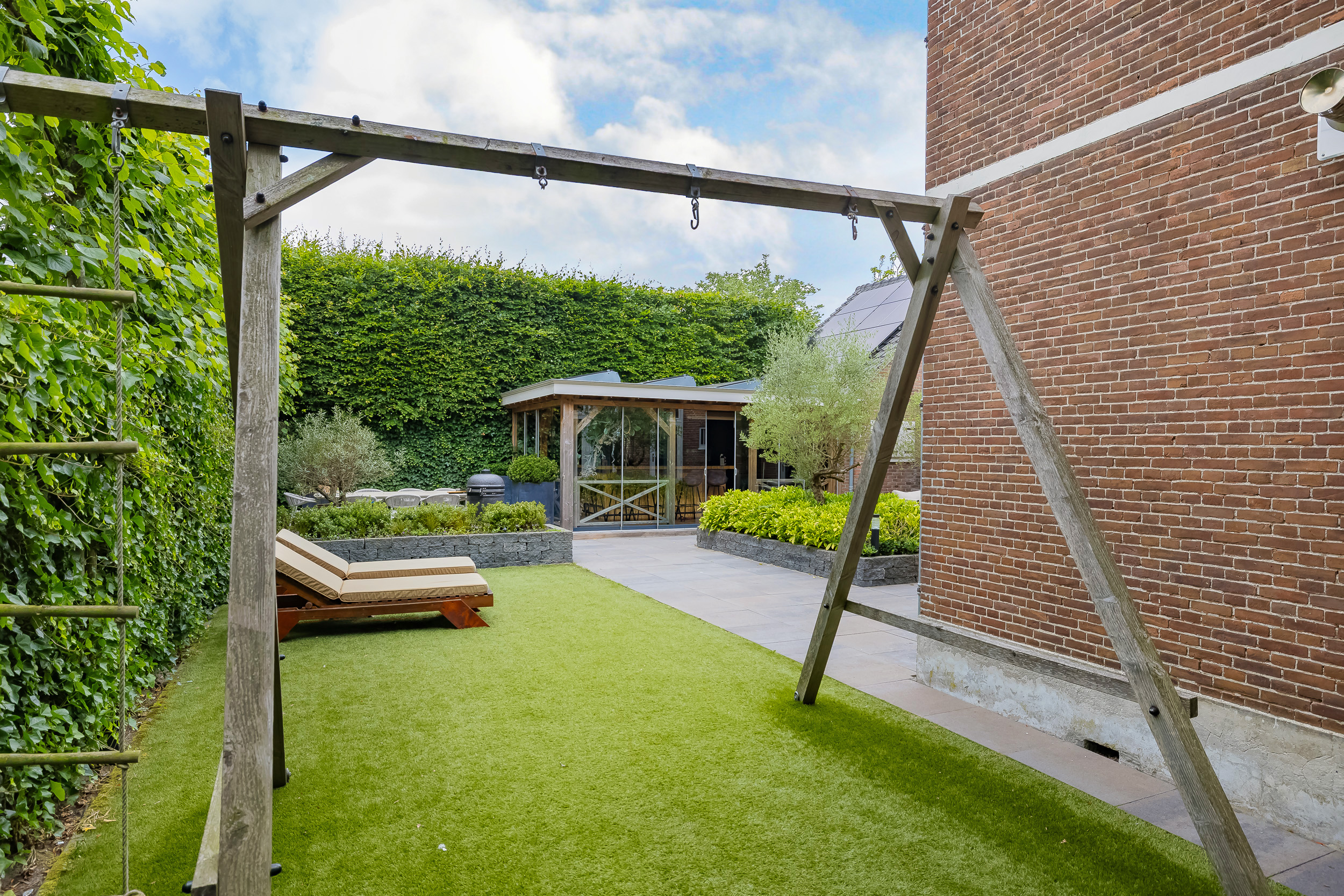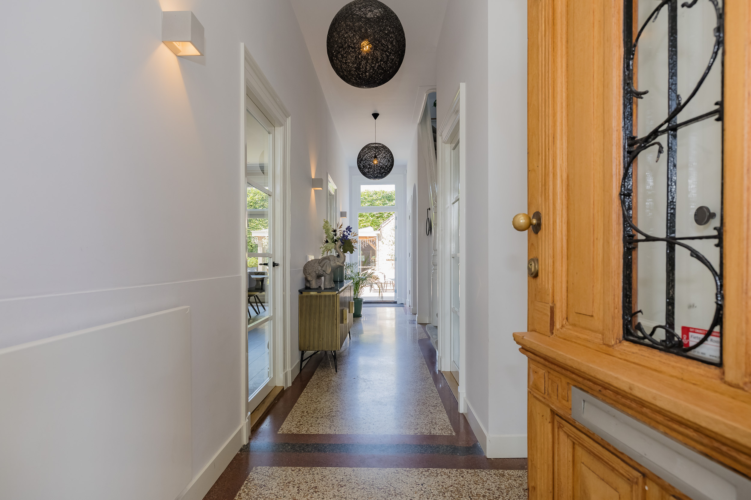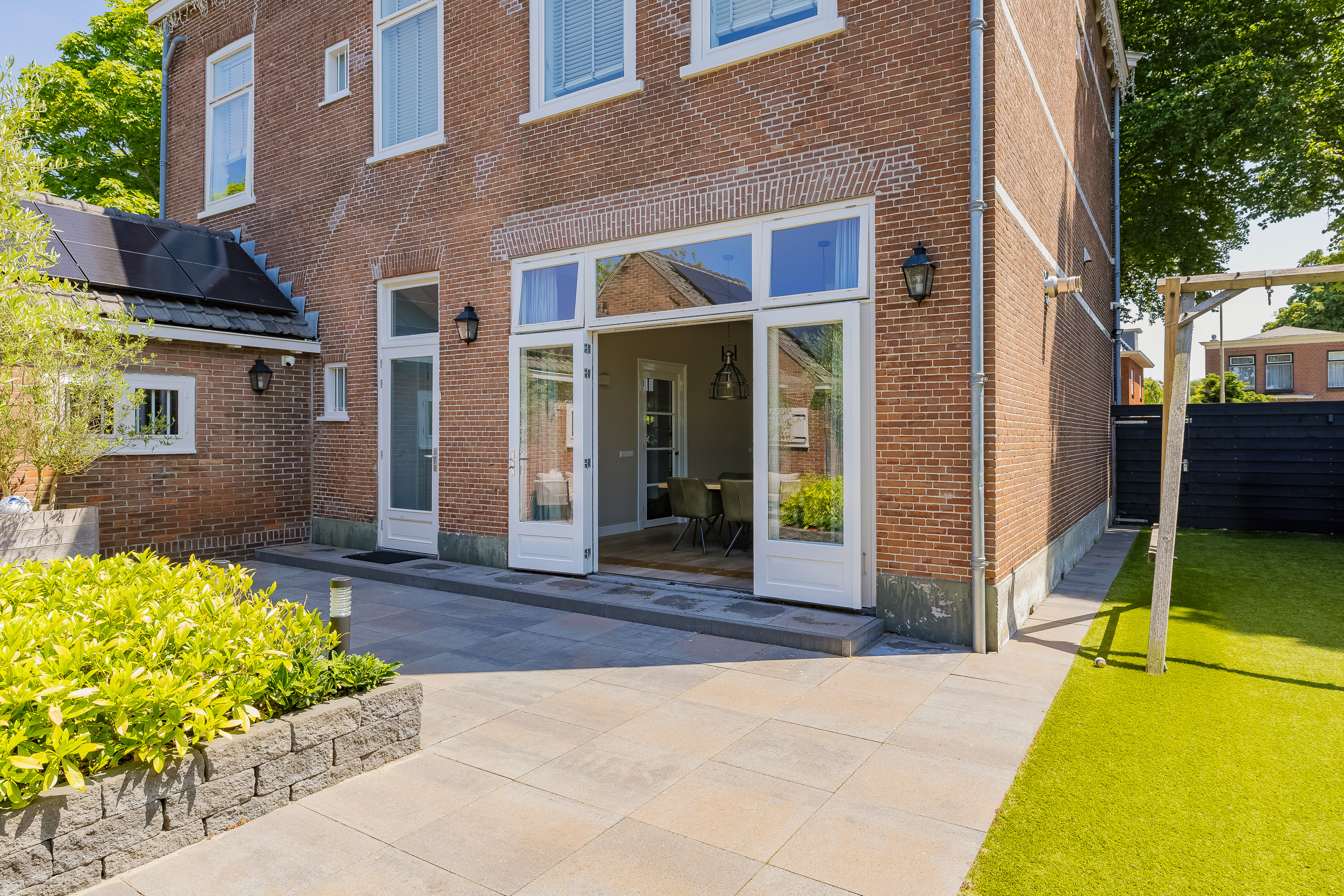 The beautifully landscaped garden surrounds the house and includes a new in authentic style wrought iron fence, lighting and irrigation. The very sunny backyard of 13 meters deep and 7.5 meters wide offers lots of privacy and is equipped with a large veranda where it is also good to stay in the colder months.