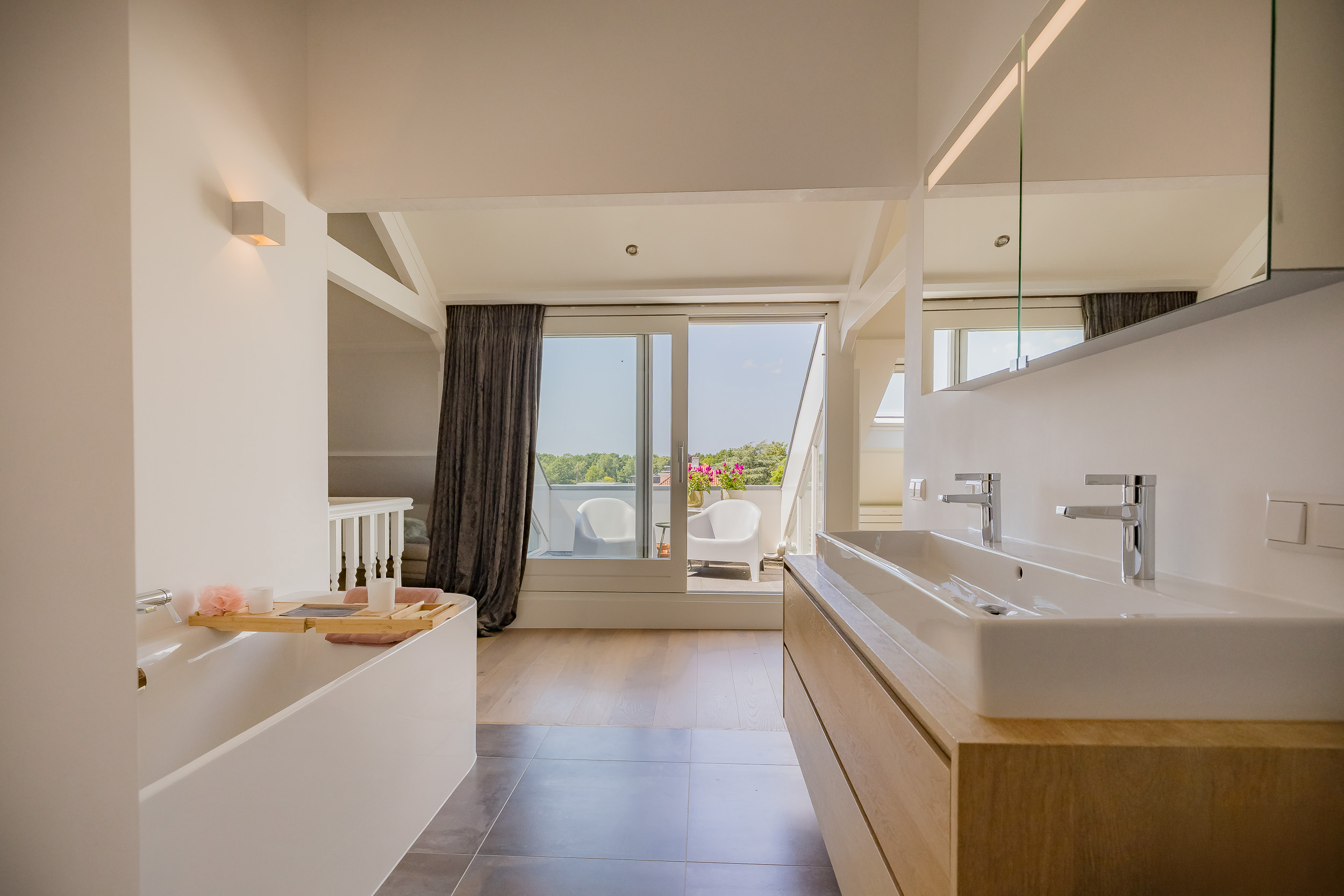 The master bedroom covers the entire floor and features a walled balcony/loggia facing west, walk-in wardrobe and a luxury bathroom with bathtub, walk-in shower, 3rd toilet and wide sink with two taps on wooden furniture.