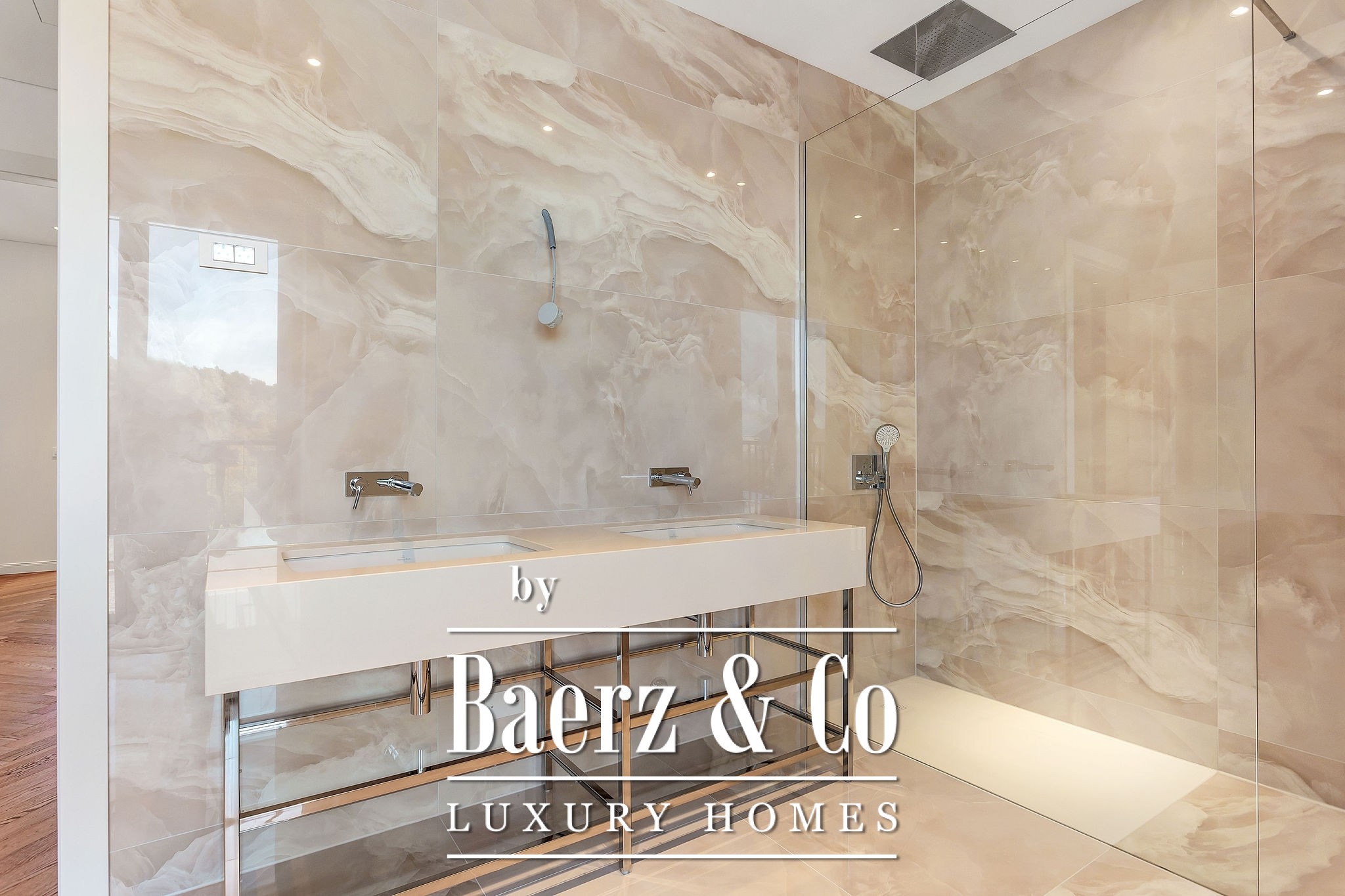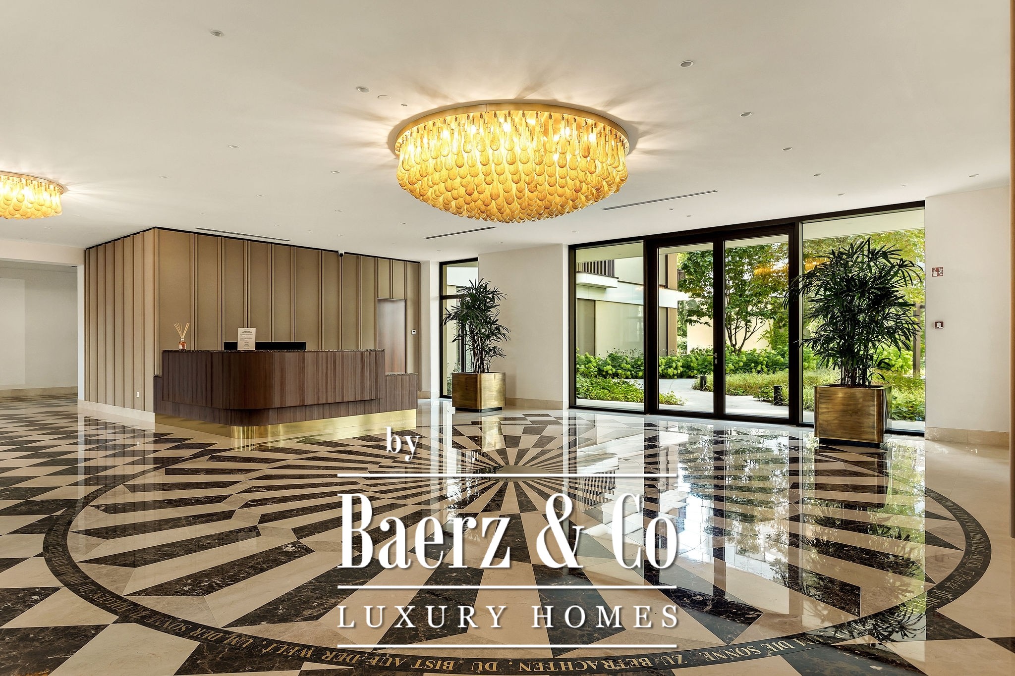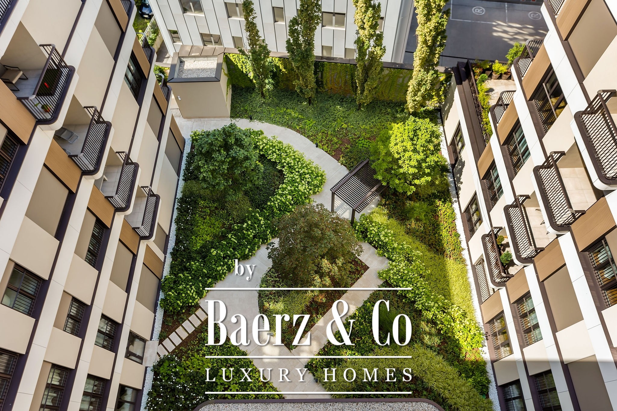 The apartment features elevated ceilings and floor-to-ceiling windows up to 230 cm. It is partially furnished with high-end furniture and Bosch appliances. Bathrooms and sanitary areas are equipped with premium fixtures and ready for immediate move-in.