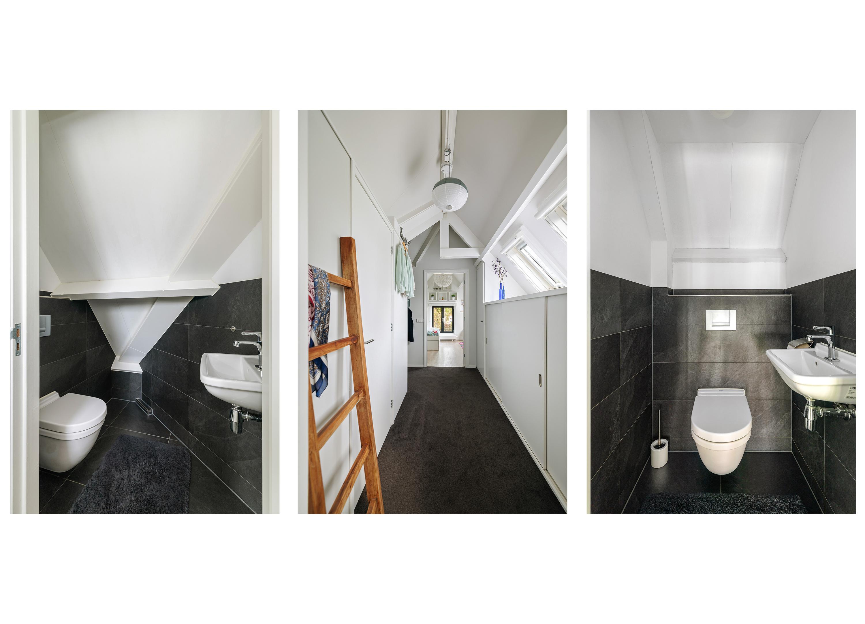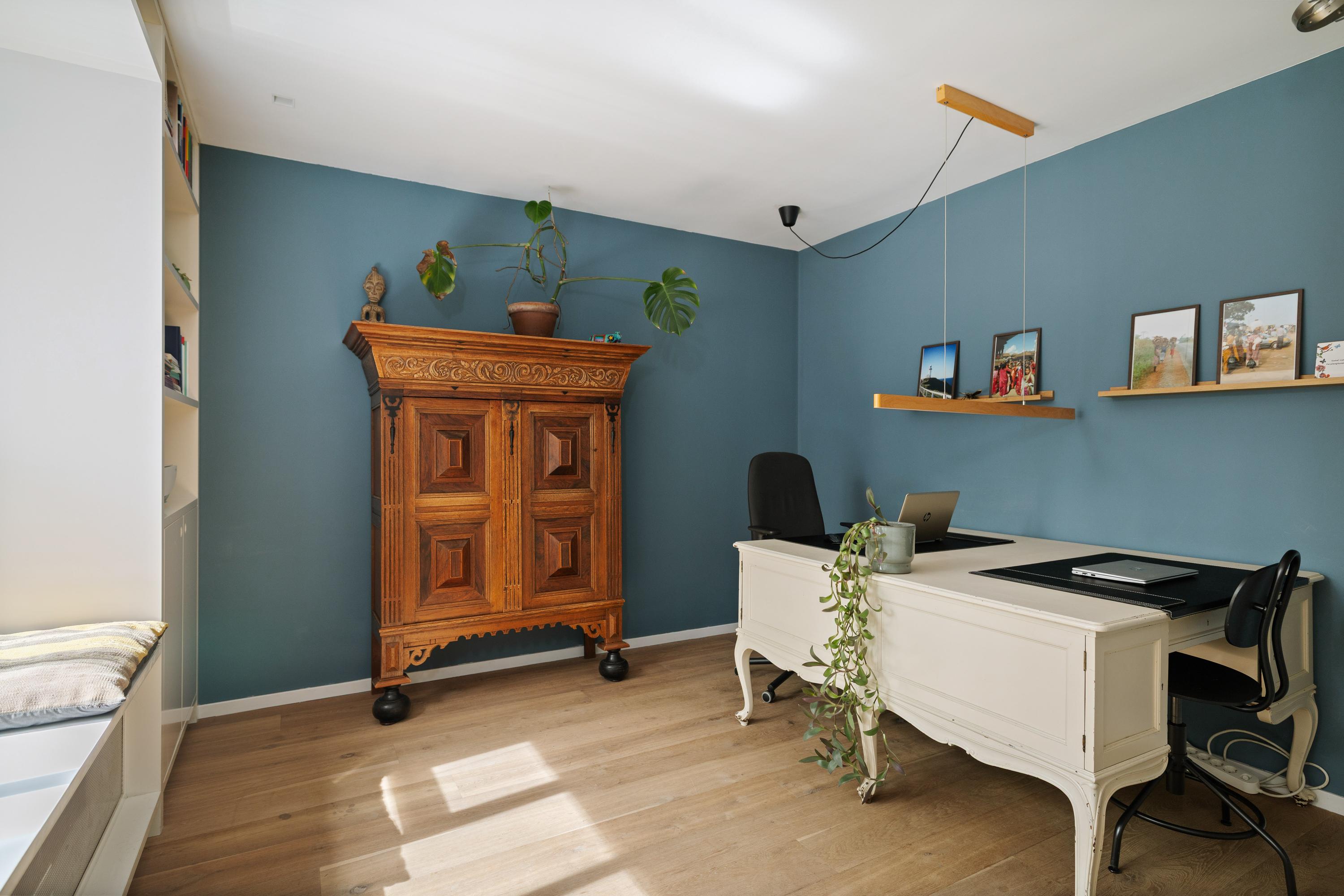 The sunny kitchen-diner (by Hans Croes Keukens en Interieurwerken) is located in the recent extension, designed by architect Ed Bergers (BVAB Architecten). Sleek, contemporary and filled with natural light, the kitchen features classic natural stone floor tiles with underfloor heating, creating a chic contrast with the oak cabinetry and light-coloured walls. The kitchen includes a central island with an anthracite composite worktop, a boiling-water tap, dishwasher and ample storage. Two bar stools make it an inviting place for a drink while cooking. The appliance wall contains a steam-assisted oven and combi microwave (both Miele), a large fridge and freezer, along with extensive cupboard space. Behind the kitchen is the second entrance, the so-called “back entrance”, with a hallway and four tall built-in cupboards.