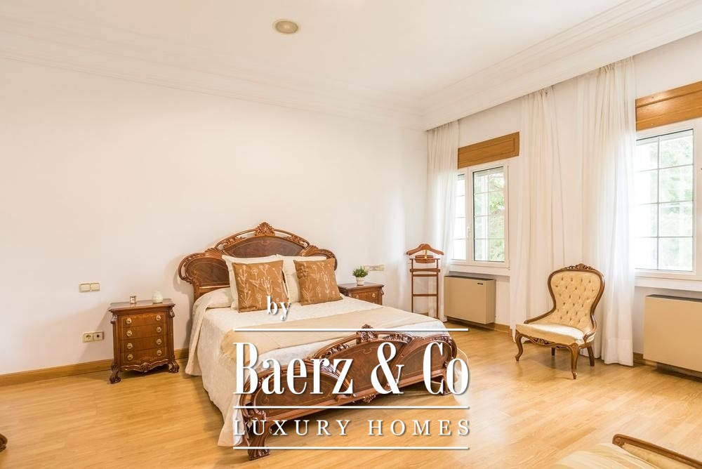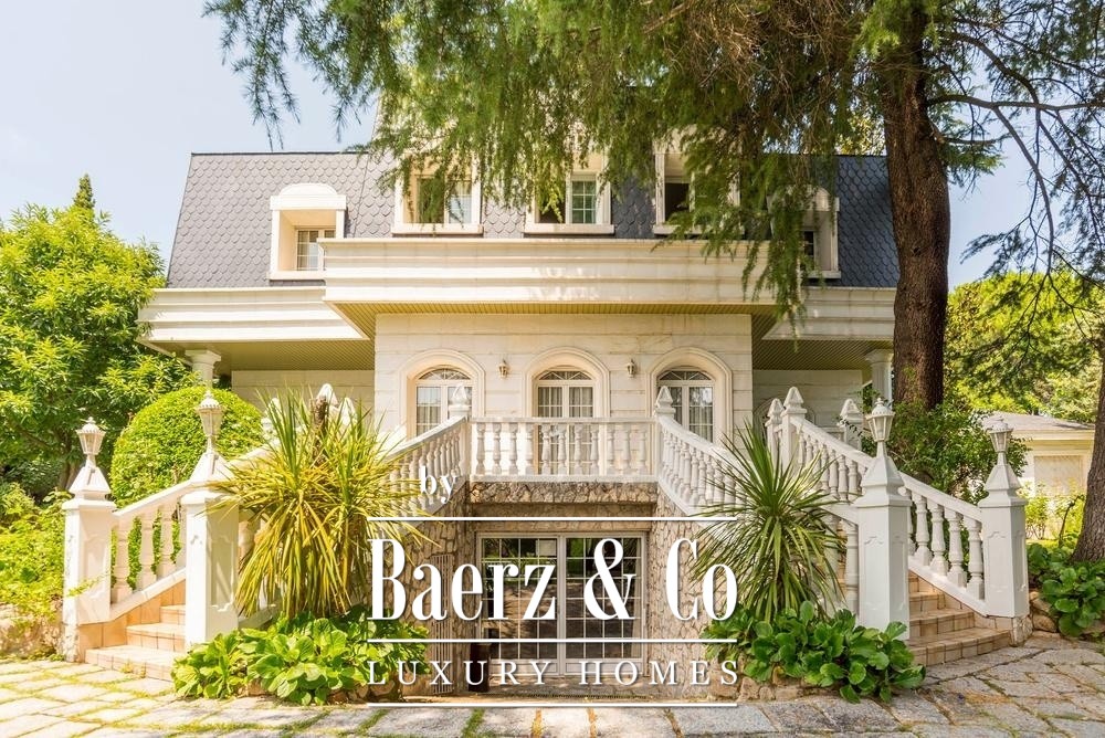 Outdoors, mature trees and layered gardens surround the large swimming pool and an expansive entertainment terrace appointed with a barbecue and wood-fired oven. Recreational enthusiasts will appreciate professional-grade tennis and fronton courts, while an independent guest apartment and extensive garage space provide further distinction. Security systems, climate control, and storage reinforce the villa’s readiness for both family living and high-value investment. This is a luxury villa for sale in Madrid where privacy, stature, and connectivity coalesce.