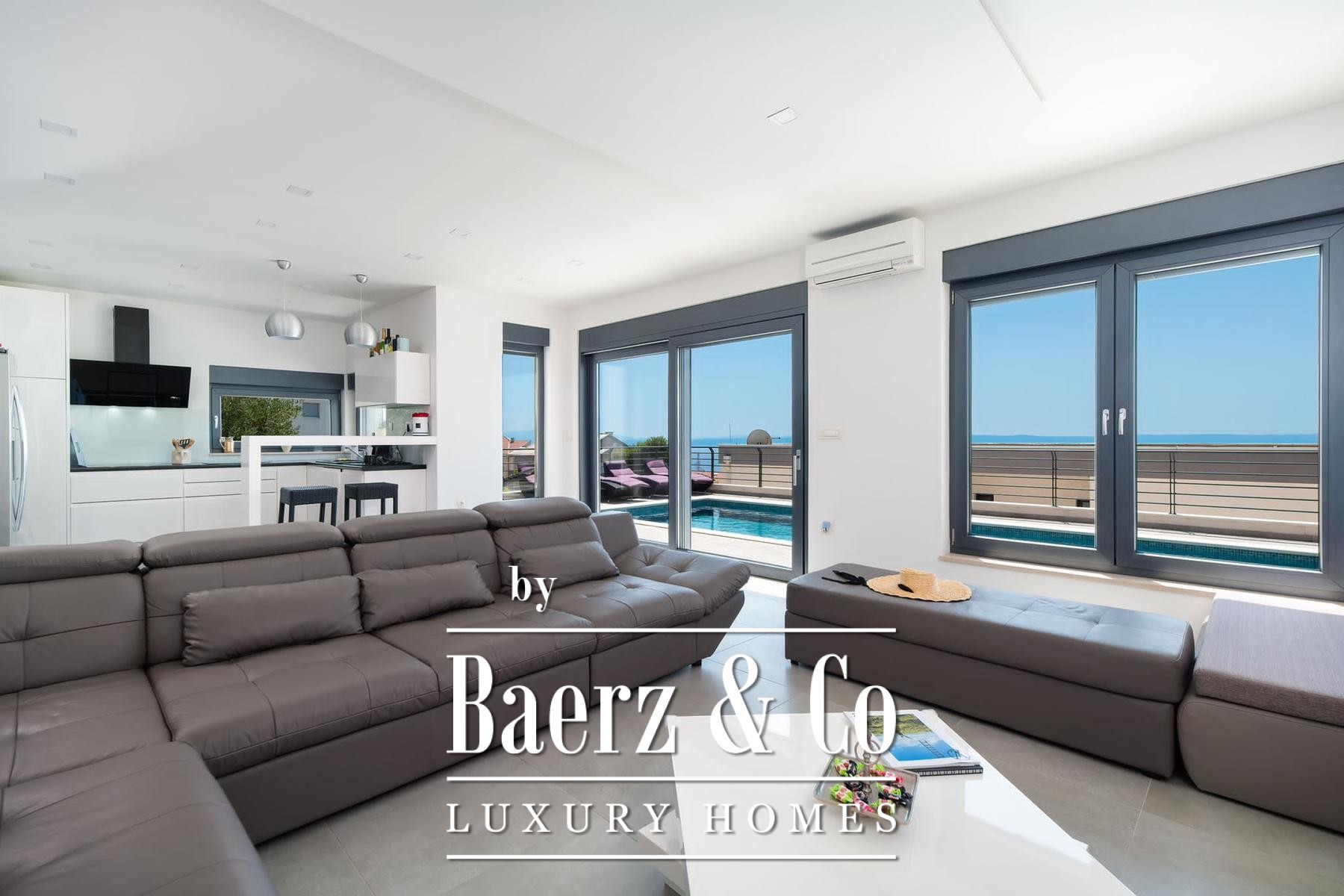 Villa Makarska occupies an elevated position, delivering panoramic views across the sea and the historic town below. This villa in Makarska stretches across 450 m² of living space, integrated into a 448 m² plot that articulates a clear connection between interior and exterior living. The south-facing orientation ensures constant natural light in every principal room, enriching daily life with views that shift from dawn to evening.