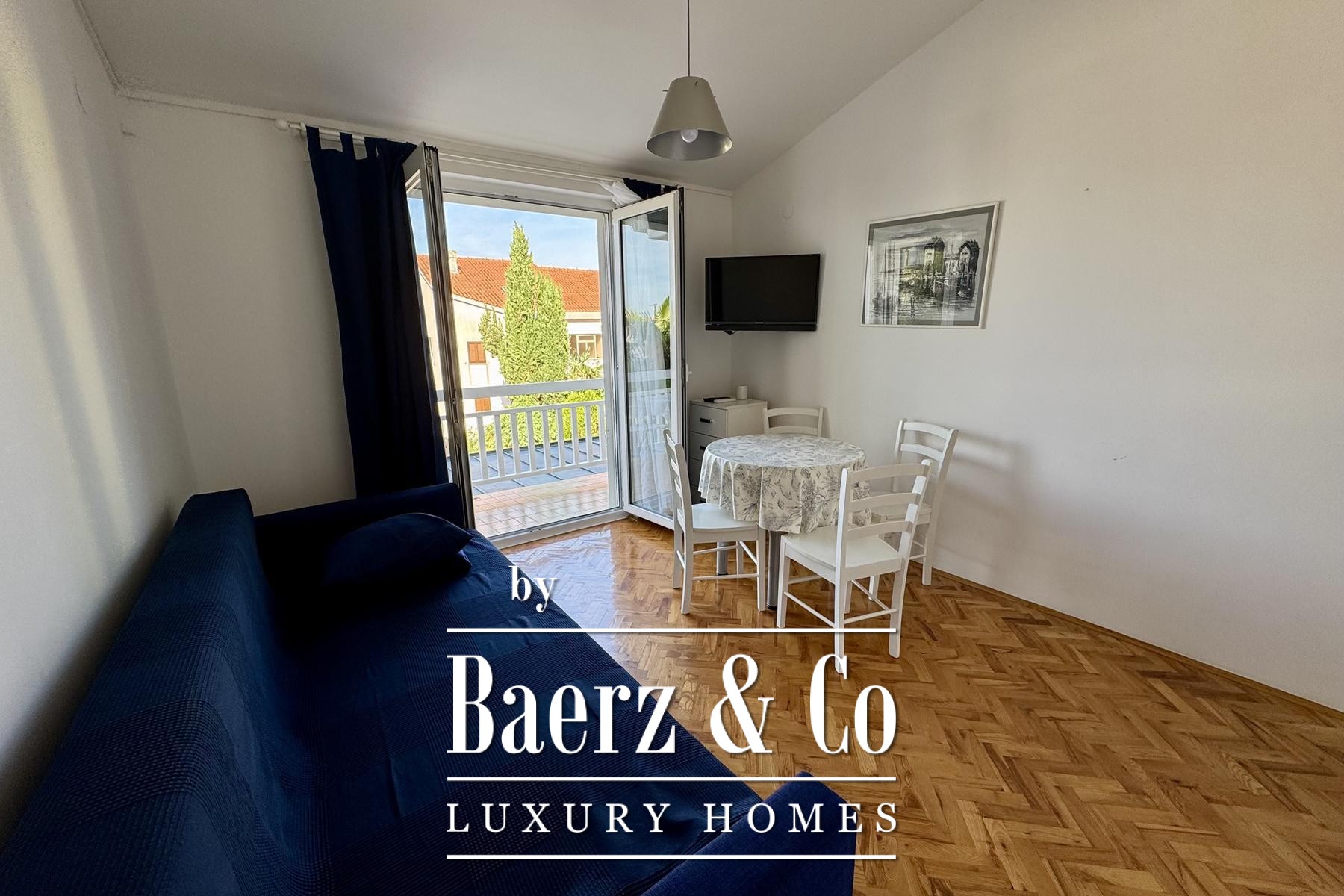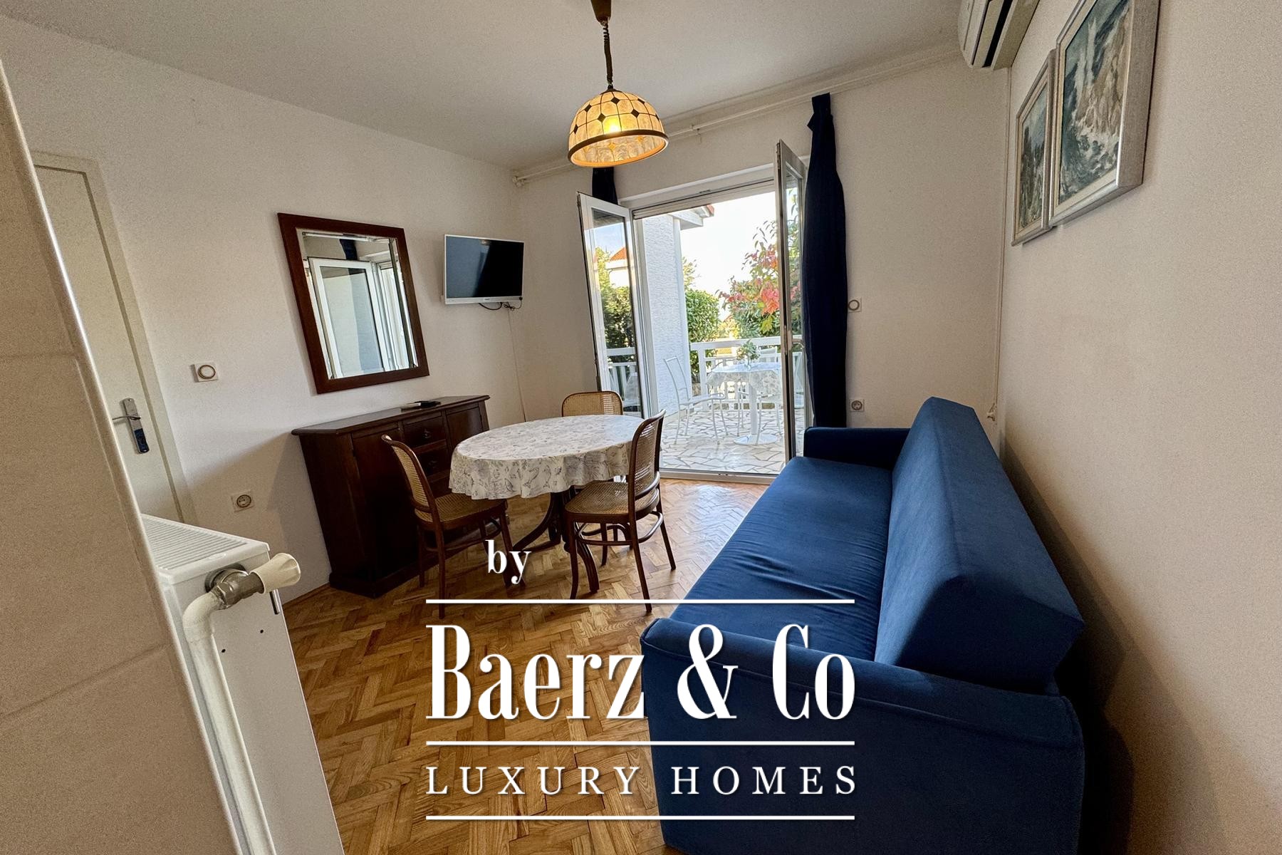 apartment consists of a bedroom, bathroom, kitchen, living room and terrace.Another additional apartment is located in the basement of the house and has two bedrooms, a kitchen, a bathroom and a storage room.There is also a garage in the yard of the house, and the garden itself is full of beautiful Mediterranean plants.Four more cars can be parked in the yard.For any additional information, feel free to contact us!
