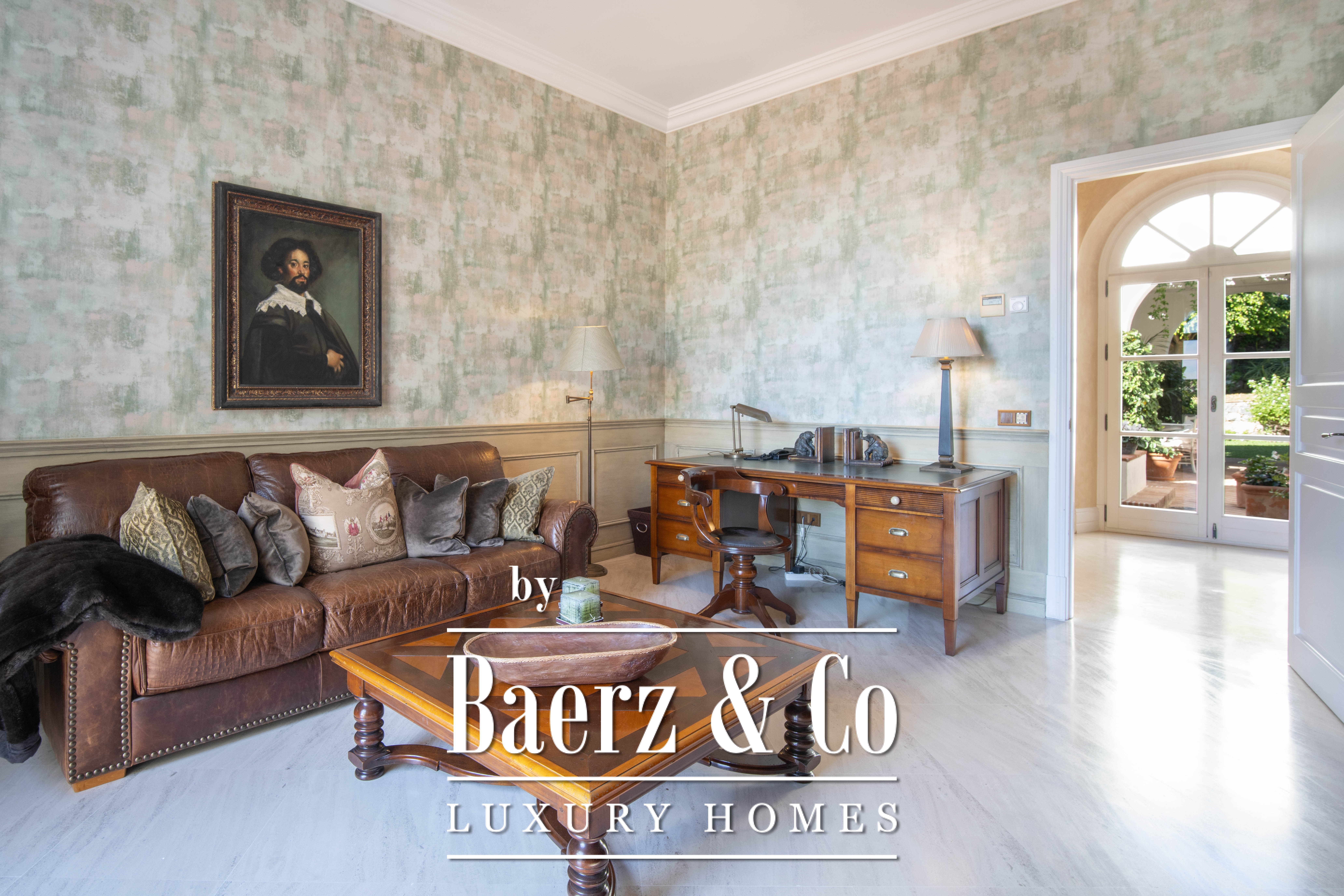 The residence comprises five spacious bedrooms and five bathrooms, complemented by two additional guest toilets. The interior is meticulously designed, featuring a fully furnished layout with porcelain floors and a fully fitted kitchen. The main living spaces include a welcoming living room with a fireplace, a formal dining room, a guest room, and a dedicated office room. The villa also benefits from a guest apartment, providing privacy and comfort for visitors.