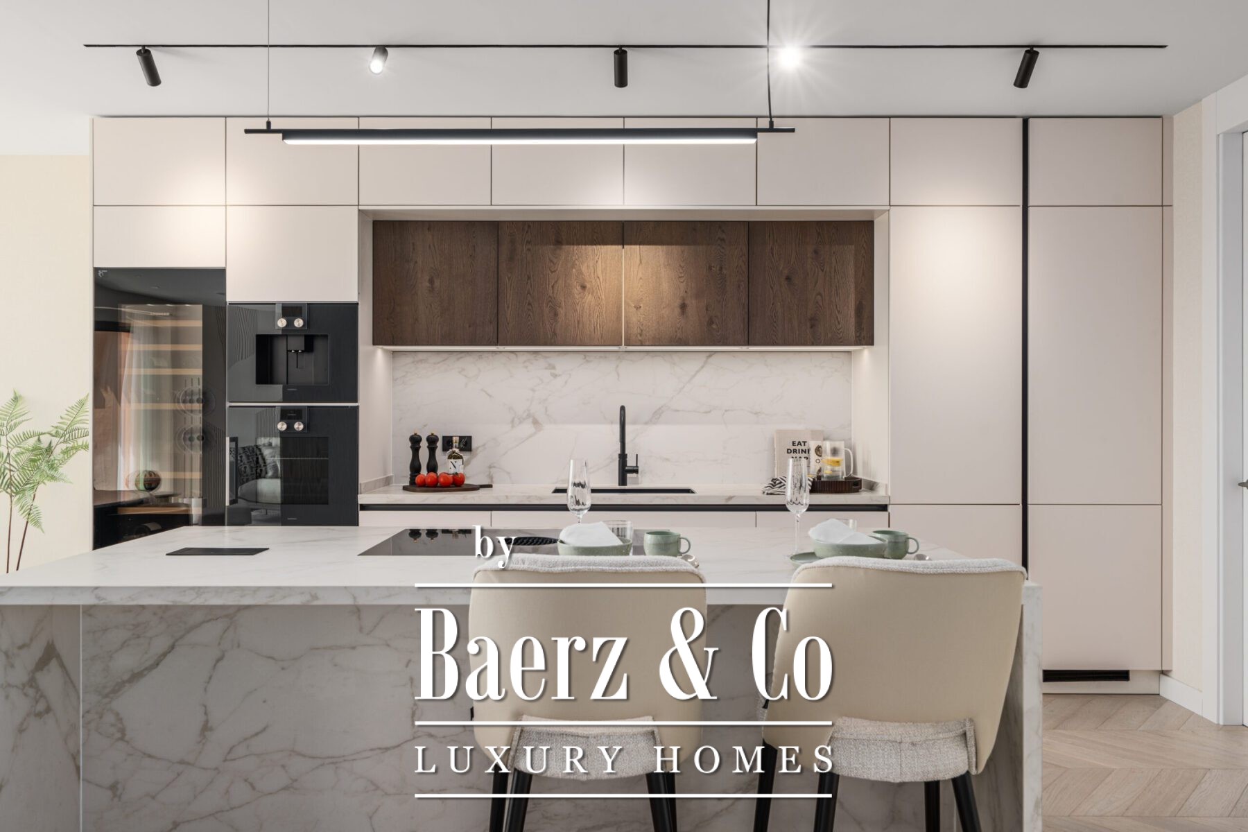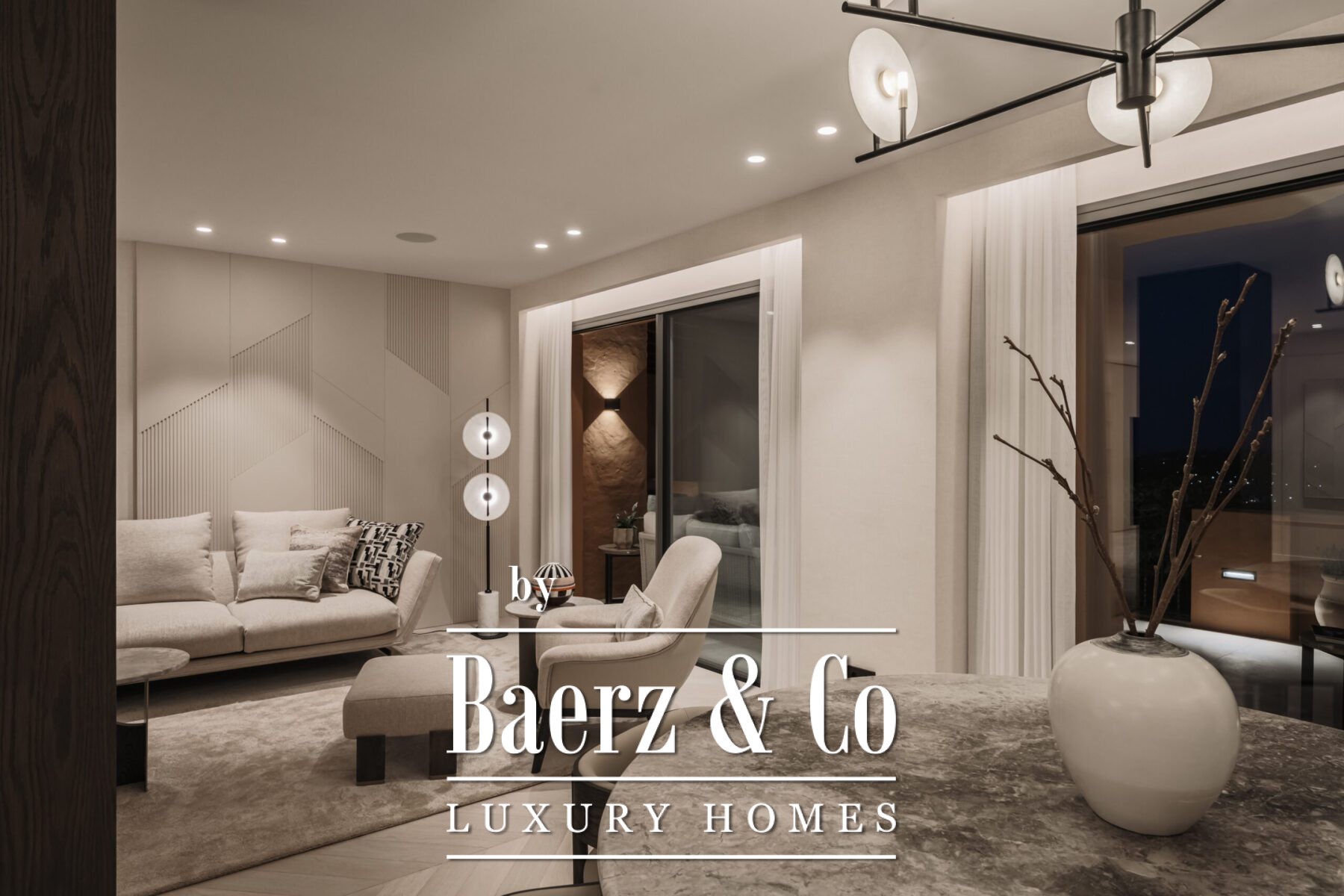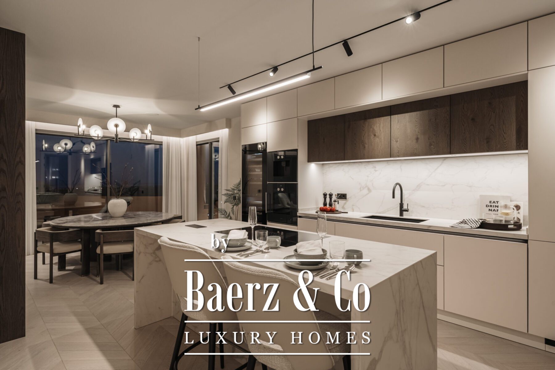 The apartment features an open-concept living and dining area with floor-to-ceiling windows that flood the space with natural light and create a seamless transition to the expansive outdoor terrace. The kitchen is equipped with state-of-the-art Gaggenau appliances, natural oak floors add warmth and character, and a smart home system allows for effortless control of lighting, temperature, and more.