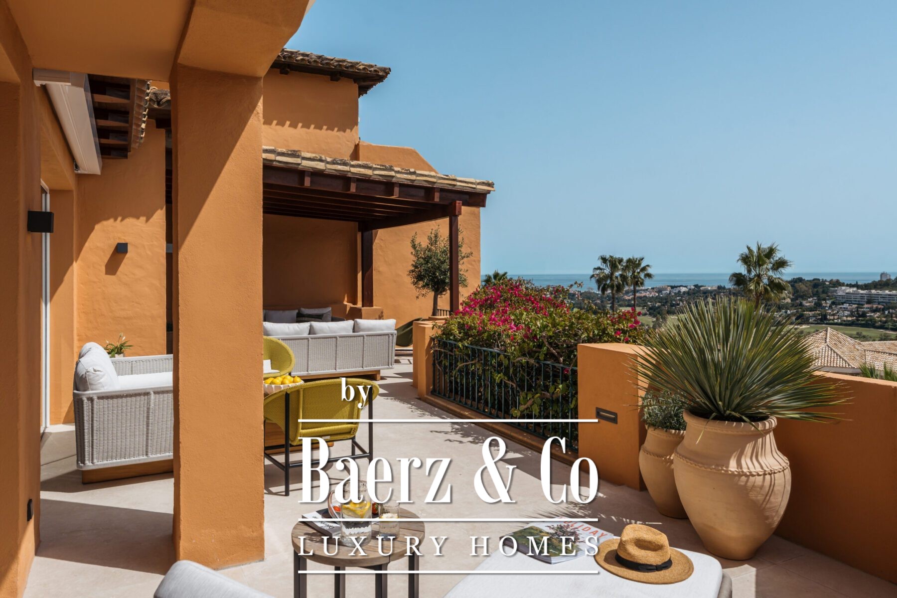 Apartment Marbella presents a rare vantage point above the prestigious streets of La Cerquilla, Nueva Andalucía. This fully renovated ground floor residence spans 215 m² and offers panoramic views of the Mediterranean Sea, the mountains, and famed golf courses, establishing a sense of harmony between sophisticated interior design and the surrounding landscape.