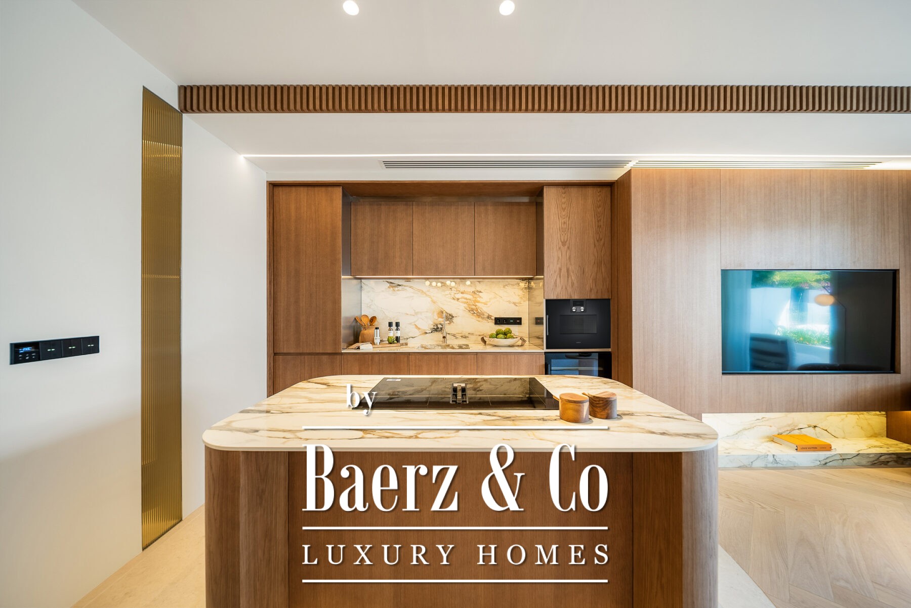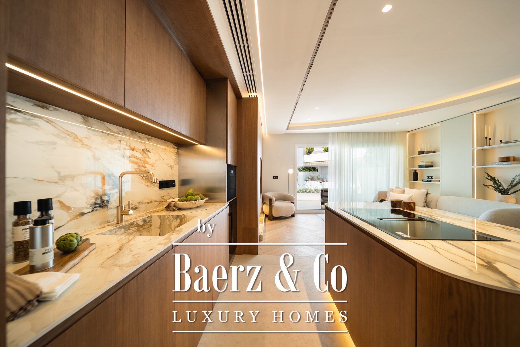 Apartment Marbella Golden Mile Panoramic Sea Views defines an address for those who value location, design, and ease. This three-bedroom apartment offers 110 m² of carefully renovated interiors and a 20 m² terrace, opening to panoramic sea vistas. The main living spaces are shaped for calm and comfort, defined by BOEN herringbone wood floors, Gaggenau and Siemens appliances, and smart home automation. Bathrooms feature Dornbracht fixtures, underscoring a consistent investment in quality.