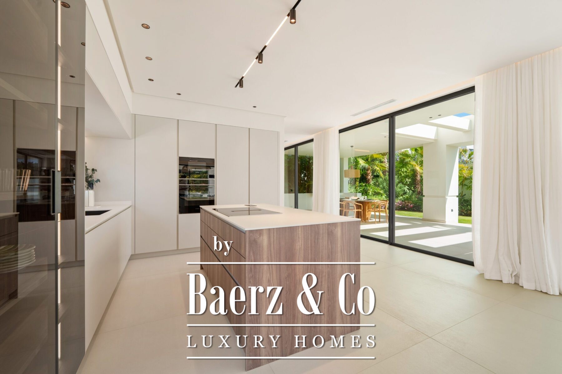 The atmosphere inside is luminous and poised, defined by soft neutral hues, recessed lighting, and generous floor-to-ceiling windows that invite the Andalusian light. The open-plan living and dining zone, anchored by a bespoke entertainment wall and contemporary fixtures, flows seamlessly into a state-of-the-art kitchen where a wood island and integrated appliances meet sleek cabinetry. This fluid spatial experience extends to a dining area meant for meaningful gatherings.