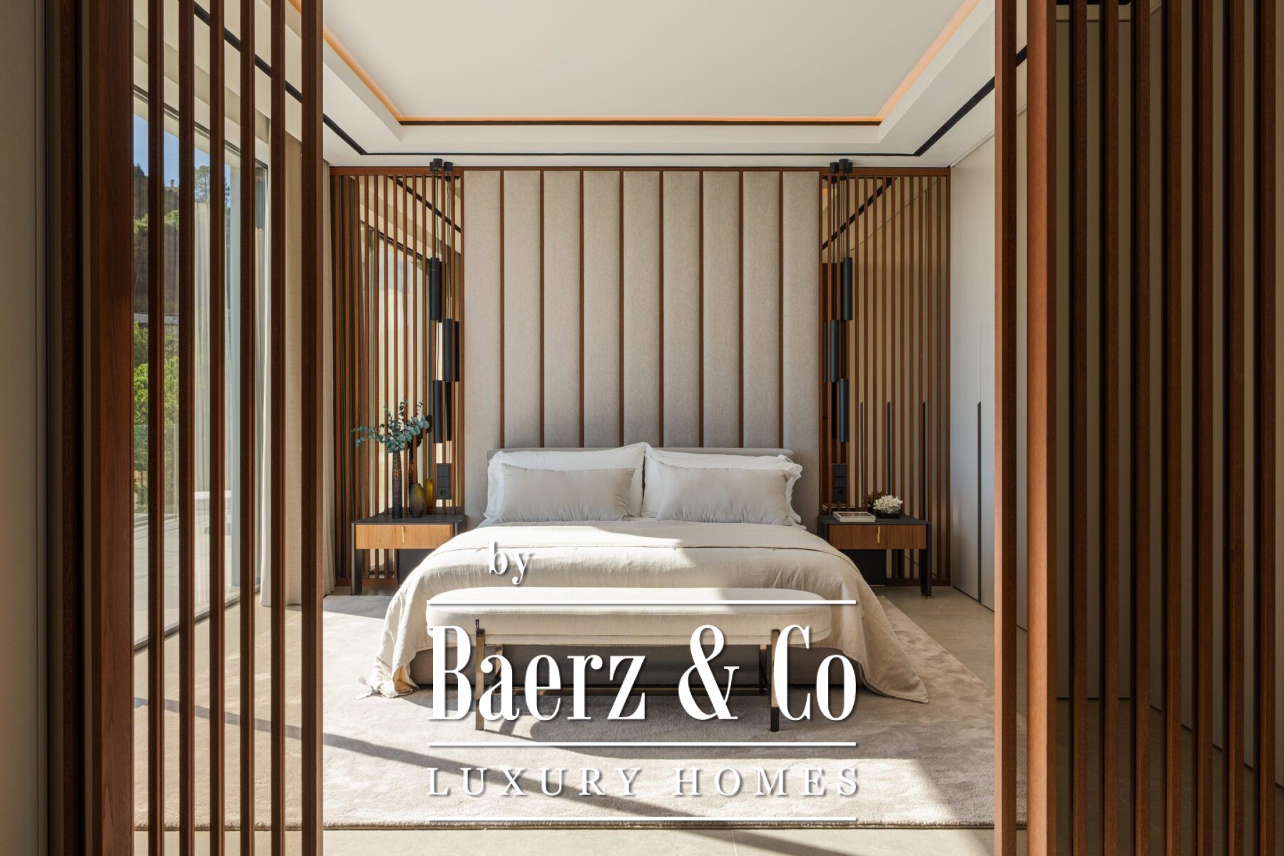 Inside, the property showcases six bedrooms and seven bathrooms, unified by exclusive furniture and natural, refined materials. Interiors are shaped by symmetry and a seamless transition from indoors to out. Large sliding panels and generous windows invite light and landscape into the living spaces, while integrated lighting and curated textures create an atmosphere of tailored sophistication.