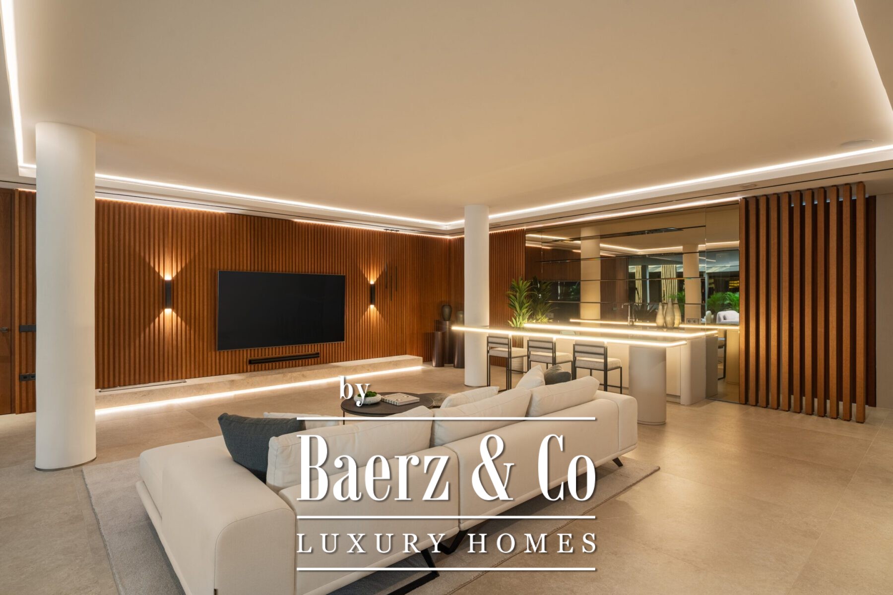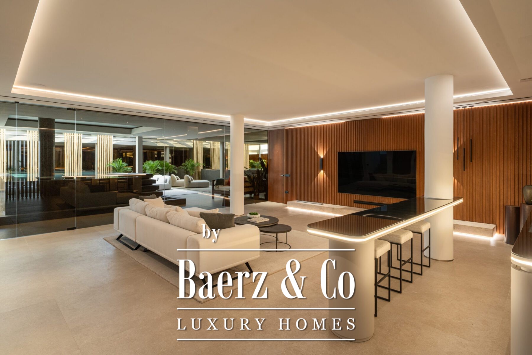 Wellness and recreation unfold on the lower level, where a custom entertainment room, bar, private gym, spa with indoor pool, and sauna complete the experience. Secure garage parking with an electric charging port further elevates the sense of ease. This frontline golf villa Marbella stands as a benchmark for understated luxury, design, and privacy on the Costa del Sol.
