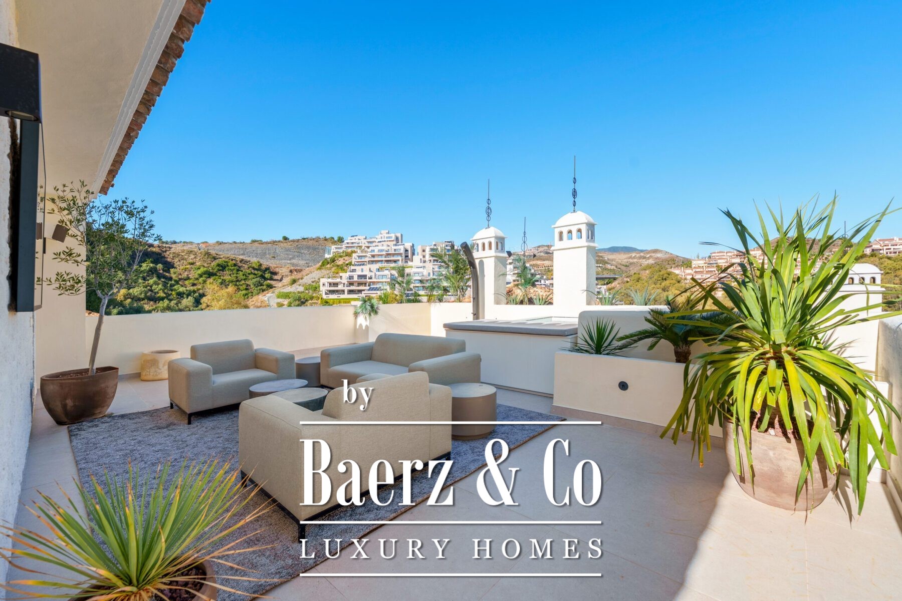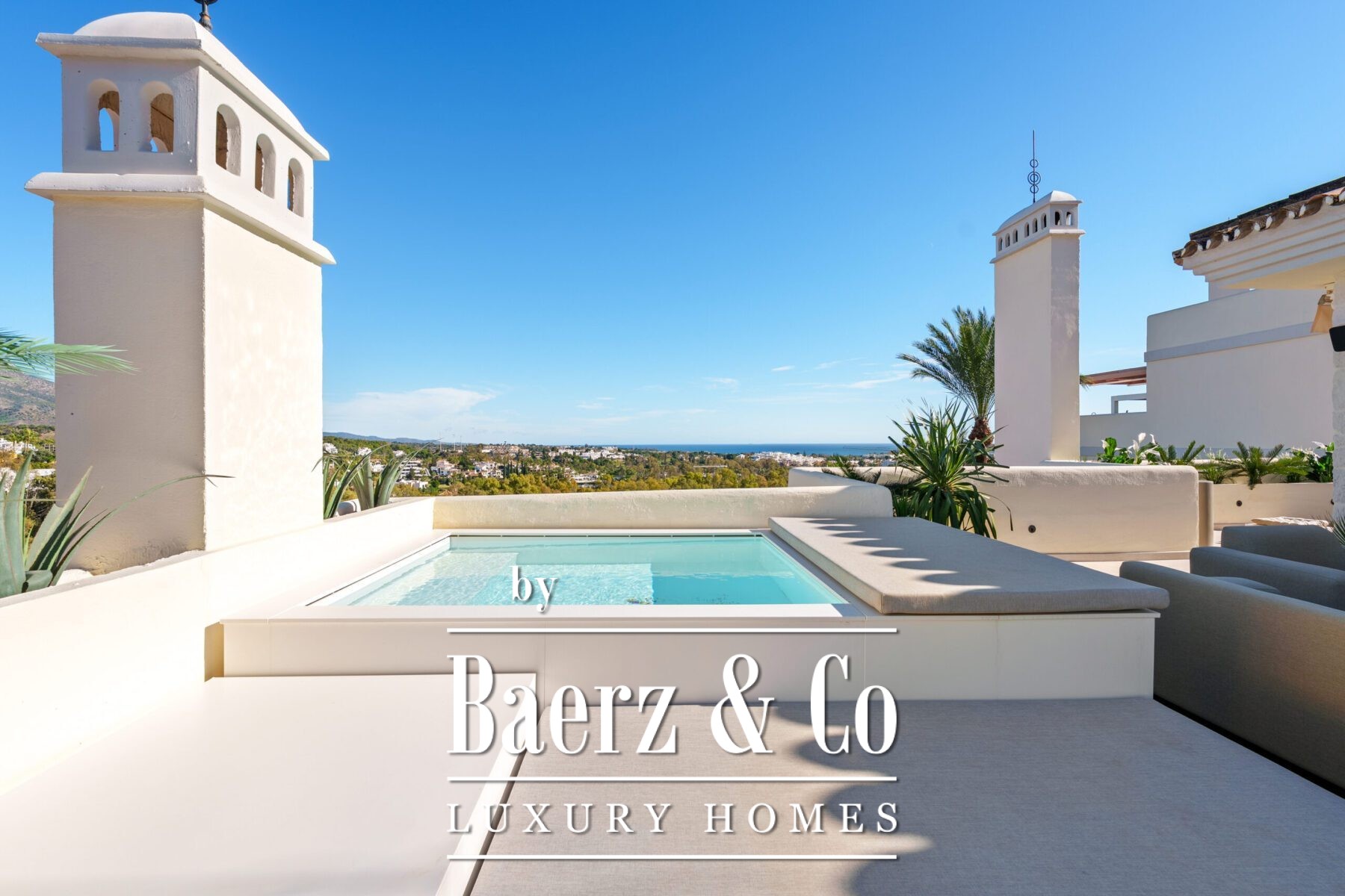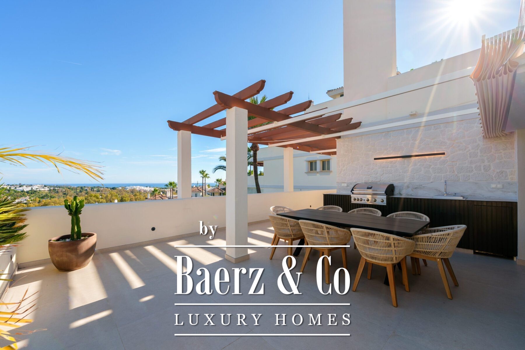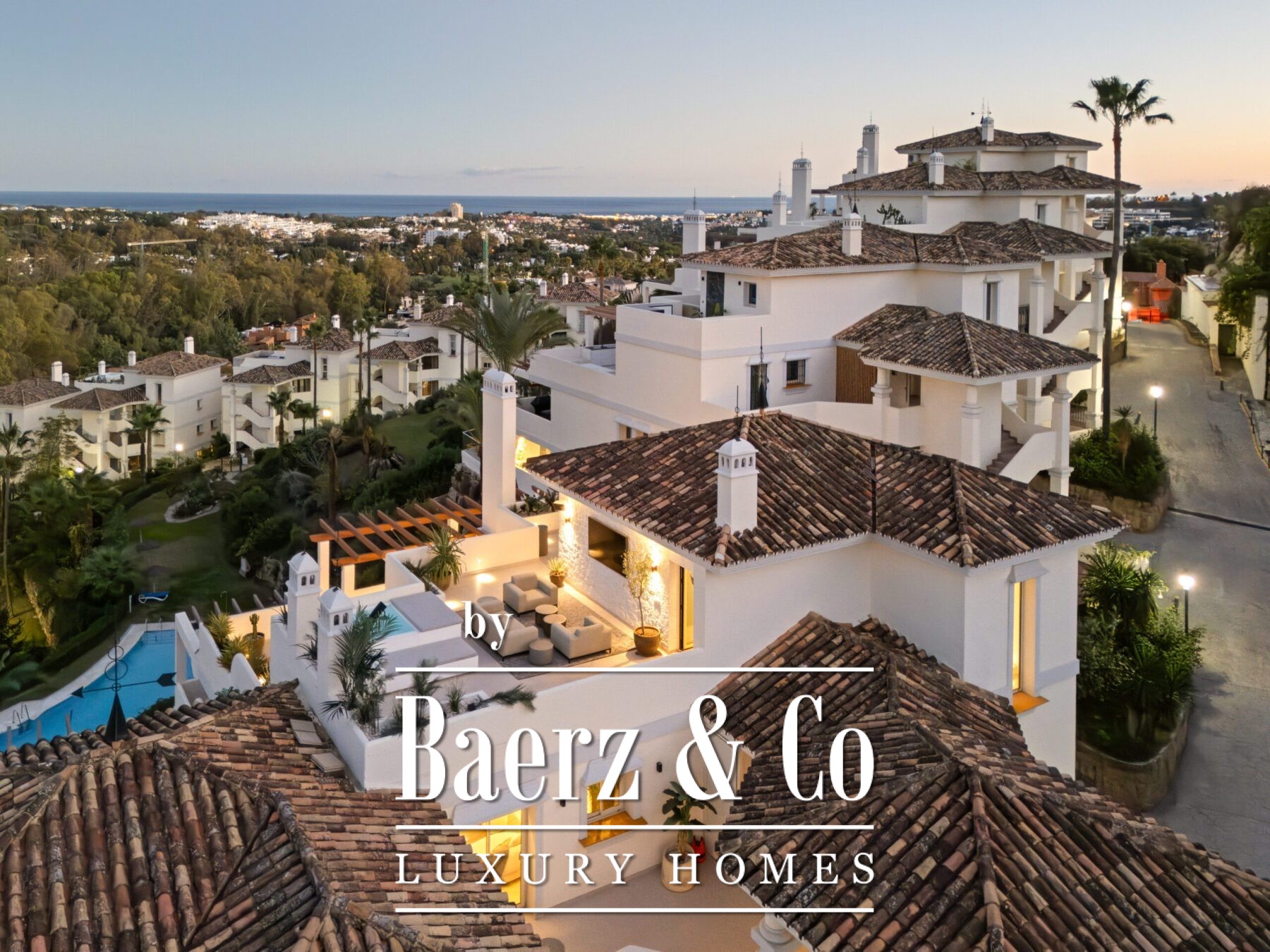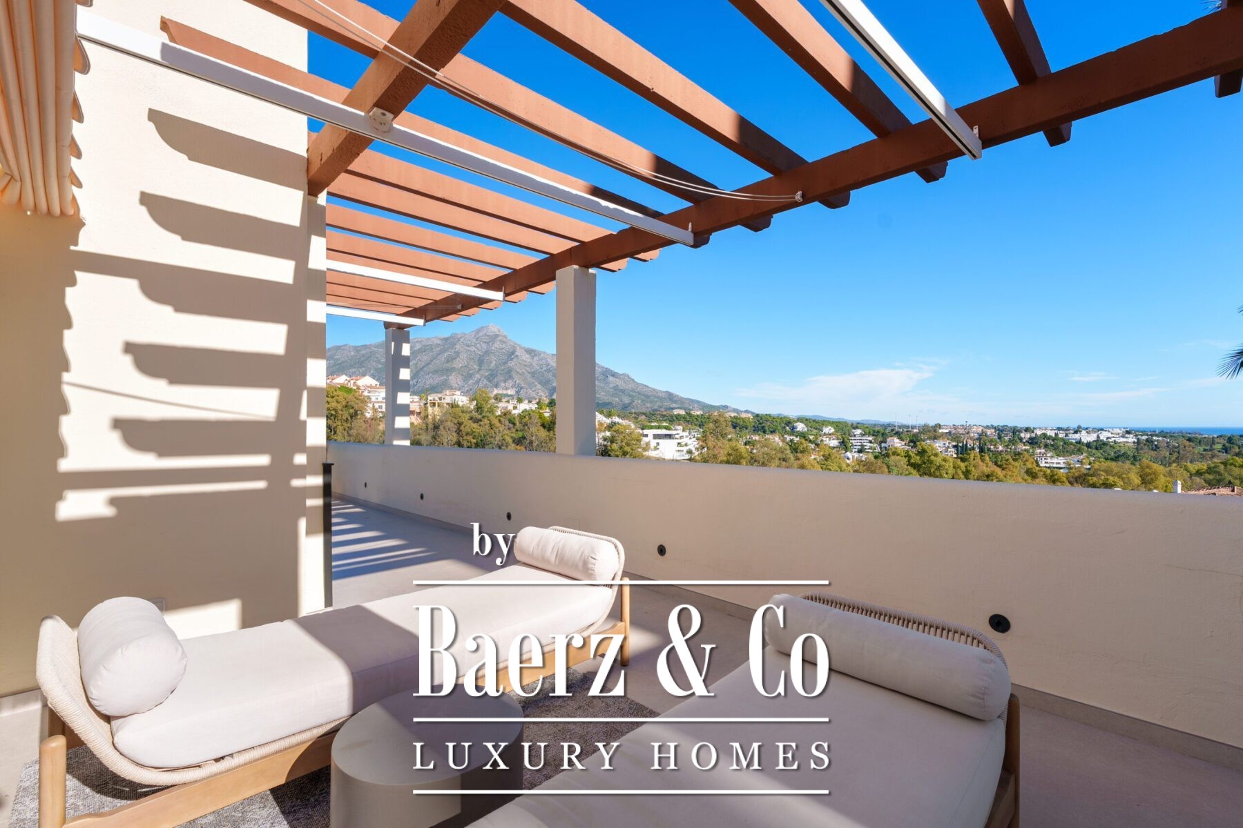 Duplex penthouse Nueva Andalucia Marbella Spain defines a sophisticated balance between contemporary design and warm Scandinavian sensibility. Recently renovated, this 183m² residence features expansive 181m² terraces, seamlessly connecting interior and exterior living. Three generously proportioned bedrooms each include an en-suite bathroom, complemented by underfloor heating for understated comfort. The open-plan living area extends onto a private terrace, where panoramic views stretch across sea, mountains, and lake.