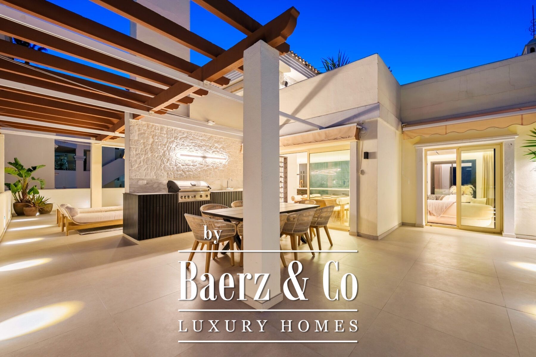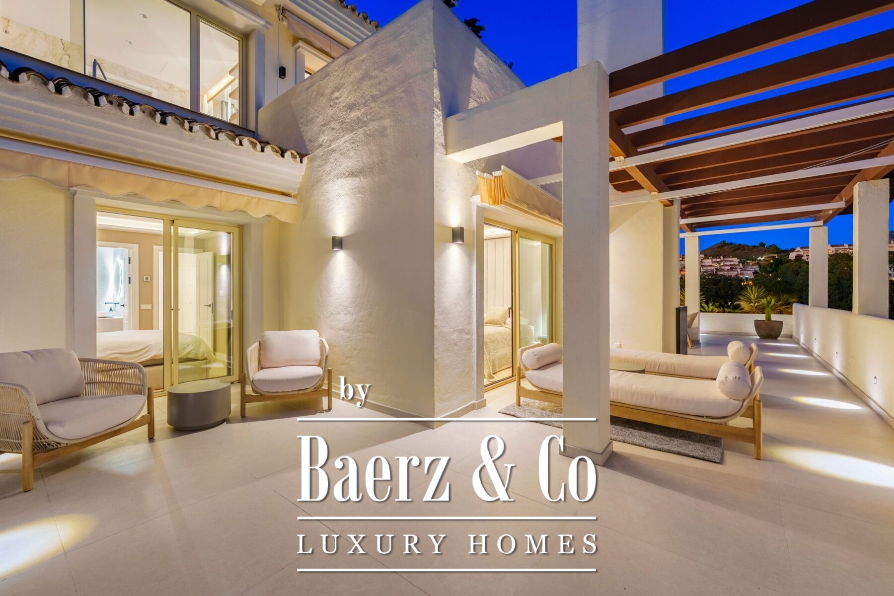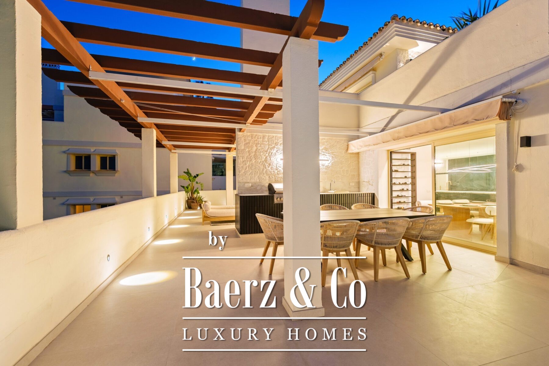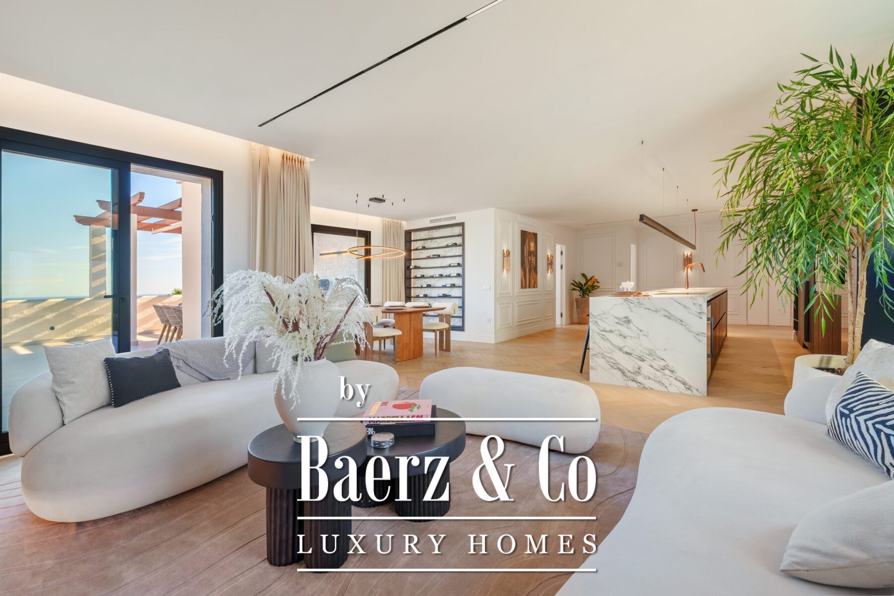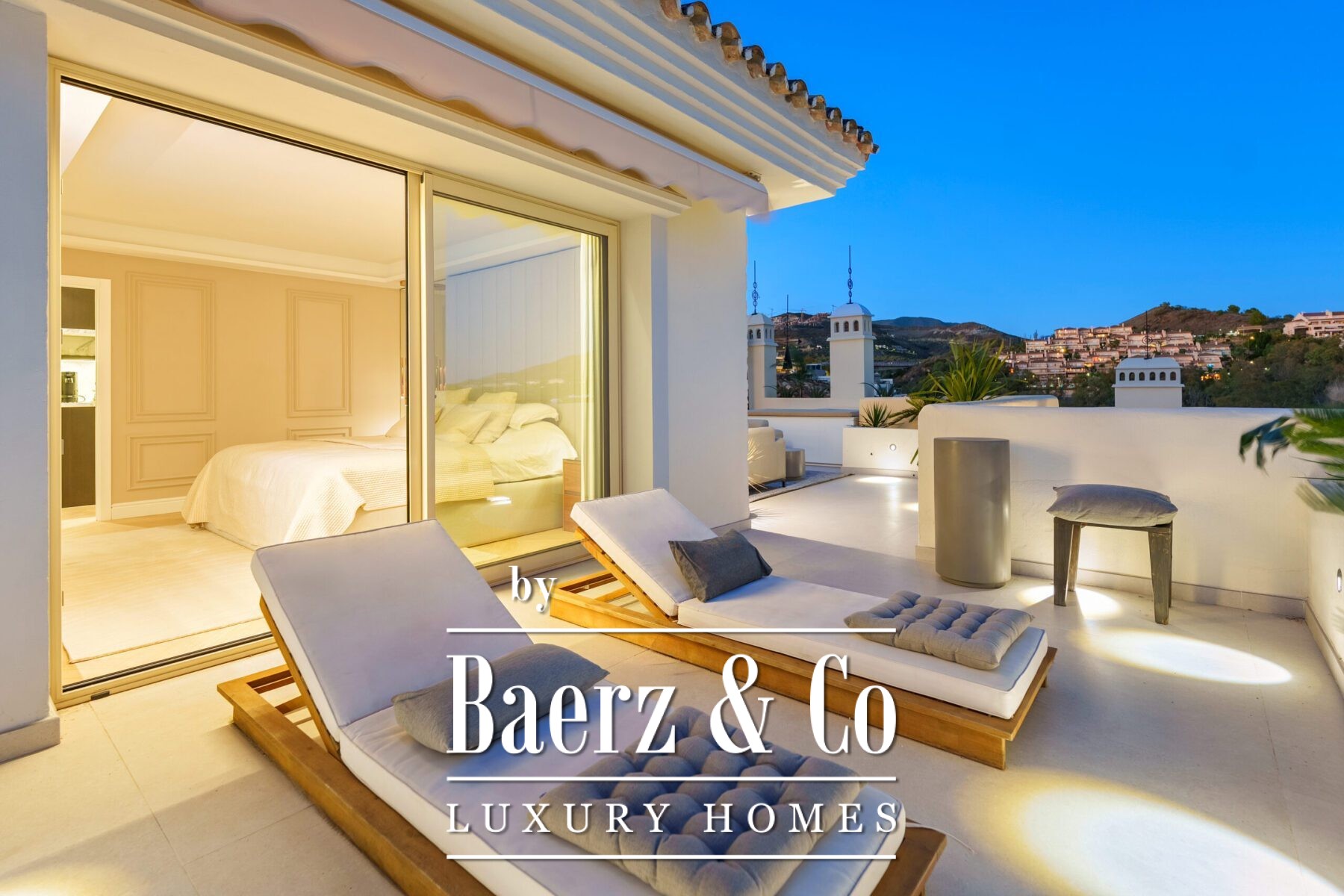 Duplex penthouse Nueva Andalucia Marbella Spain defines a sophisticated balance between contemporary design and warm Scandinavian sensibility. Recently renovated, this 183m² residence features expansive 181m² terraces, seamlessly connecting interior and exterior living. Three generously proportioned bedrooms each include an en-suite bathroom, complemented by underfloor heating for understated comfort. The open-plan living area extends onto a private terrace, where panoramic views stretch across sea, mountains, and lake.