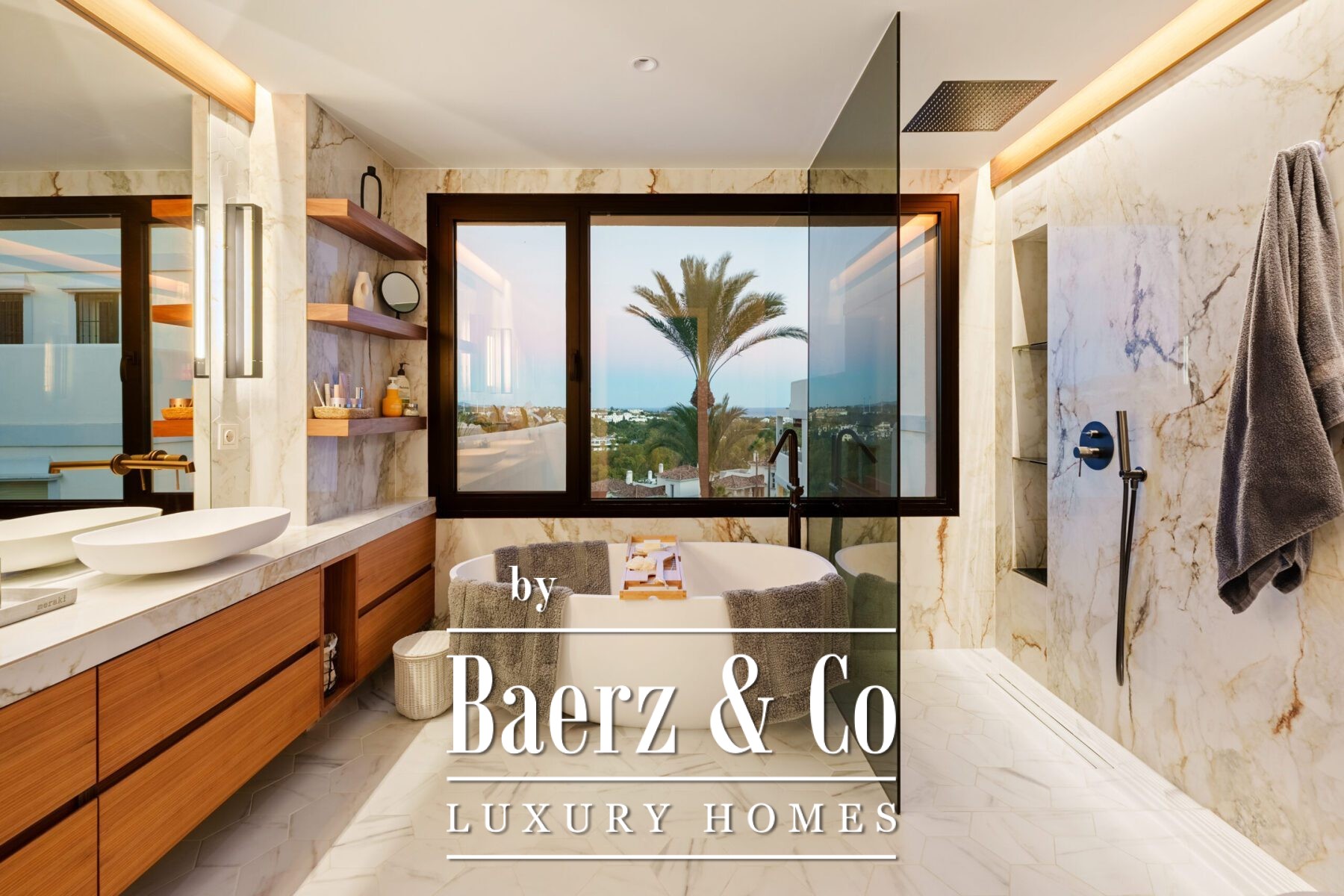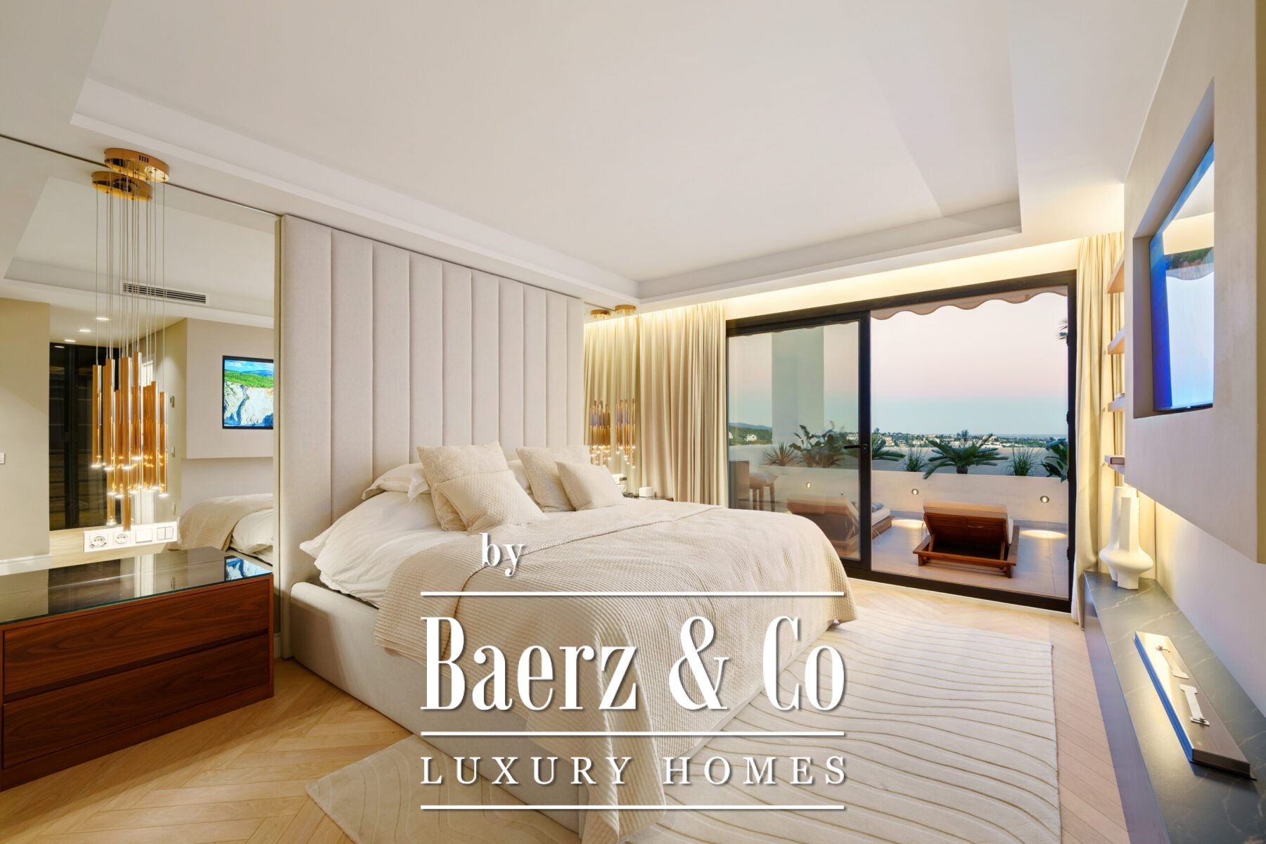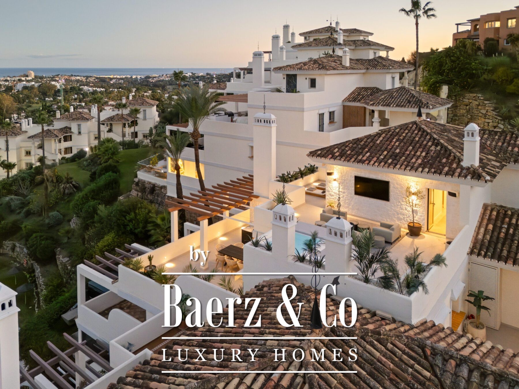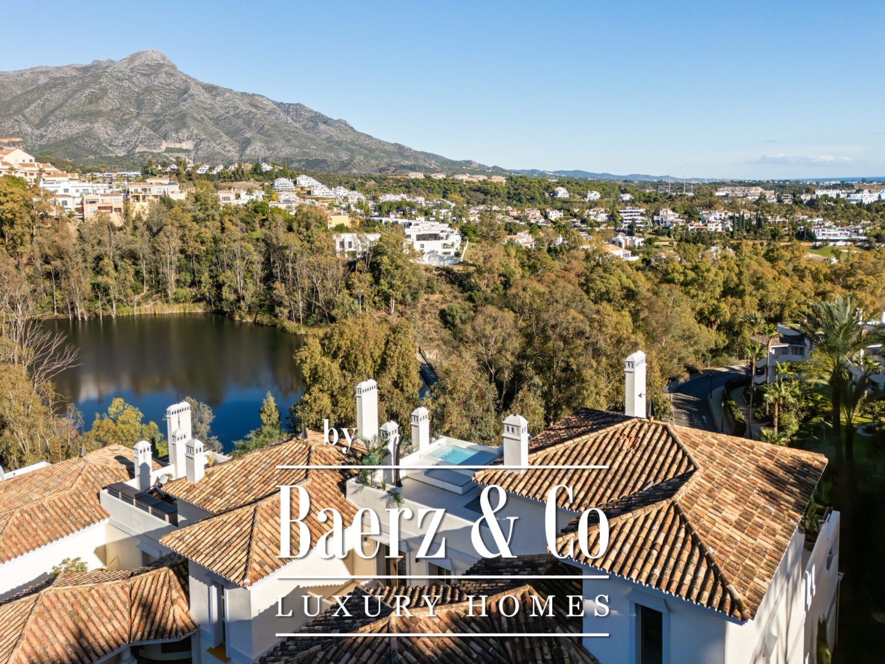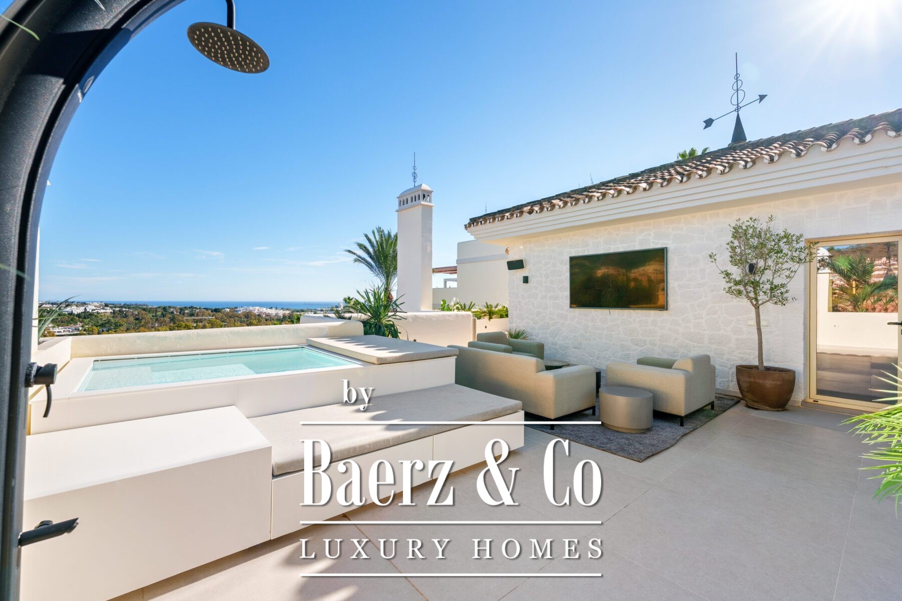 Duplex penthouse Nueva Andalucia Marbella Spain defines a sophisticated balance between contemporary design and warm Scandinavian sensibility. Recently renovated, this 183m² residence features expansive 181m² terraces, seamlessly connecting interior and exterior living. Three generously proportioned bedrooms each include an en-suite bathroom, complemented by underfloor heating for understated comfort. The open-plan living area extends onto a private terrace, where panoramic views stretch across sea, mountains, and lake.
