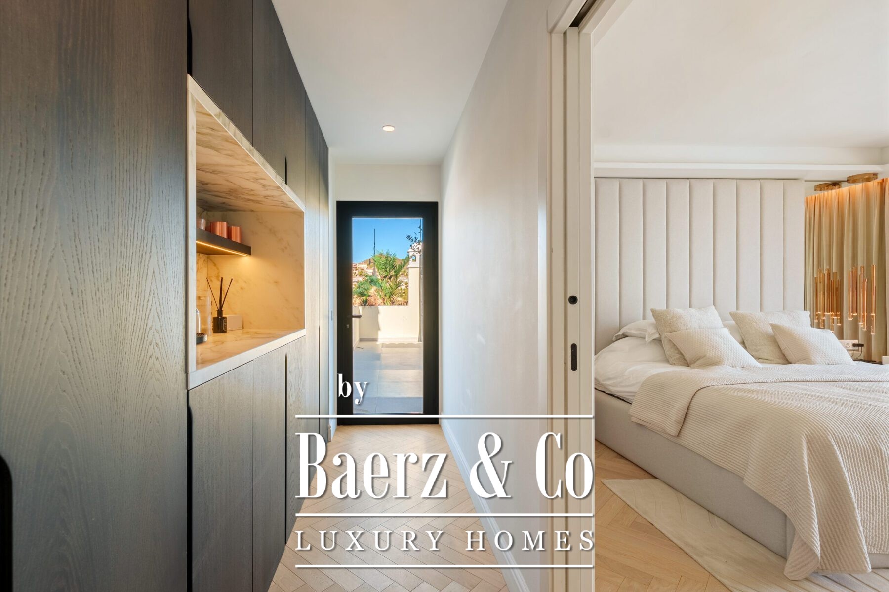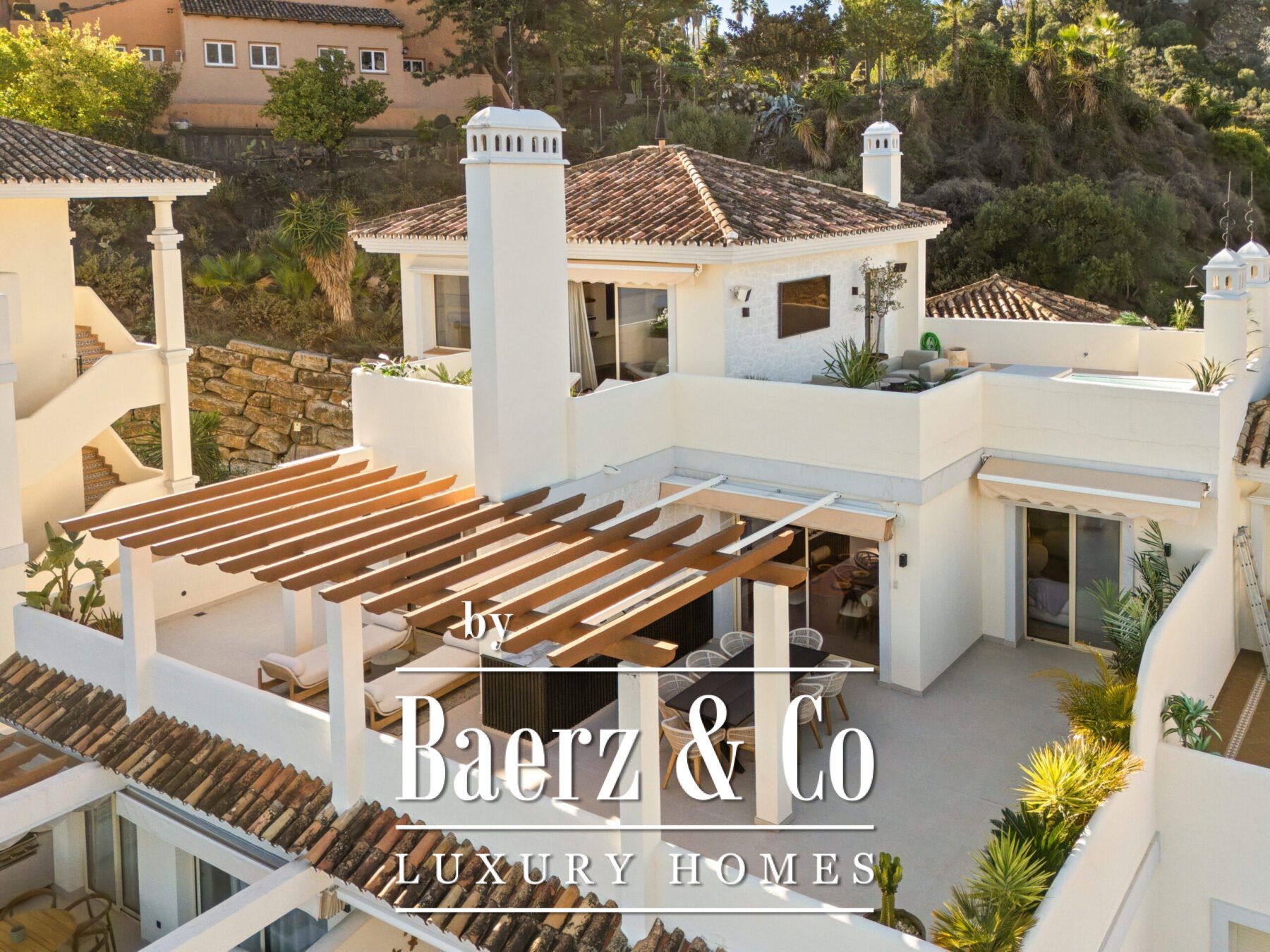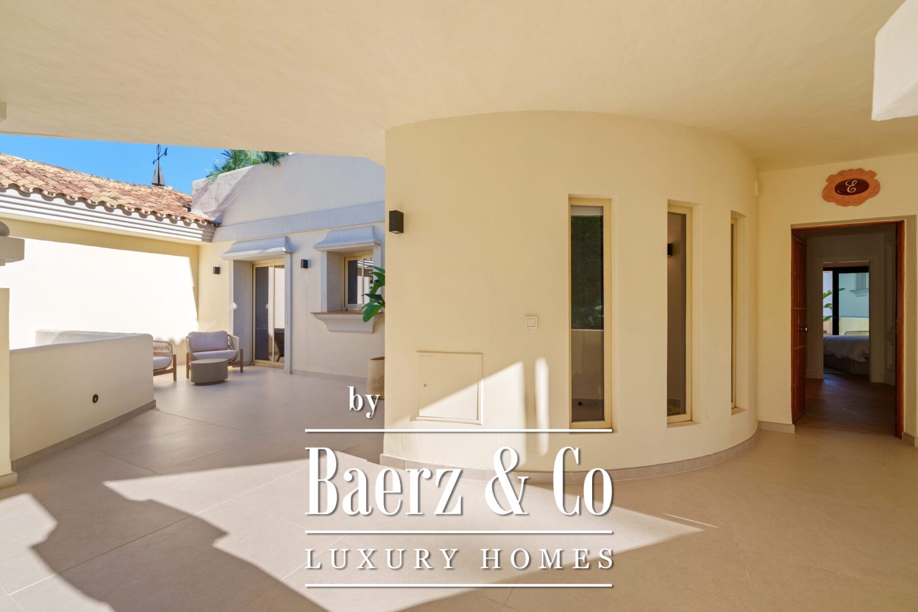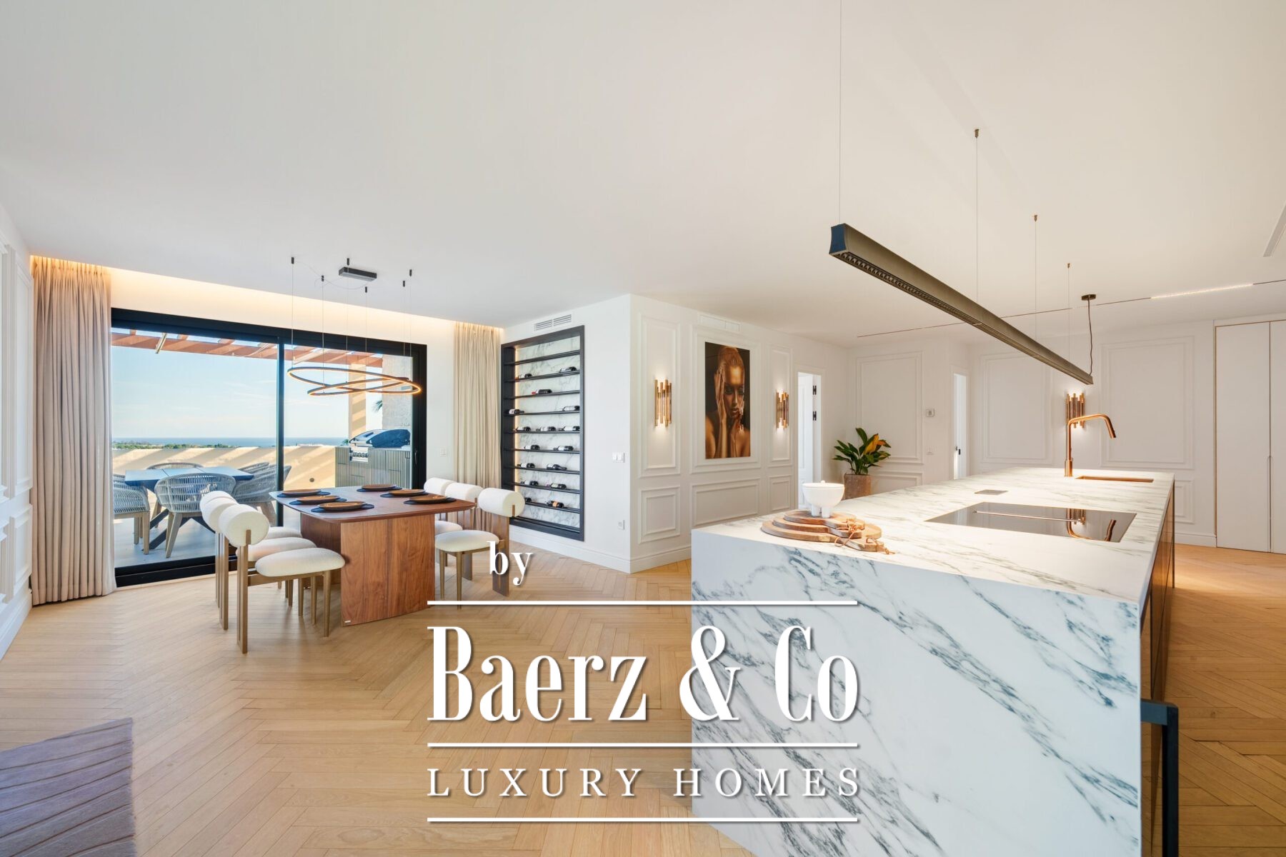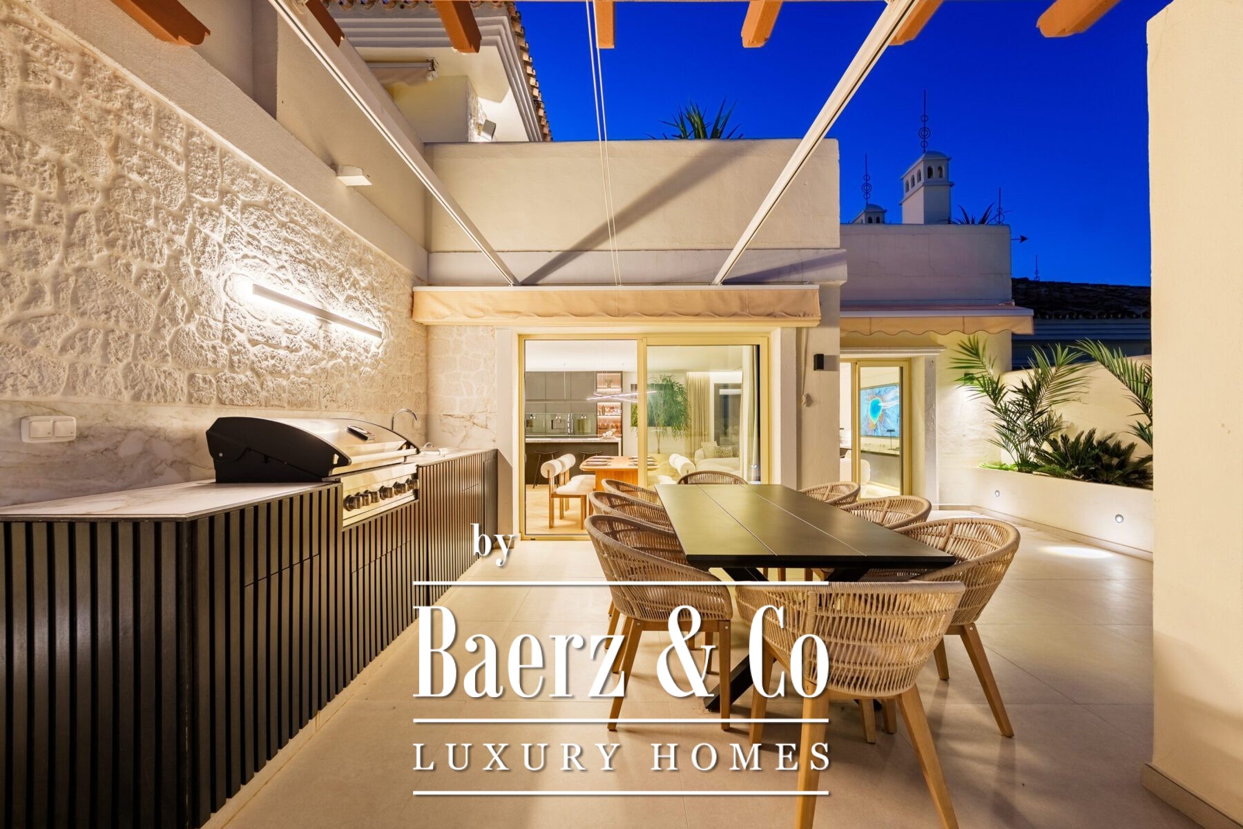 Duplex penthouse Nueva Andalucia Marbella Spain defines a sophisticated balance between contemporary design and warm Scandinavian sensibility. Recently renovated, this 183m² residence features expansive 181m² terraces, seamlessly connecting interior and exterior living. Three generously proportioned bedrooms each include an en-suite bathroom, complemented by underfloor heating for understated comfort. The open-plan living area extends onto a private terrace, where panoramic views stretch across sea, mountains, and lake.