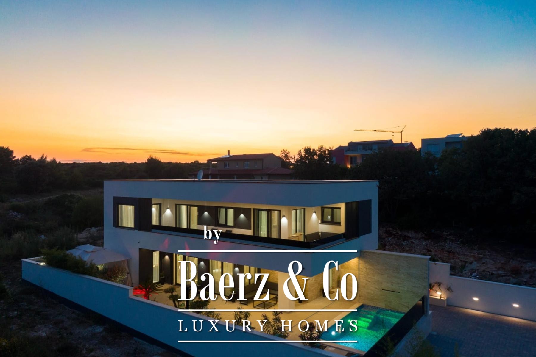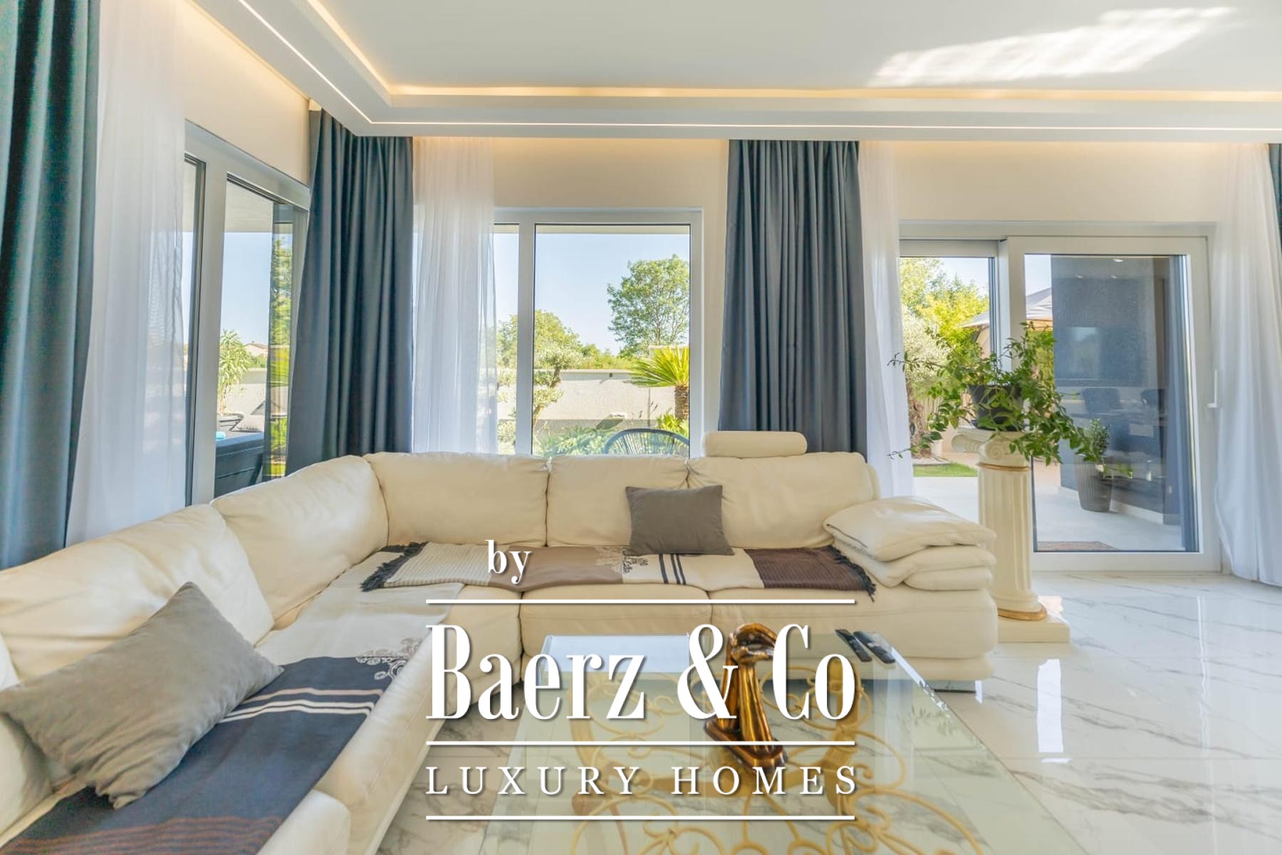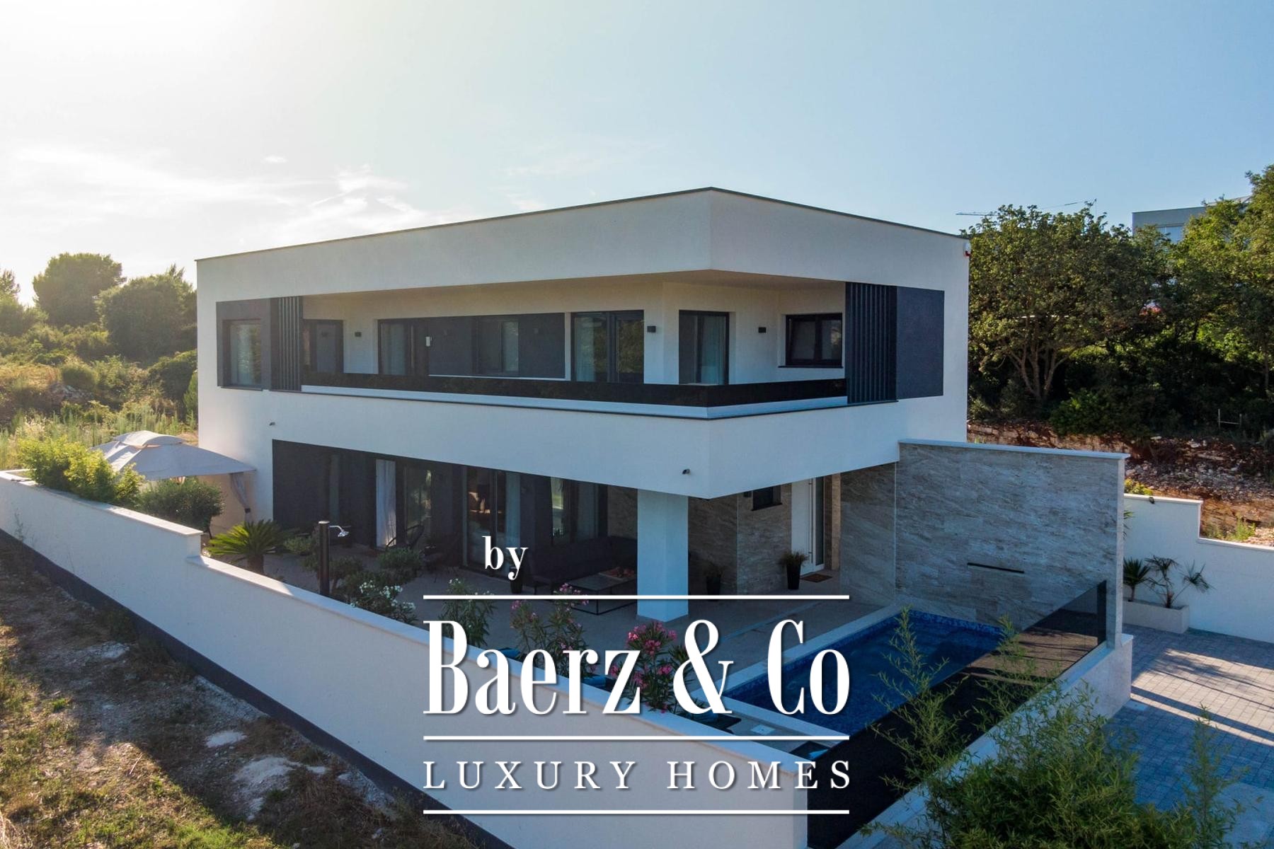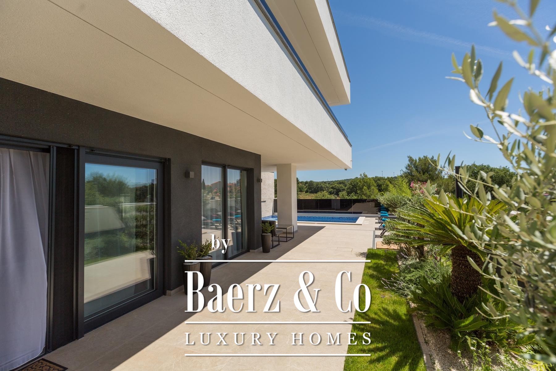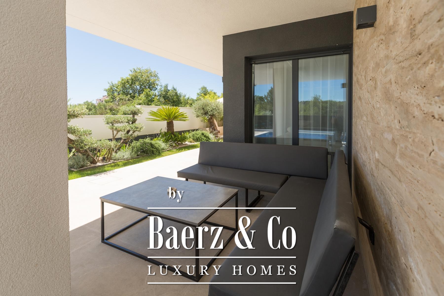 Medulin, one of the most prestigious tourist destinations on the southwestern coast of Istria, where this extraordinary, modern villa awaits, setting new standards of luxury and comfort. Situated on a 450 m2 plot, this meticulously designed new construction from 2024 spans an impressive 200 m2 of net usable area across two levels, offering a perfect blend of sophisticated design and functionality. The proximity of just 400 meters from the sea and beautiful beaches ensures easy access to the crystal-clear Adriatic, while its south orientation guarantees abundant sunlight throughout the day.Upon entering the ground floor of the villa, you will immediately be captivated by the spaciousness and open-plan concept that seamlessly connects the indoor and outdoor living areas. The contemporarily equipped kitchen, featuring the latest appliances and elegant lines, forms the heart of the home, perfect for preparing gastronomic delights. It naturally flows into the opulent living room, bathed in natural light filtering through large glass walls. These expansive glass surfaces not only provide a magnificent view of the meticulously landscaped exterior but also offer direct access to the covered terrace and the main highlight of the outdoor space - an impressive swimming pool.The outdoor area is a true oasis of peace and relaxation. The swimming pool, surrounded by a high stone wall from which a calming waterfall cascades, creates a unique ambiance. Carefully selected green foliage dominates the entire courtyard, creating the impression of a tropical garden that perfectly blends with the villa's architecture, imbuing it with warmth and natural charm. Adjacent to the pool, there is a summer kitchen and a barbecue area, ideal for gatherings and enjoying Mediterranean evenings under the stars. The entire exterior is designed with the aim of providing maximum privacy and relaxation, inviting you to carefree enjoyment in a luxurious setting.An internal staircase, a masterpiece of modern design and lighting, leads you to the upper floor of the villa. Specially designed lighting, subtly highlighted in the evenings, creates an atmosphere of warmth and elegance