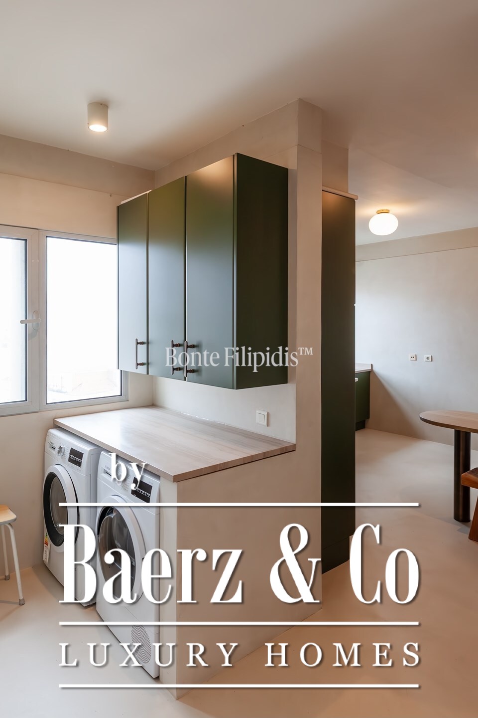 Wide windows in the living and dining room invite serene river views and lead to a spacious balcony, creating a seamless connection between interior and exterior space. A fireplace anchors the room, offering warmth and a gathering point during Lisbon’s cooler evenings. The kitchen is fully equipped with contemporary appliances and an integrated laundry, delivering both function and discretion.