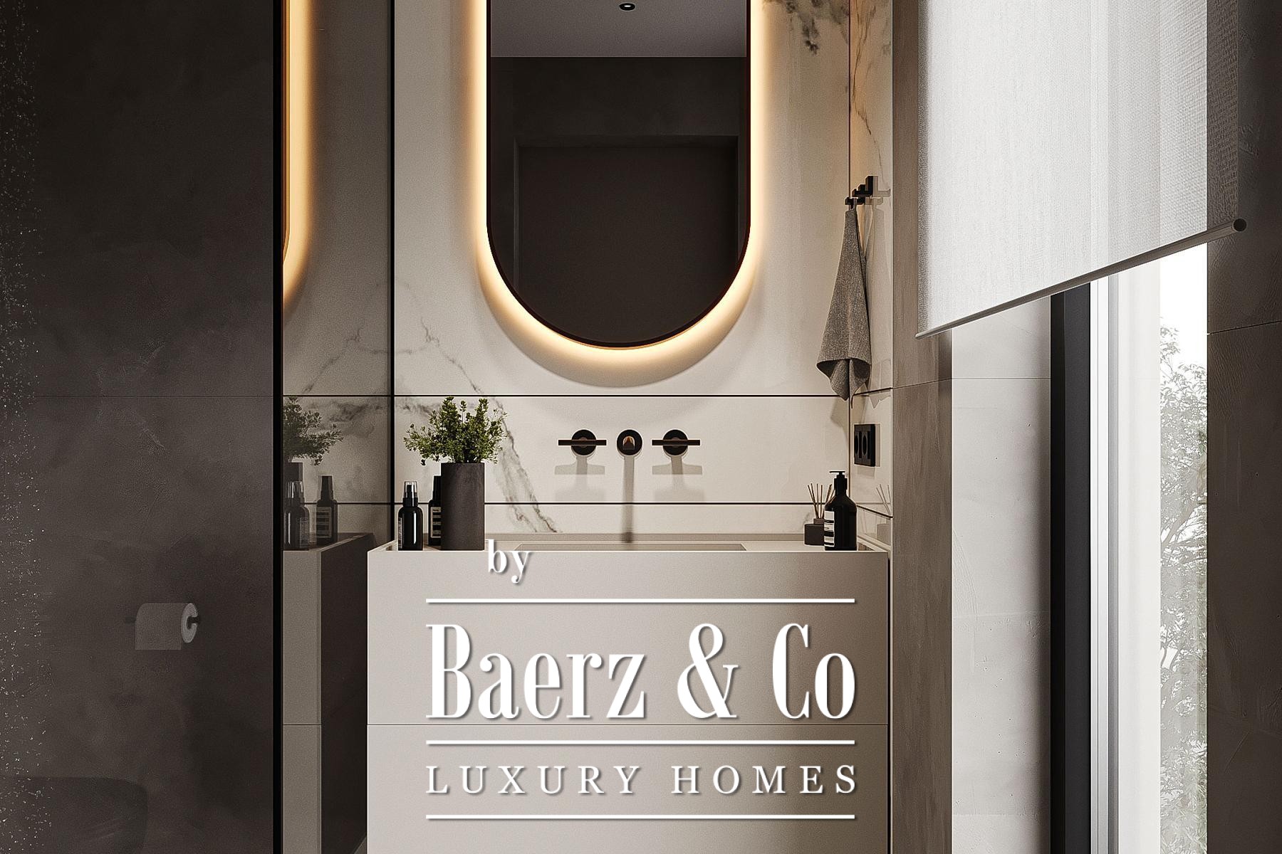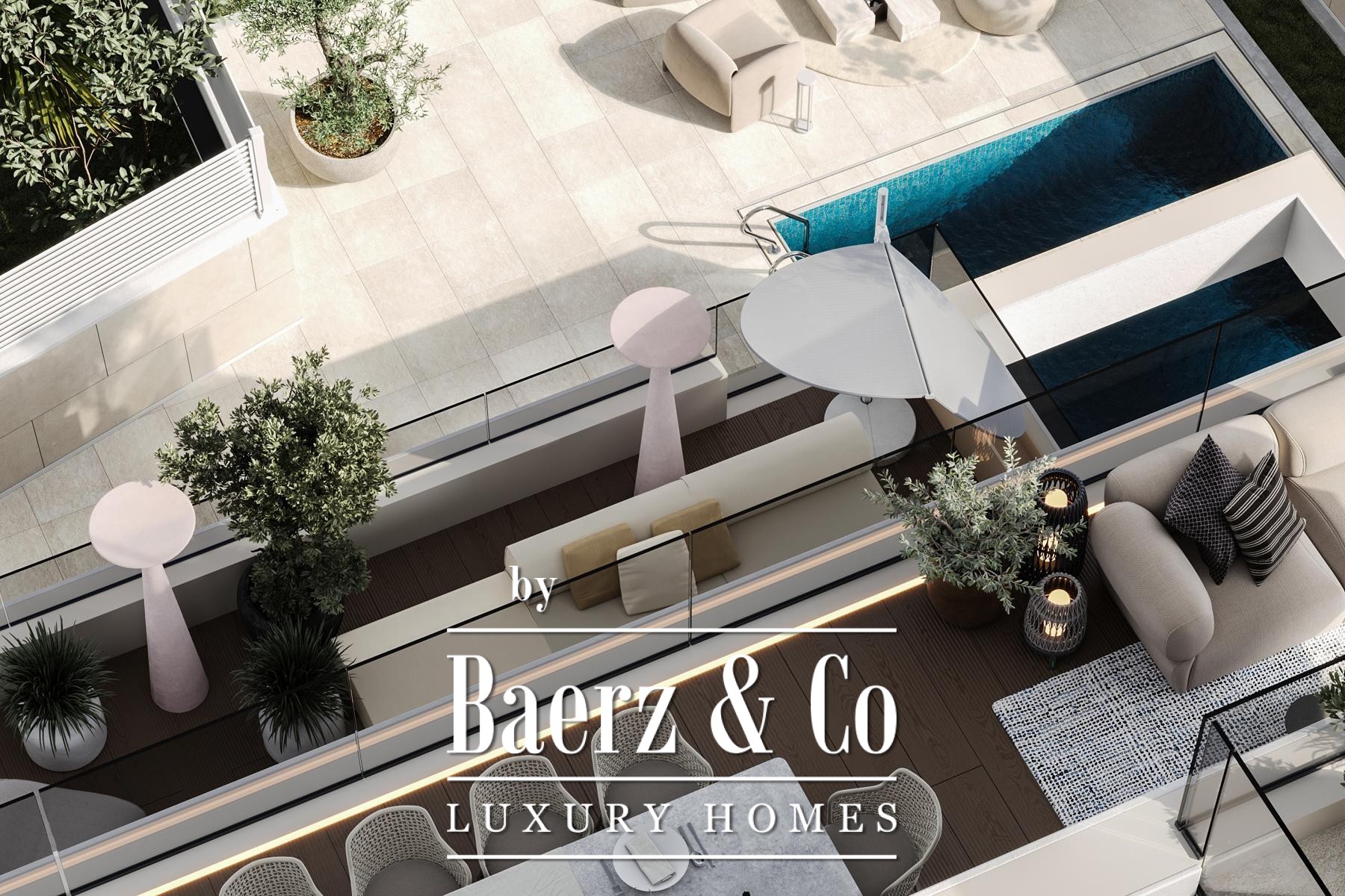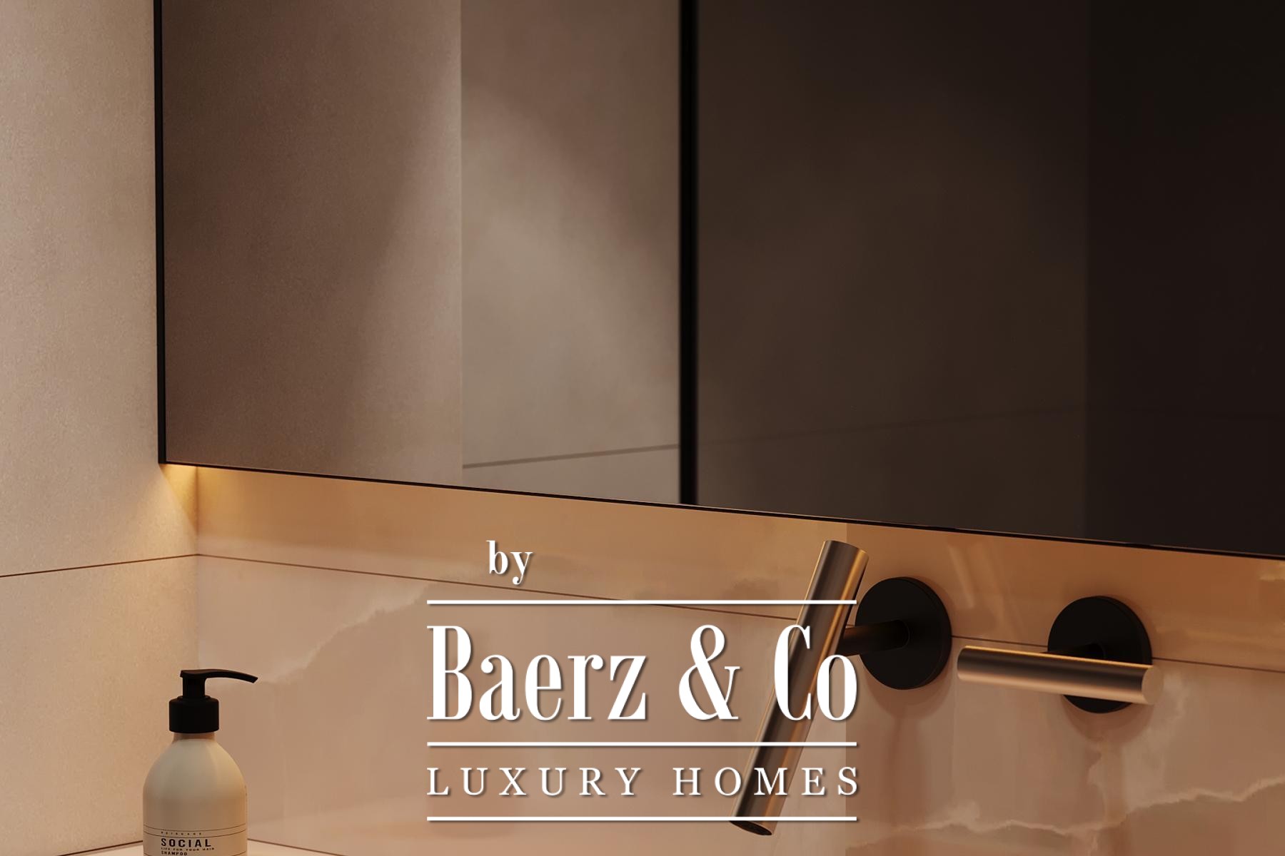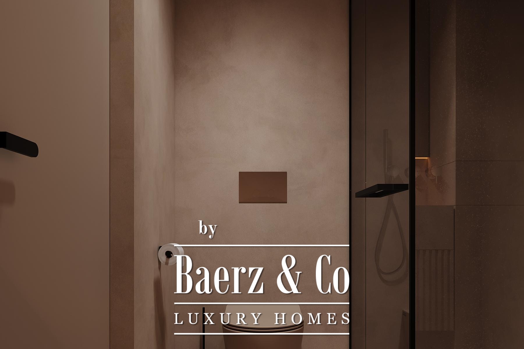 Beyond this, a 46 m² terrace transitions to a private outdoor retreat of almost 300 m², including a 25 m² swimming pool, sundeck, and secluded dining space, all oriented for optimal sunlight and privacy. Interiors balance tactile luxury and quiet technology—three-layer oak parquet, XXL ceramic tiles, and integrated Sonos sound. Comfort is heightened by fully zoned air conditioning, KNX smart controls, Samsung Smart TVs, and robust connectivity, with Starlink as an option.