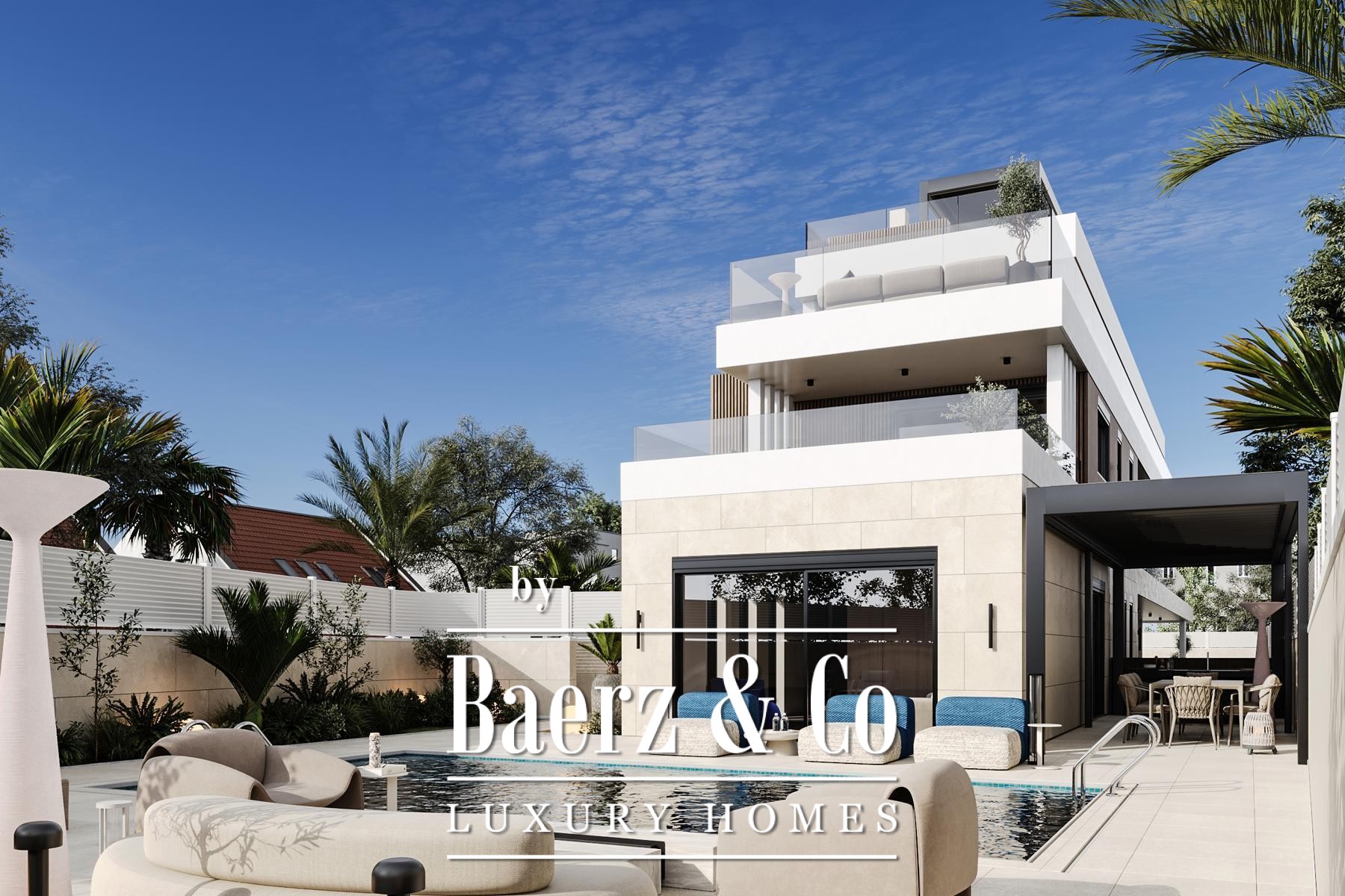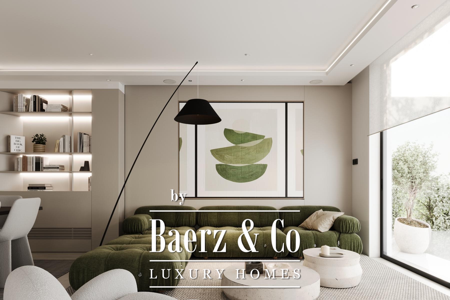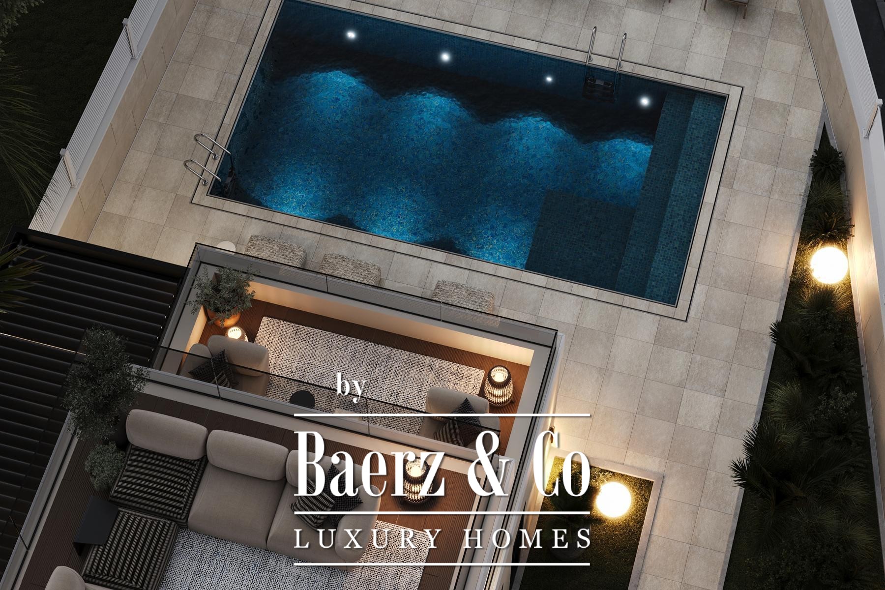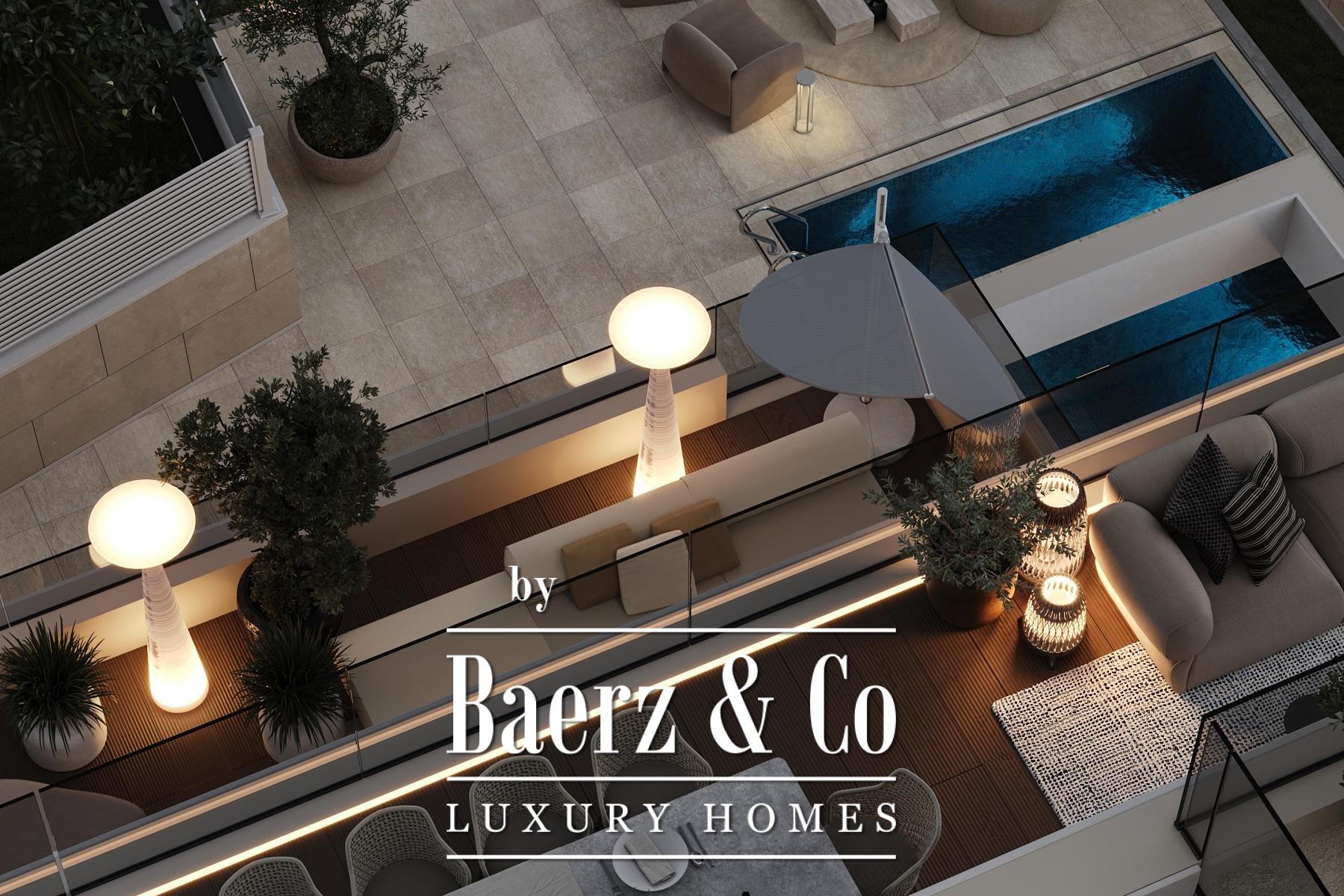 Beyond this, a 46 m² terrace transitions to a private outdoor retreat of almost 300 m², including a 25 m² swimming pool, sundeck, and secluded dining space, all oriented for optimal sunlight and privacy. Interiors balance tactile luxury and quiet technology—three-layer oak parquet, XXL ceramic tiles, and integrated Sonos sound. Comfort is heightened by fully zoned air conditioning, KNX smart controls, Samsung Smart TVs, and robust connectivity, with Starlink as an option.