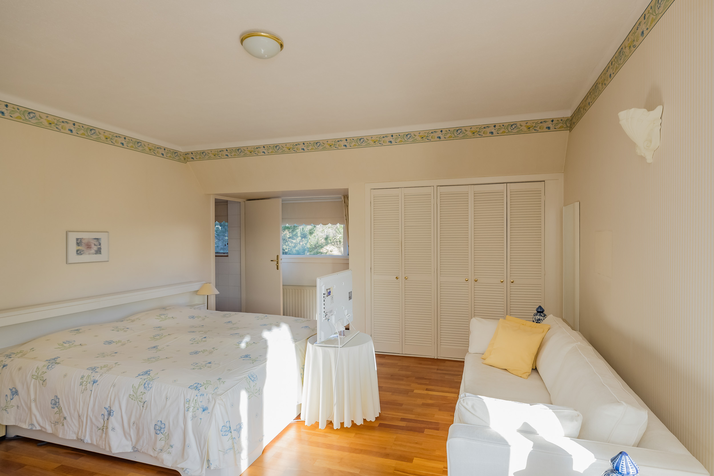 The spacious living room is a delightful living space with a warm, inviting atmosphere. The fireplace and elegant marble floor give the room character, while the doors from the living room provide direct access to the garden. The sun circles the house from morning to evening, creating a beautiful play of light.
