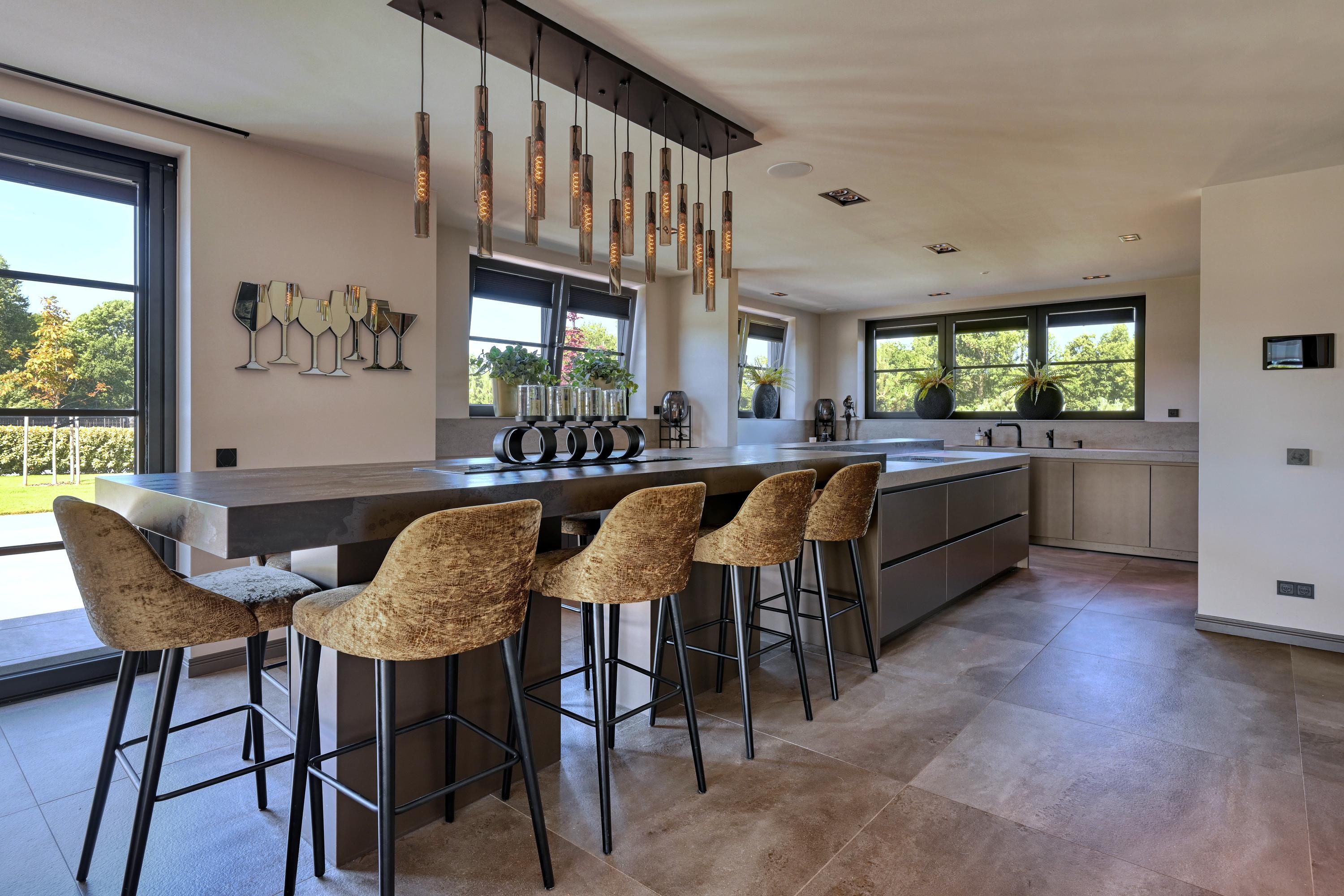 The adjacent kitchen is very generously laid out with a large cooking island and a long breakfast bar, creating a lovely spot for socializing. Equipped with professional appliances such as two refrigerators/freezers, two ovens, two combination microwave/ovens, a spacious induction cooktop with an integrated Bora exhaust system, two dishwashers, and a Quooker for boiling, purified, and sparkling water, this kitchen is truly equipped with every convenience.