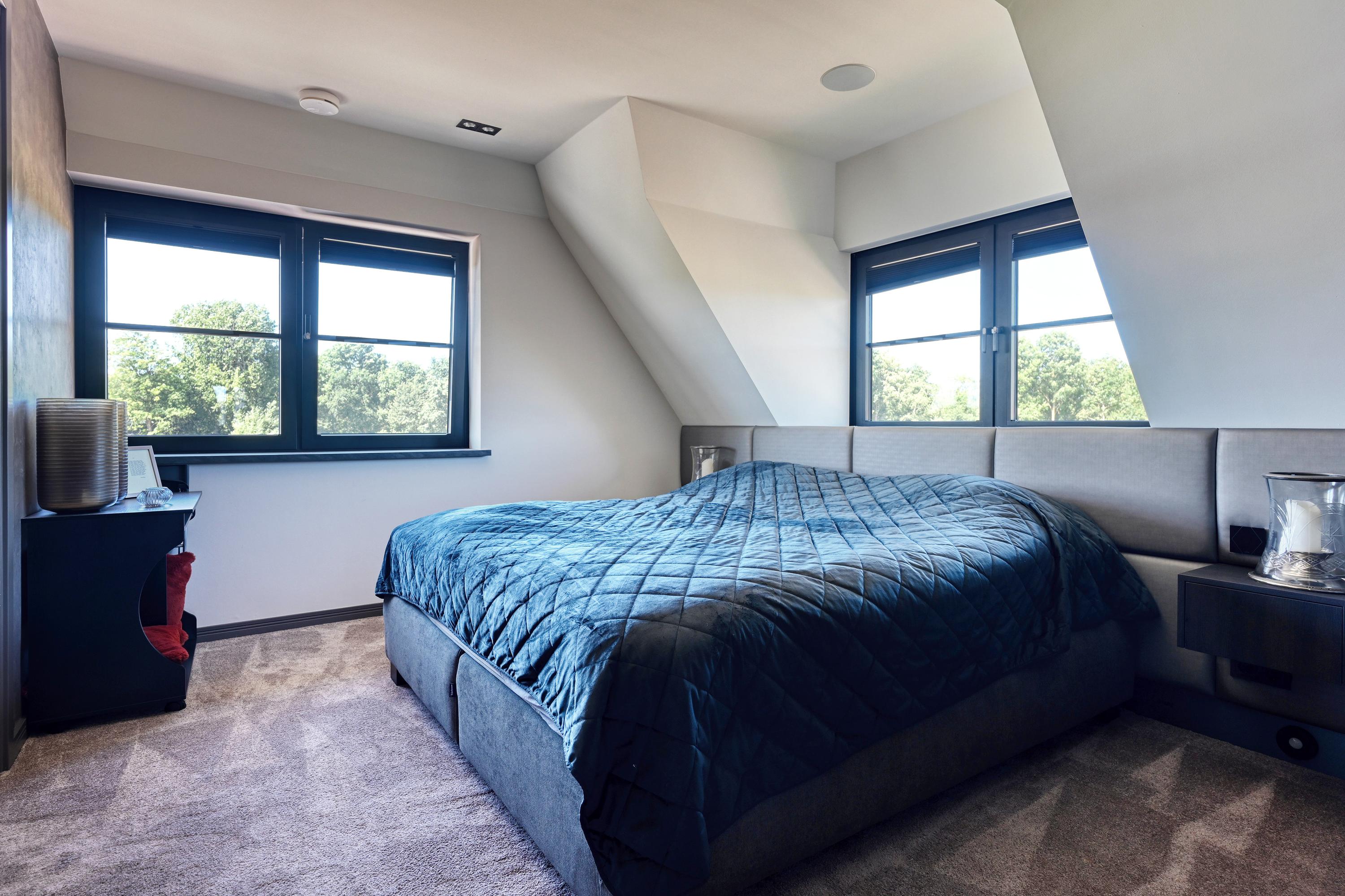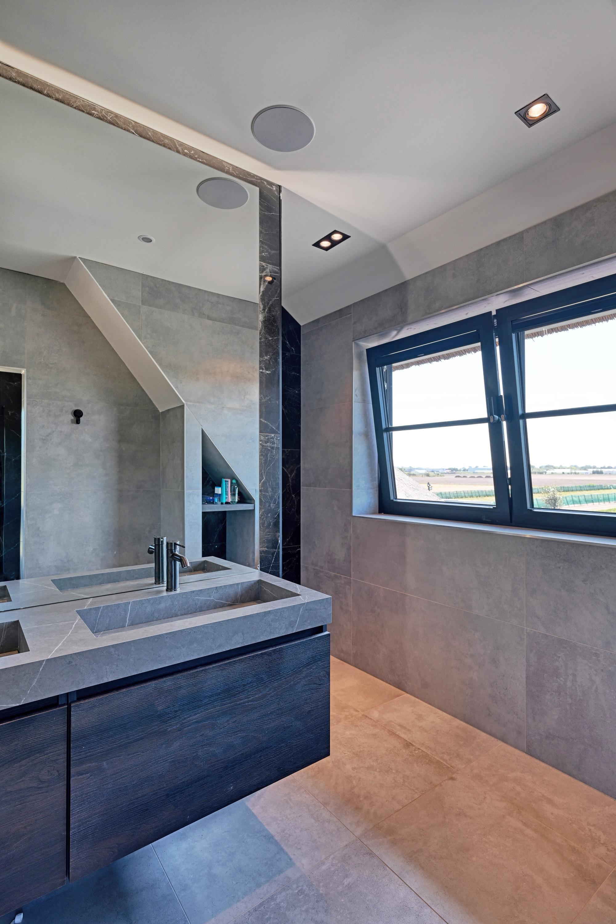 The first floor features two spacious bedrooms and two luxurious bathrooms, both exuding the same warm ambiance but offering varying views of bulb fields and dunes. The master bedroom has its own elegant walk-in closet, leading directly to an en-suite bathroom equipped with a bathtub, a luxurious double vanity, a shower, and a separate toilet.