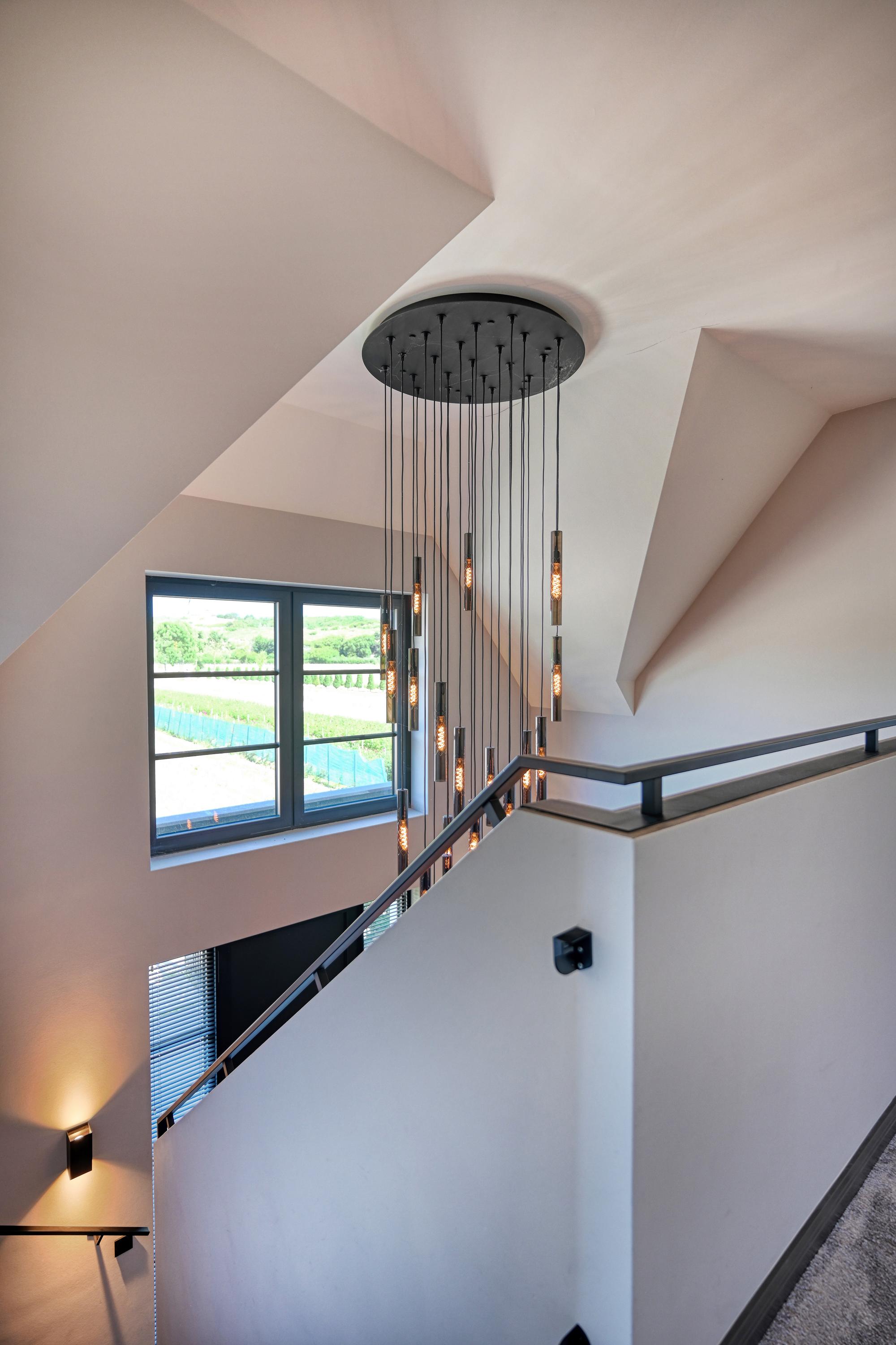 Upon entering, you’ll find a spacious entryway with a loft and a beautiful staircase; it immediately becomes clear that this villa was designed with a sense of space and elegance. Steel doors with smoked glass provide access to the living room.