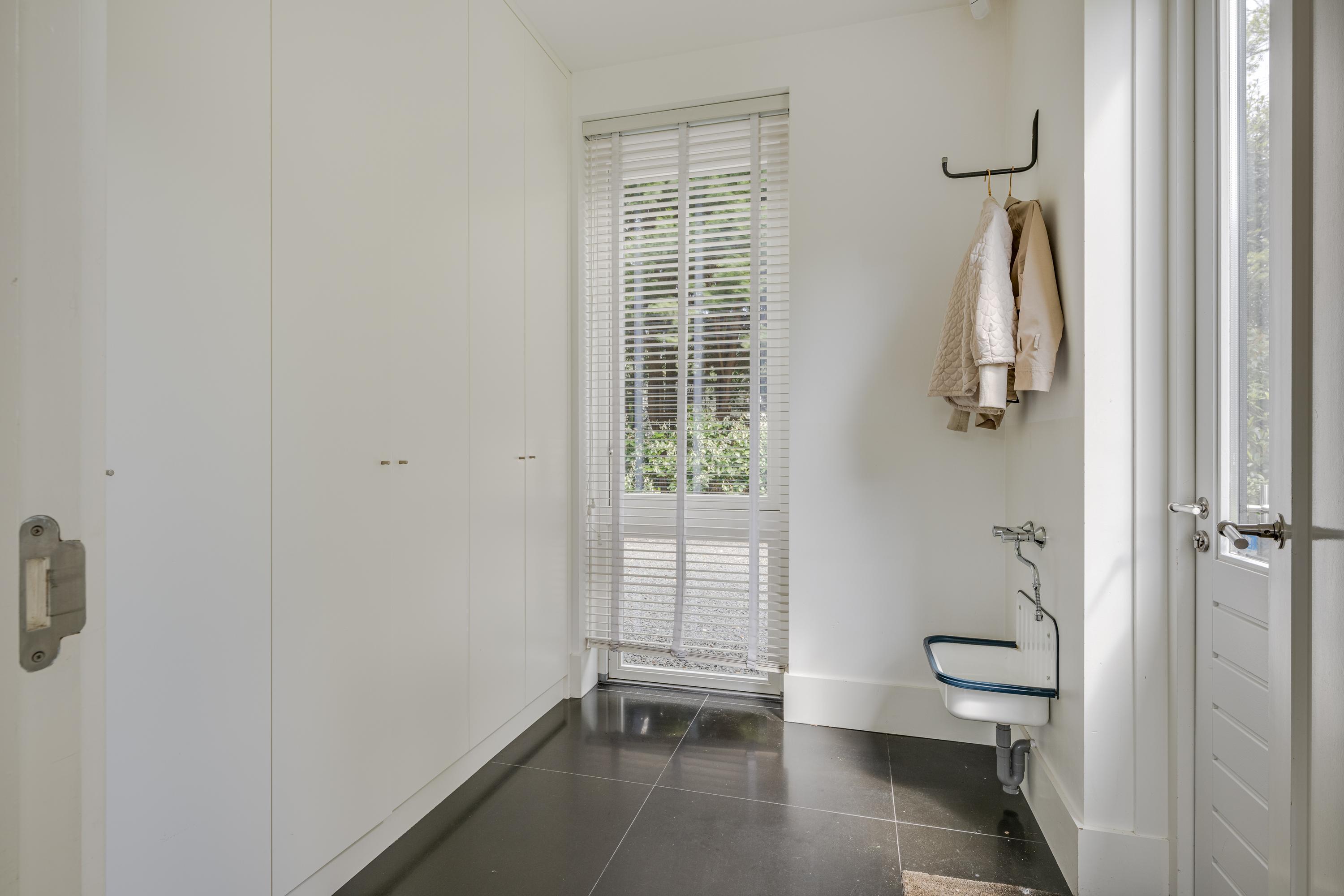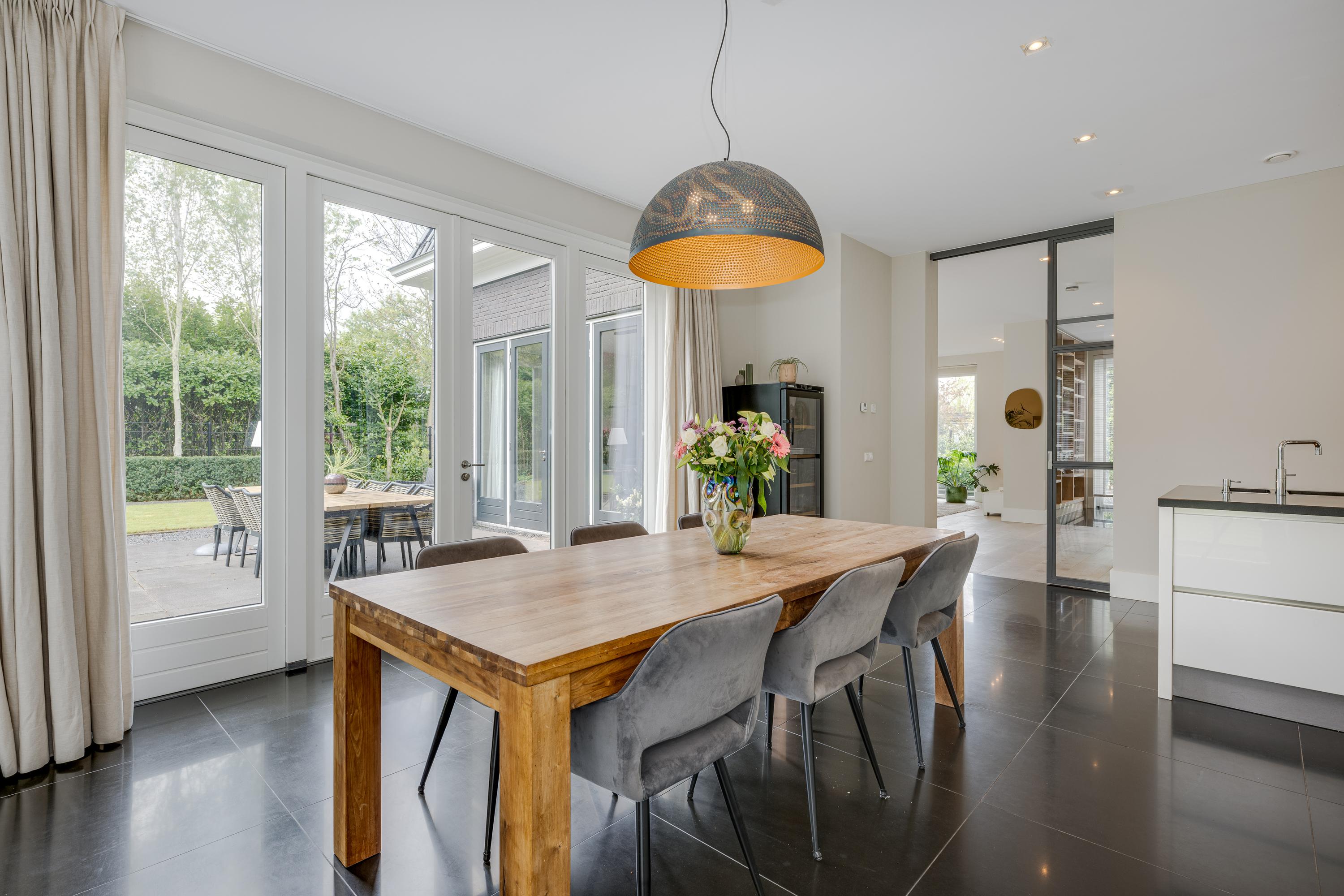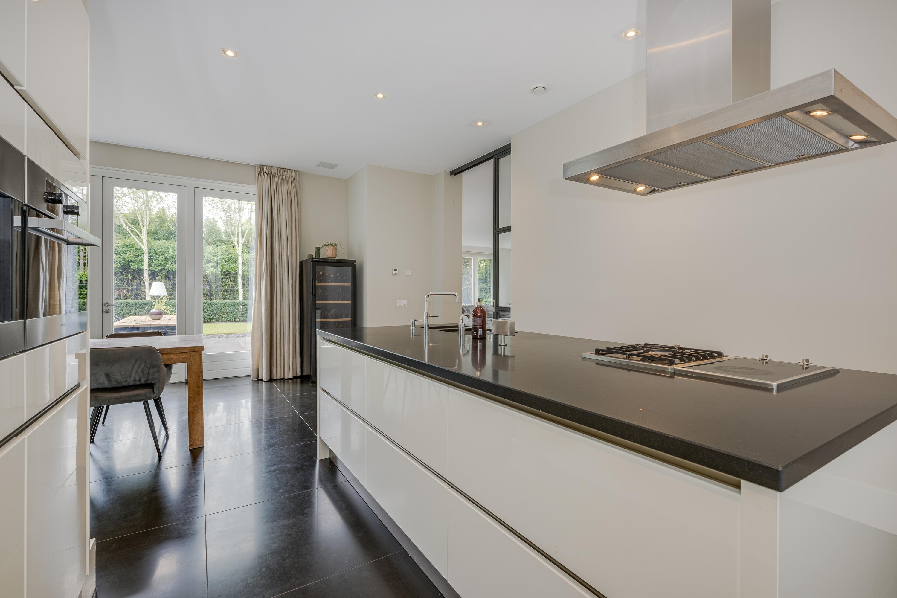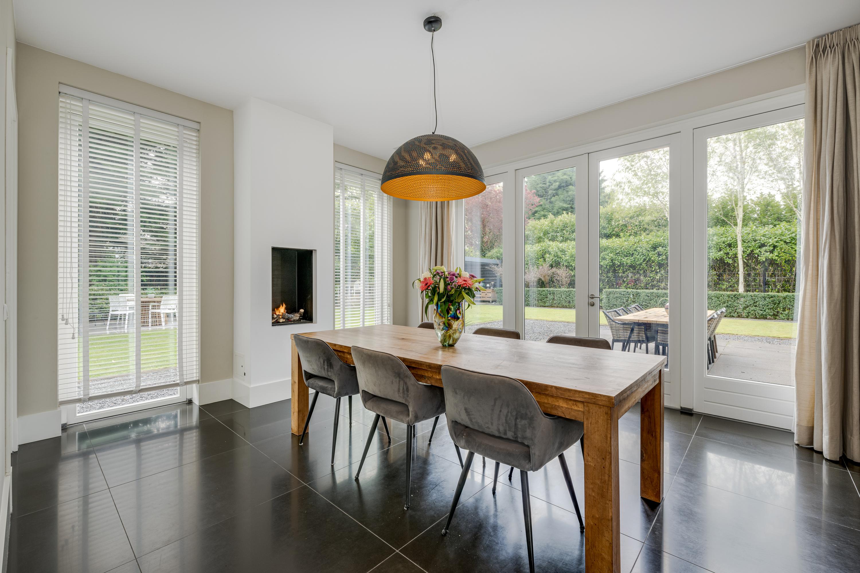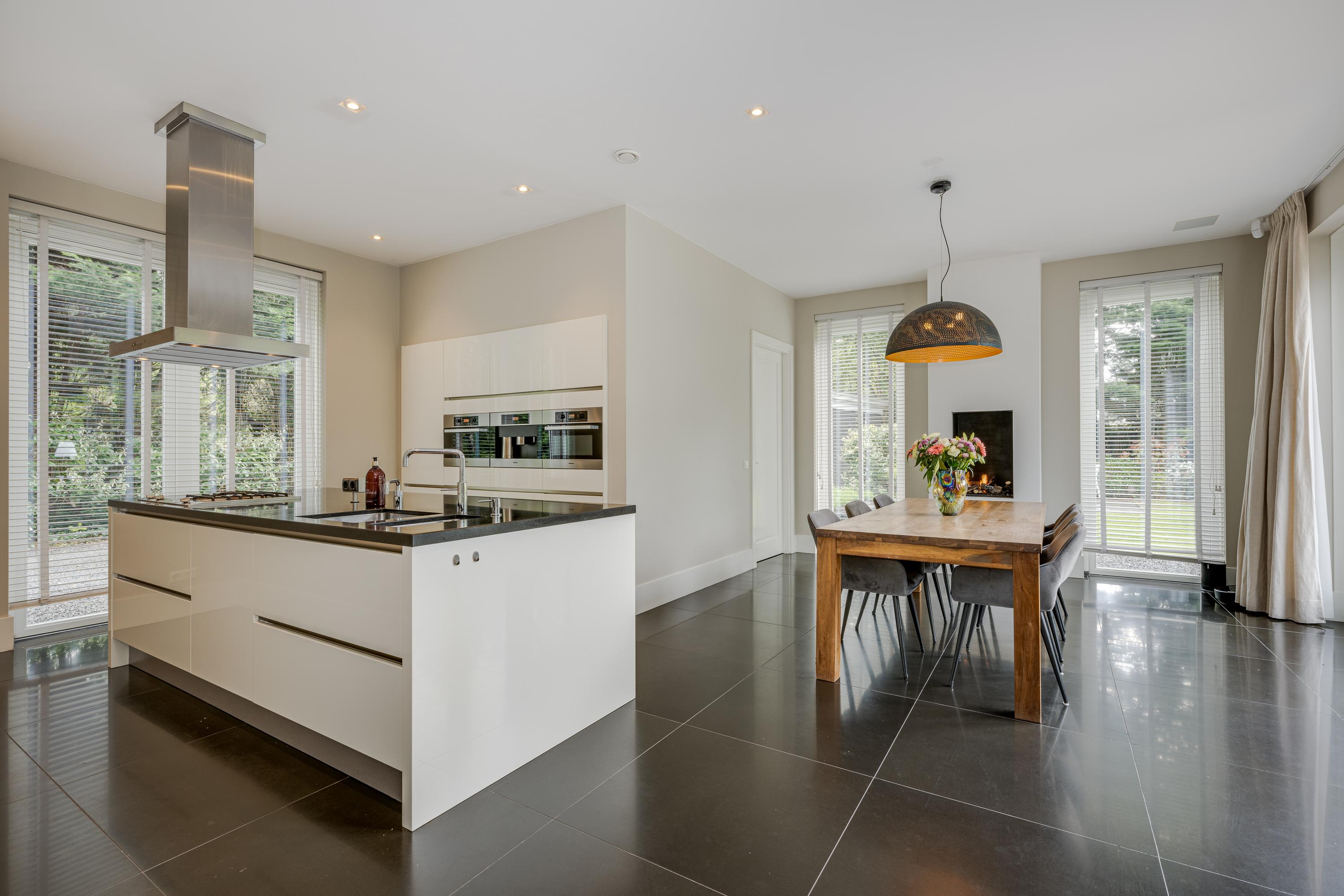 The modern kitchen is equipped with all desirable equipment, with the cooking island having a double sink, dishwasher, refrigerator and a gas and induction hob. The high wall provides space for the steam oven, combination microwave oven and coffee machine. In addition to cooking, the kitchen offers space for a very spacious dining table with a cozy gas fireplace. The double doors from the kitchen give access to the spacious terrace. Next to the kitchen is the utility room, equipped with a sink, plenty of cupboard space and a door to the garden.