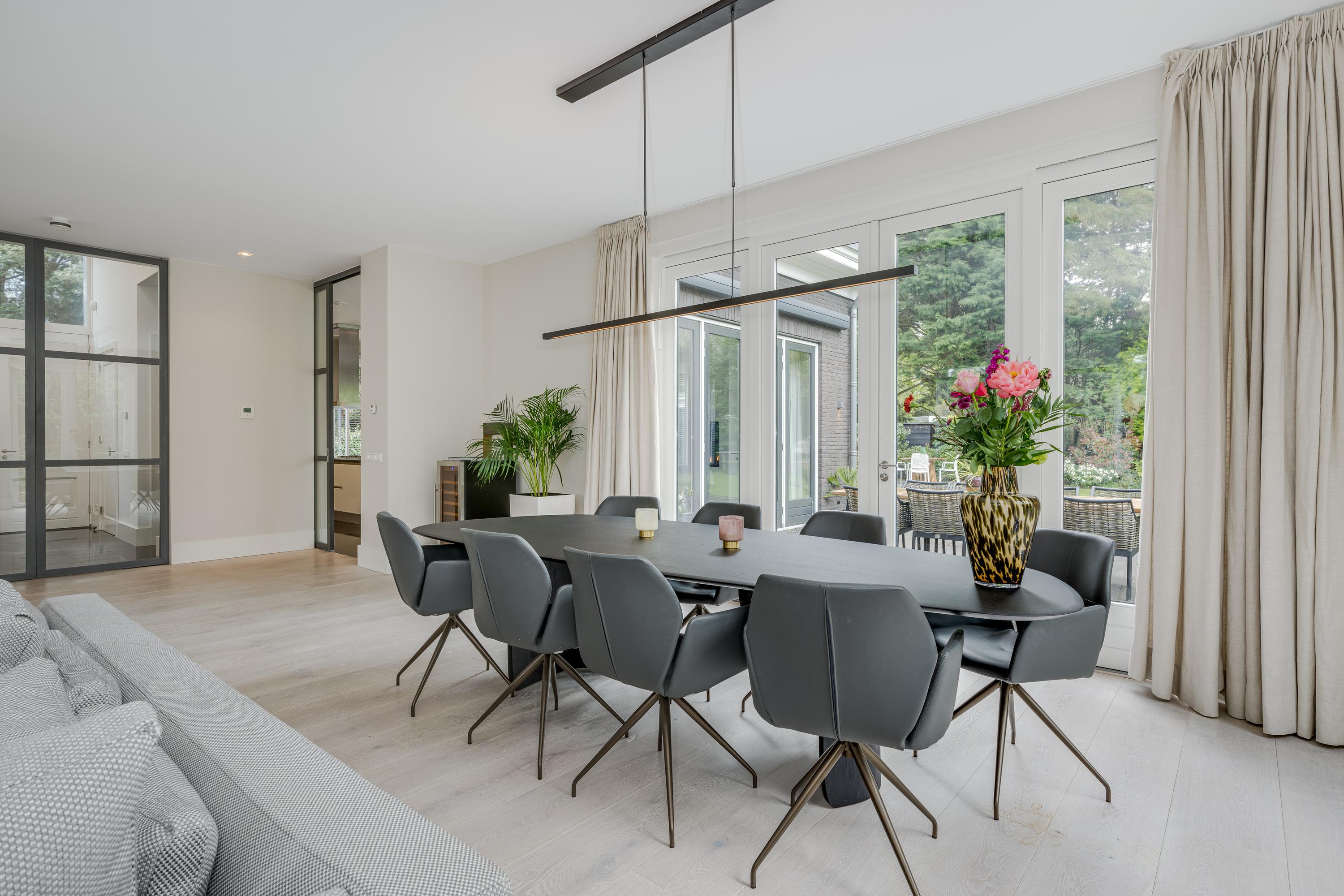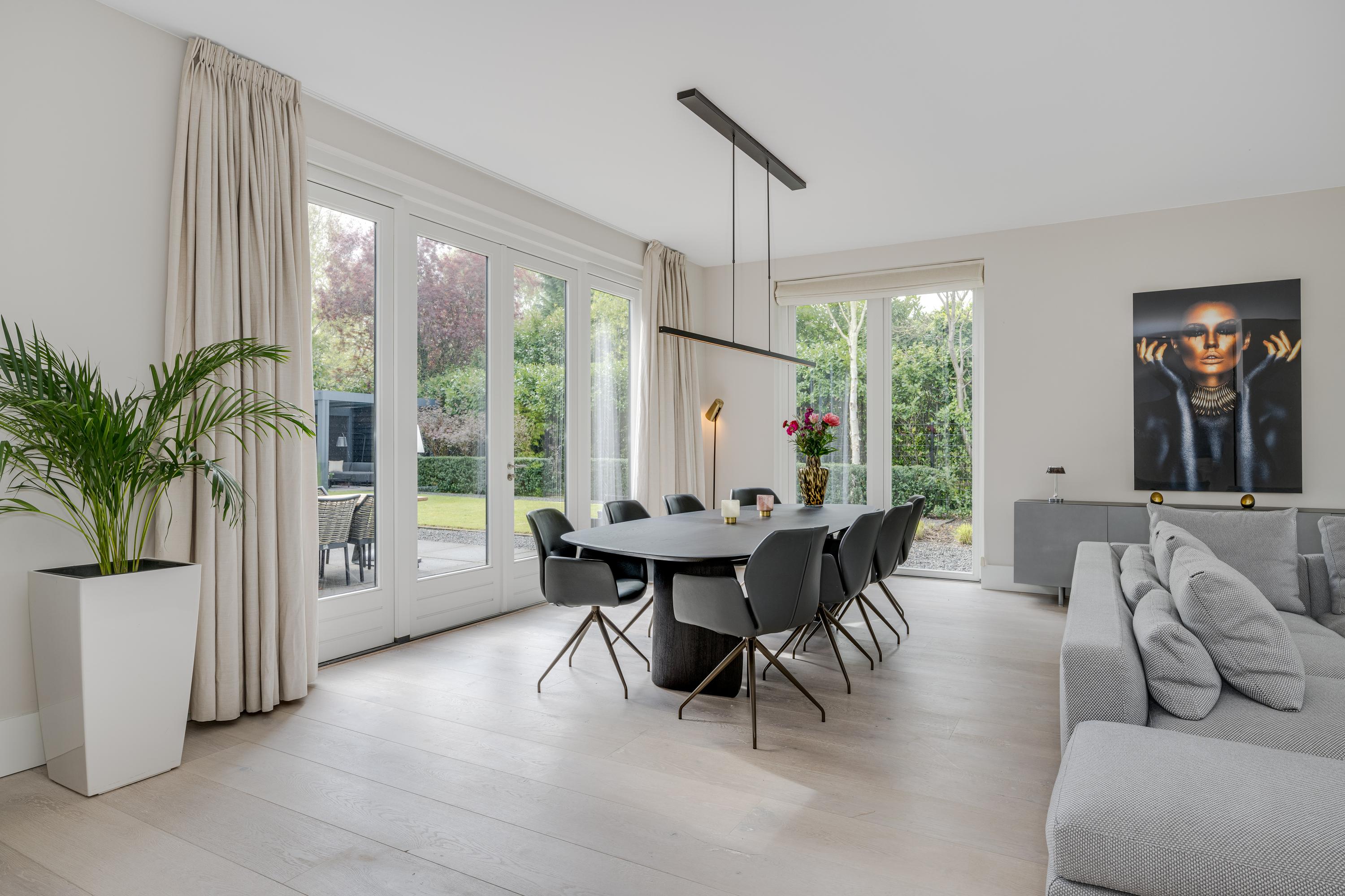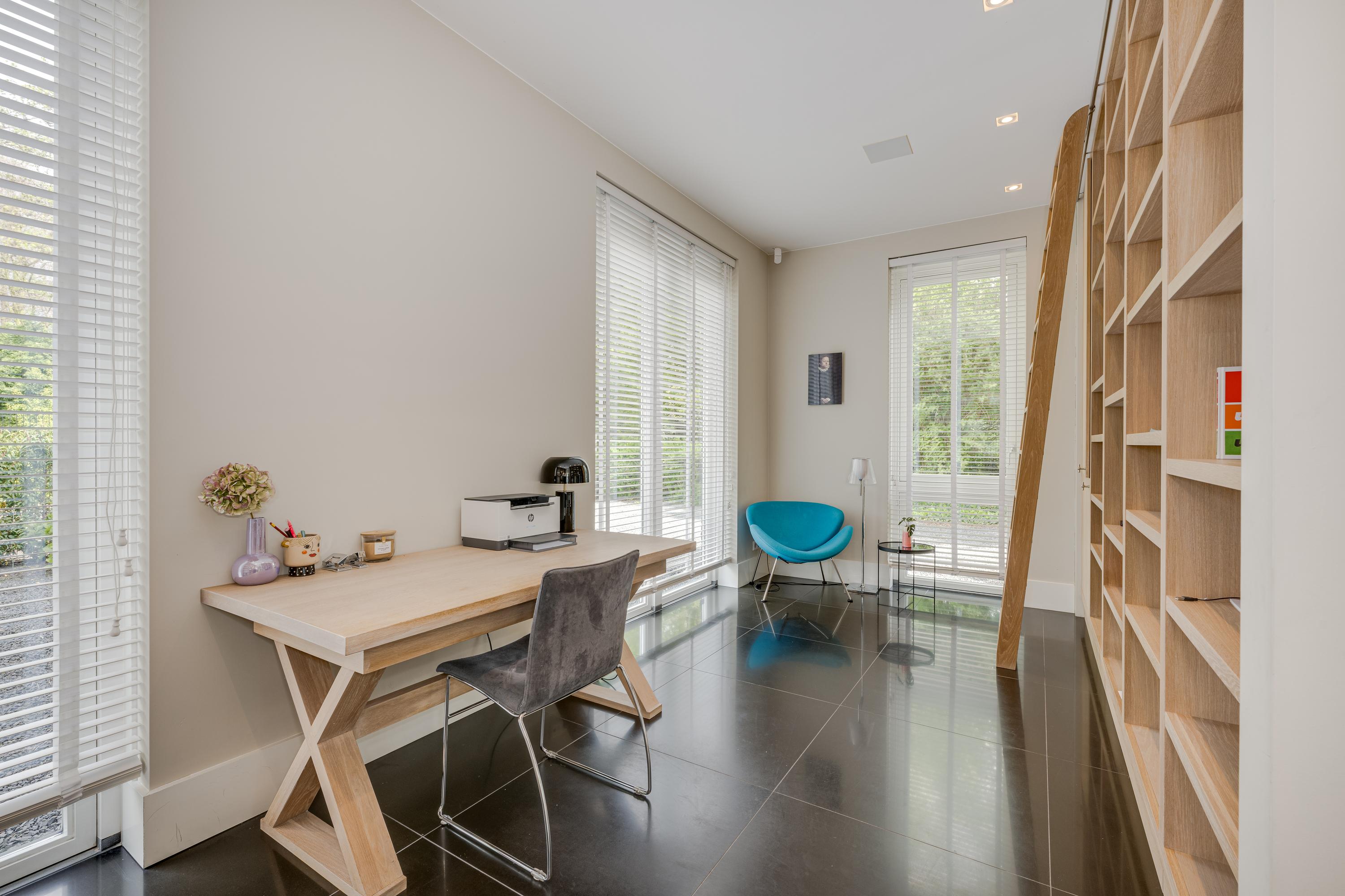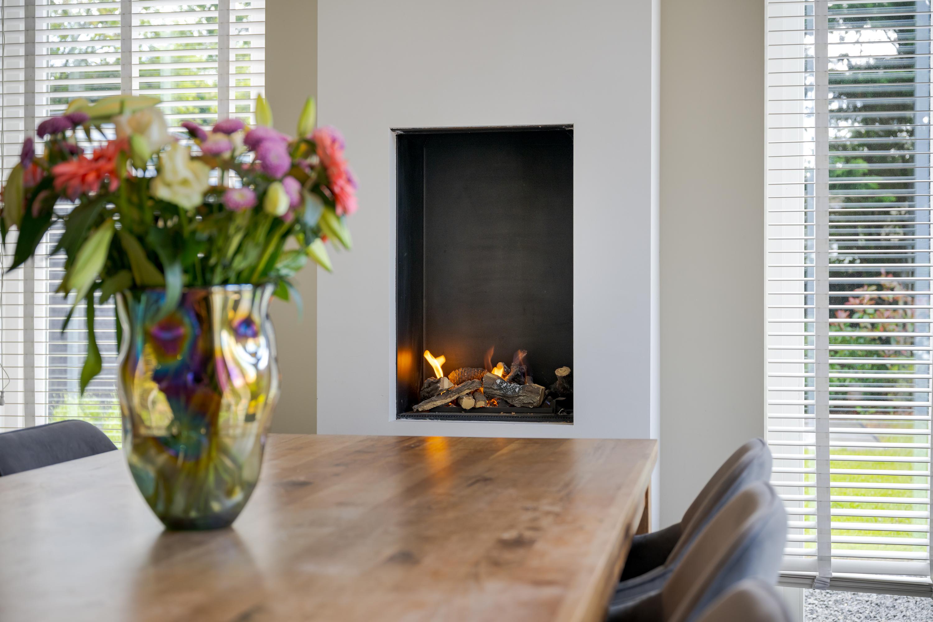 The modern kitchen is equipped with all desirable equipment, with the cooking island having a double sink, dishwasher, refrigerator and a gas and induction hob. The high wall provides space for the steam oven, combination microwave oven and coffee machine. In addition to cooking, the kitchen offers space for a very spacious dining table with a cozy gas fireplace. The double doors from the kitchen give access to the spacious terrace. Next to the kitchen is the utility room, equipped with a sink, plenty of cupboard space and a door to the garden.