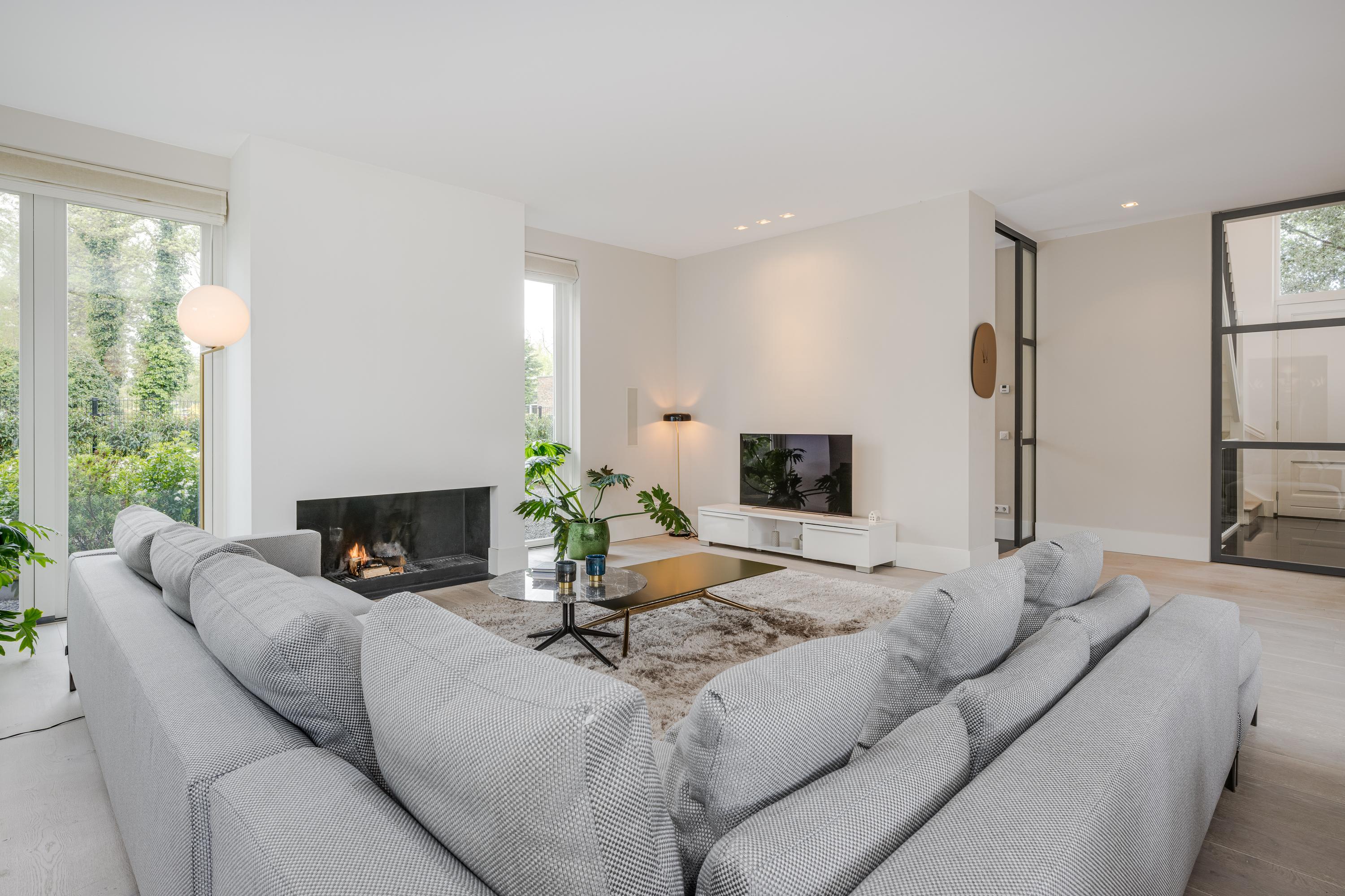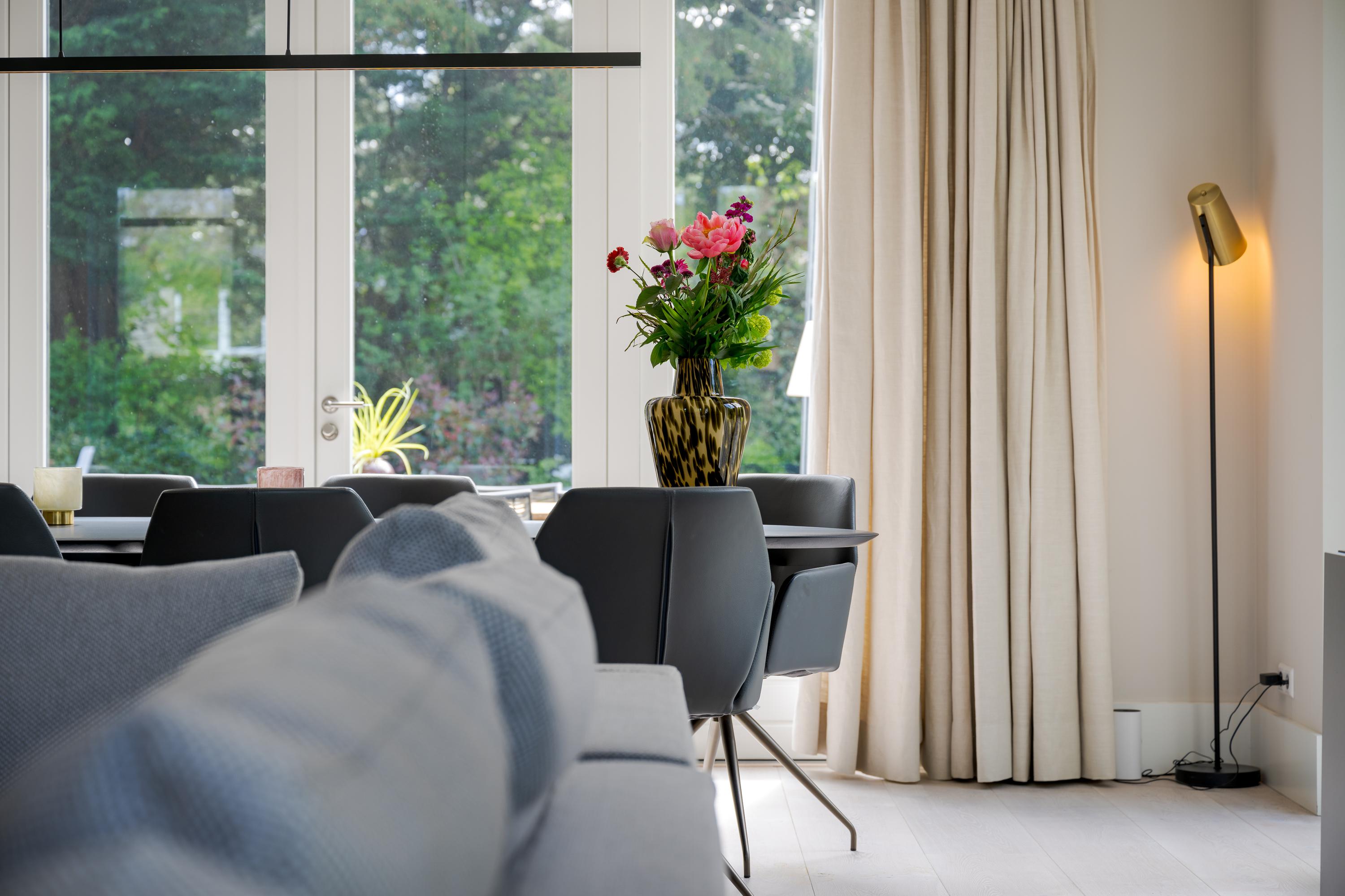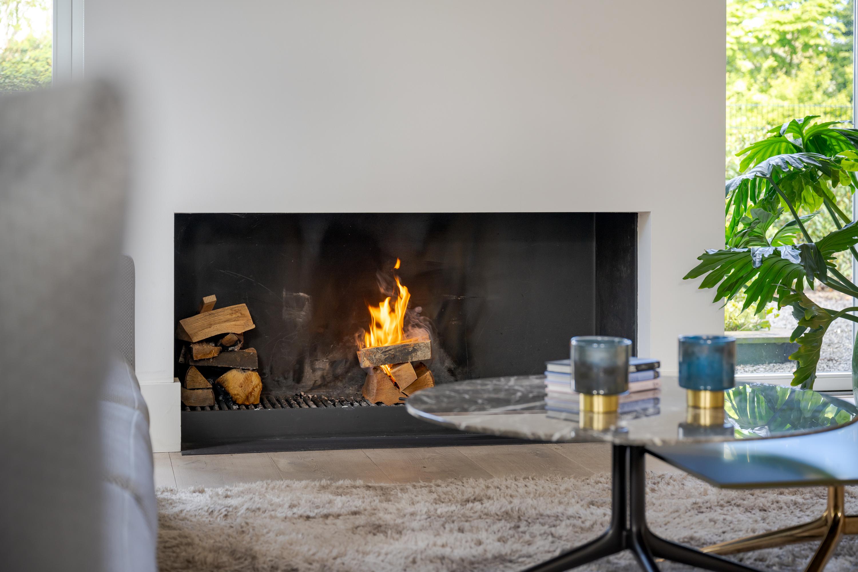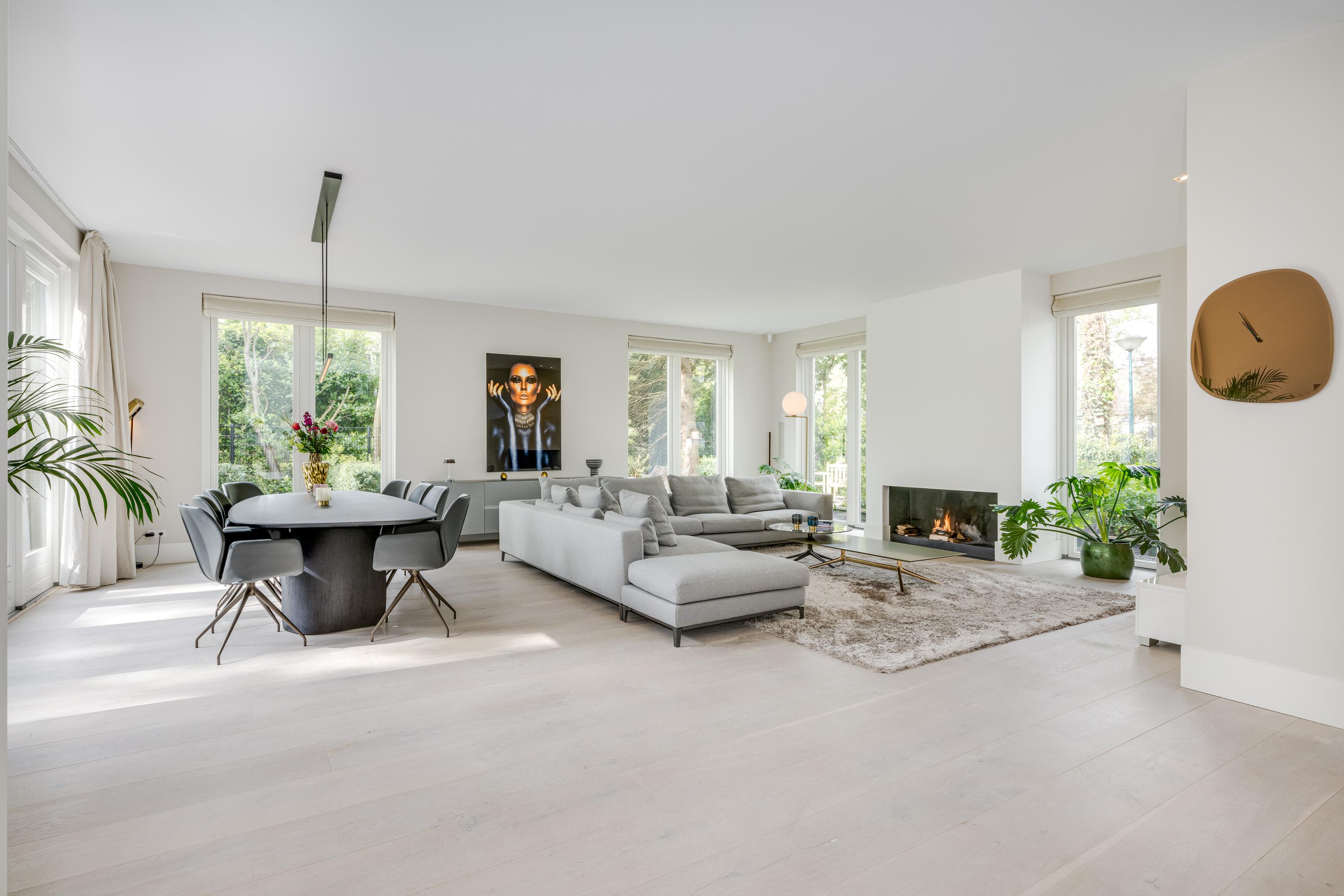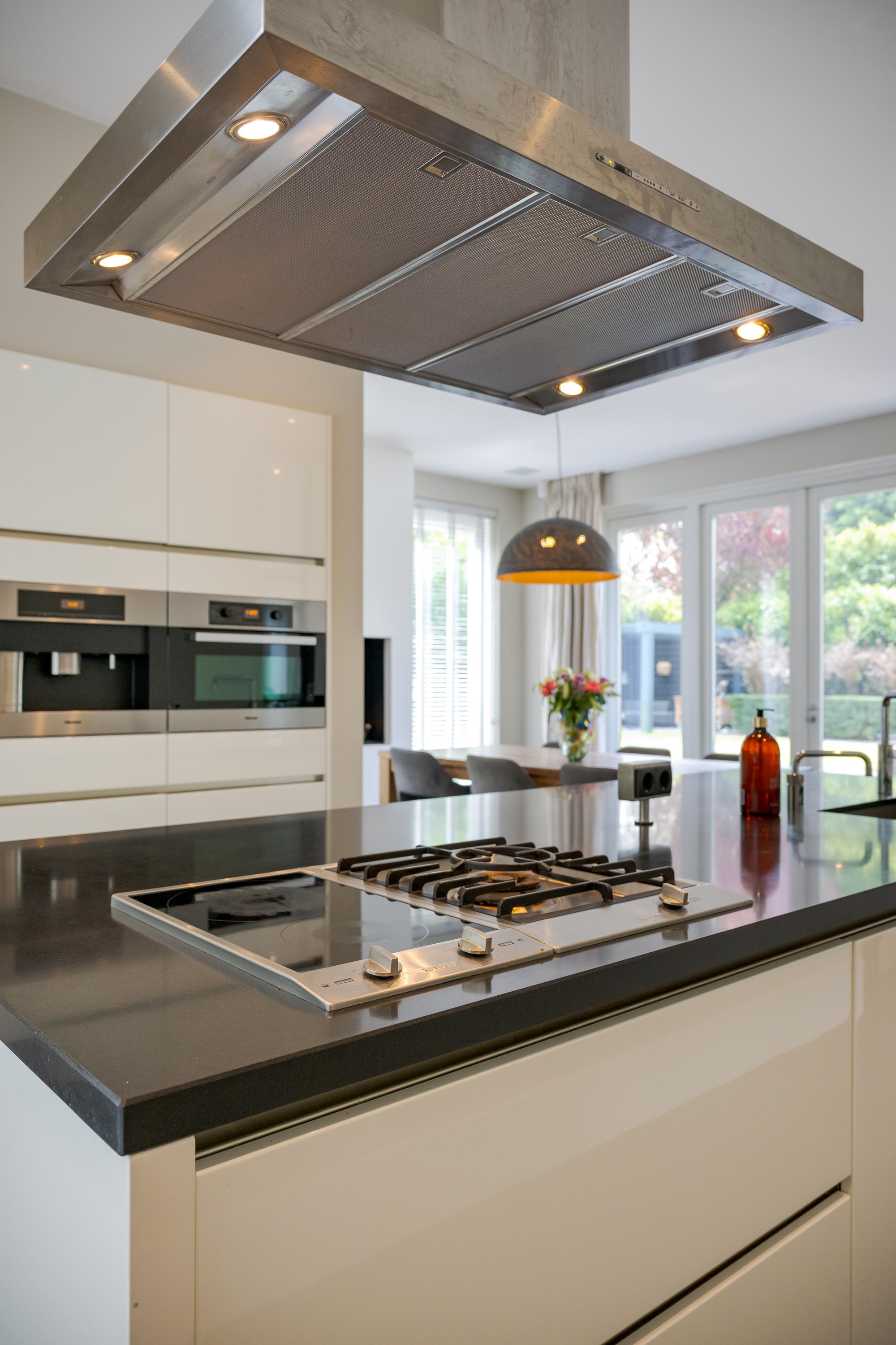 The modern kitchen is equipped with all desirable equipment, with the cooking island having a double sink, dishwasher, refrigerator and a gas and induction hob. The high wall provides space for the steam oven, combination microwave oven and coffee machine. In addition to cooking, the kitchen offers space for a very spacious dining table with a cozy gas fireplace. The double doors from the kitchen give access to the spacious terrace. Next to the kitchen is the utility room, equipped with a sink, plenty of cupboard space and a door to the garden.