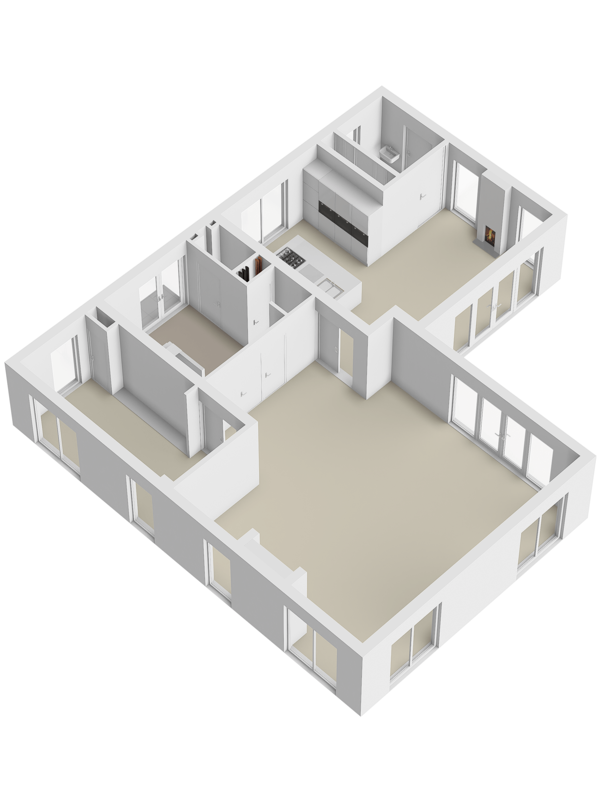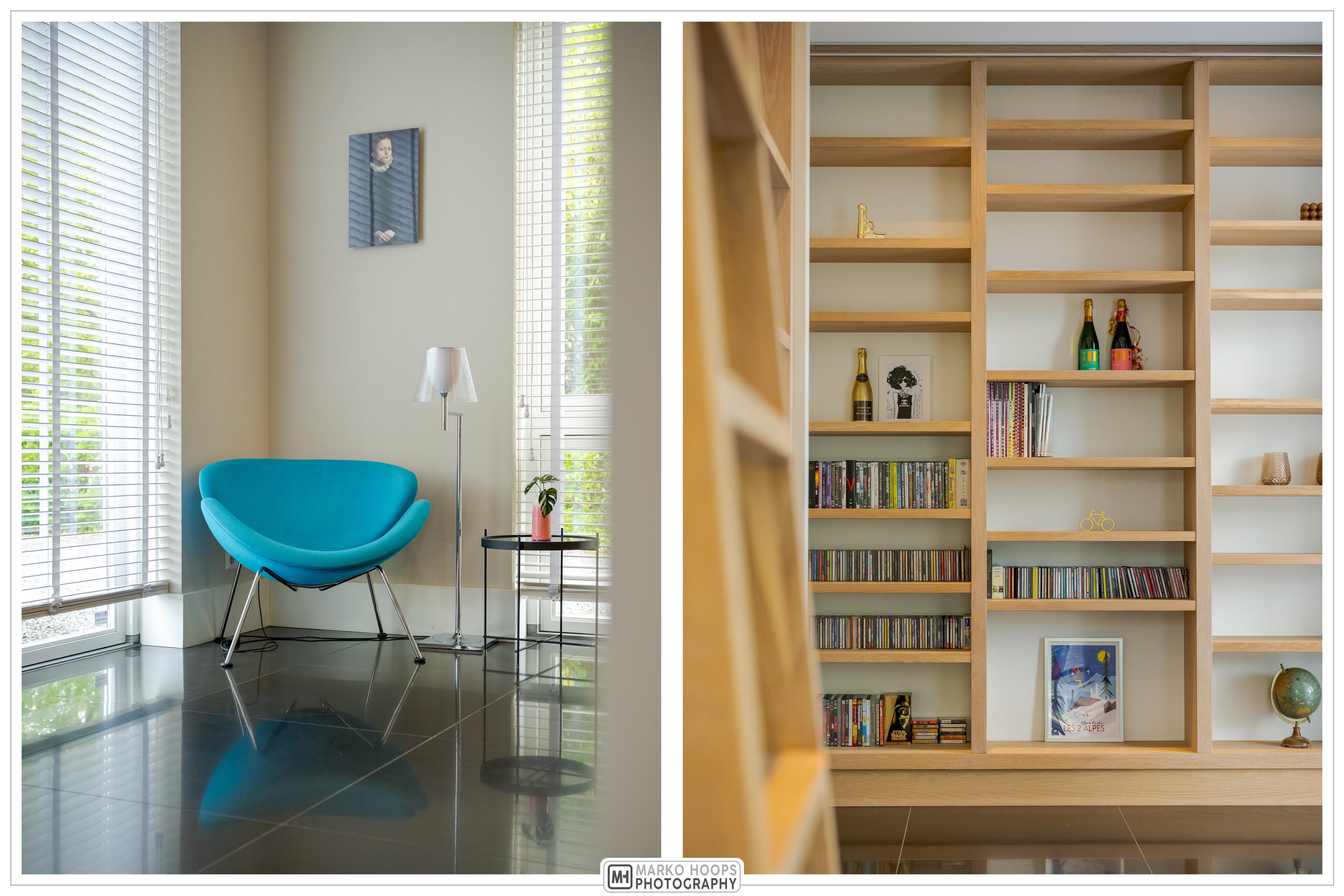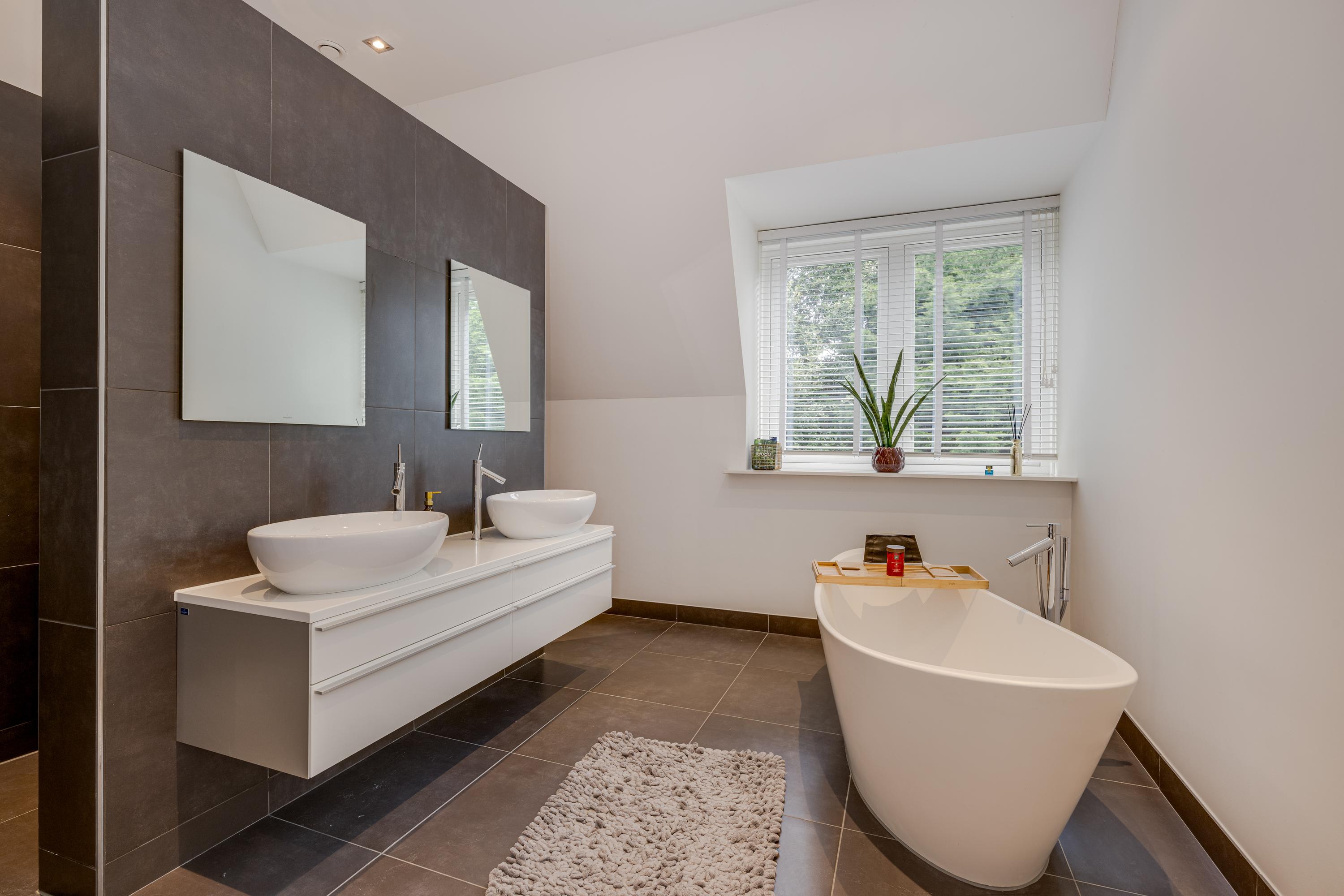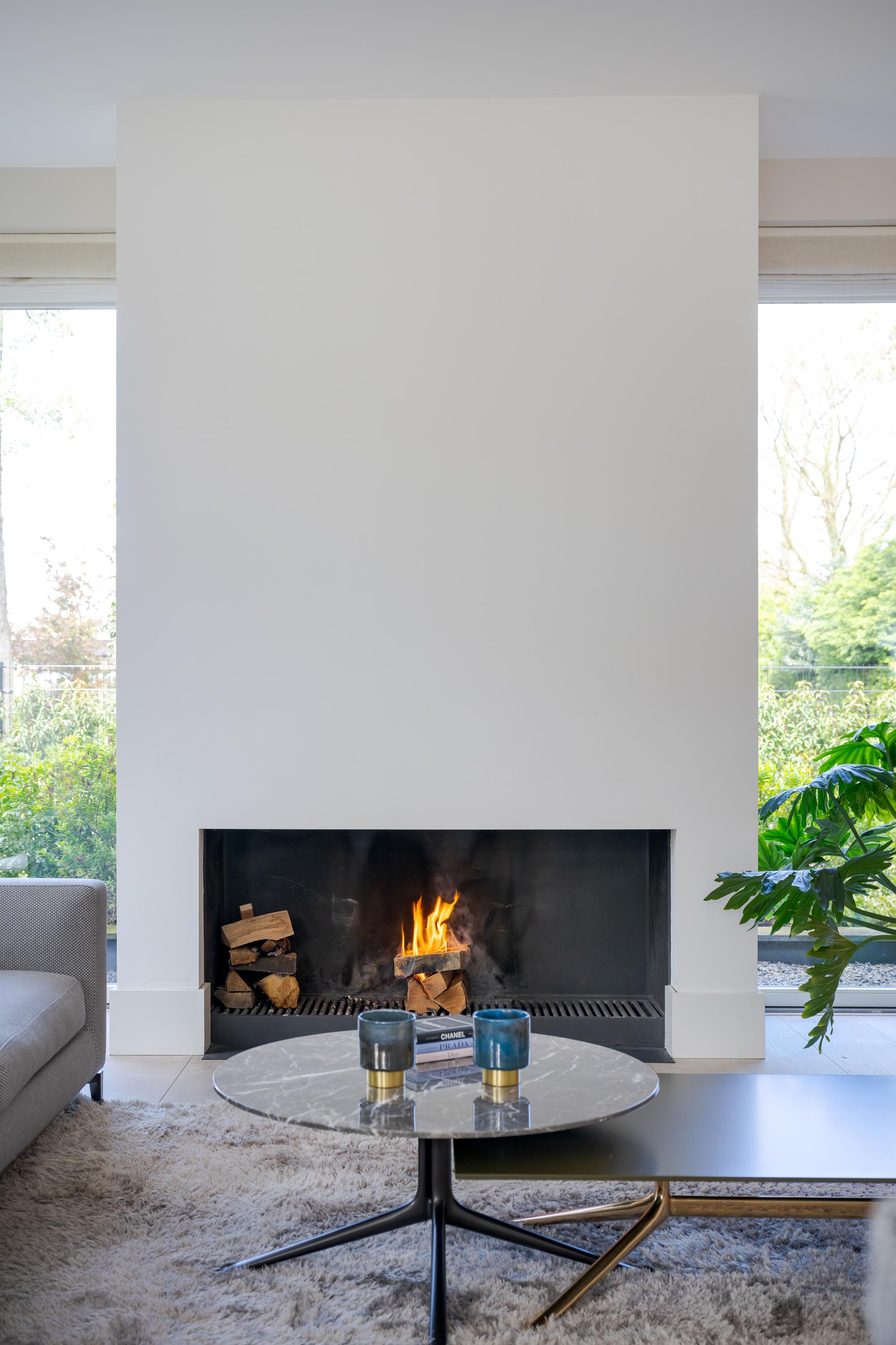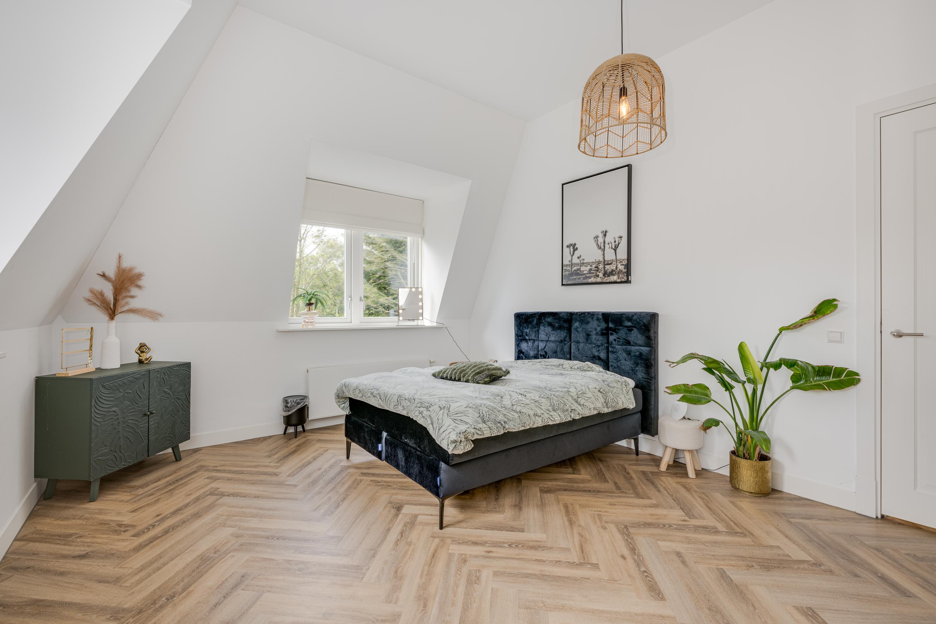 The modern kitchen is equipped with all desirable equipment, with the cooking island having a double sink, dishwasher, refrigerator and a gas and induction hob. The high wall provides space for the steam oven, combination microwave oven and coffee machine. In addition to cooking, the kitchen offers space for a very spacious dining table with a cozy gas fireplace. The double doors from the kitchen give access to the spacious terrace. Next to the kitchen is the utility room, equipped with a sink, plenty of cupboard space and a door to the garden.