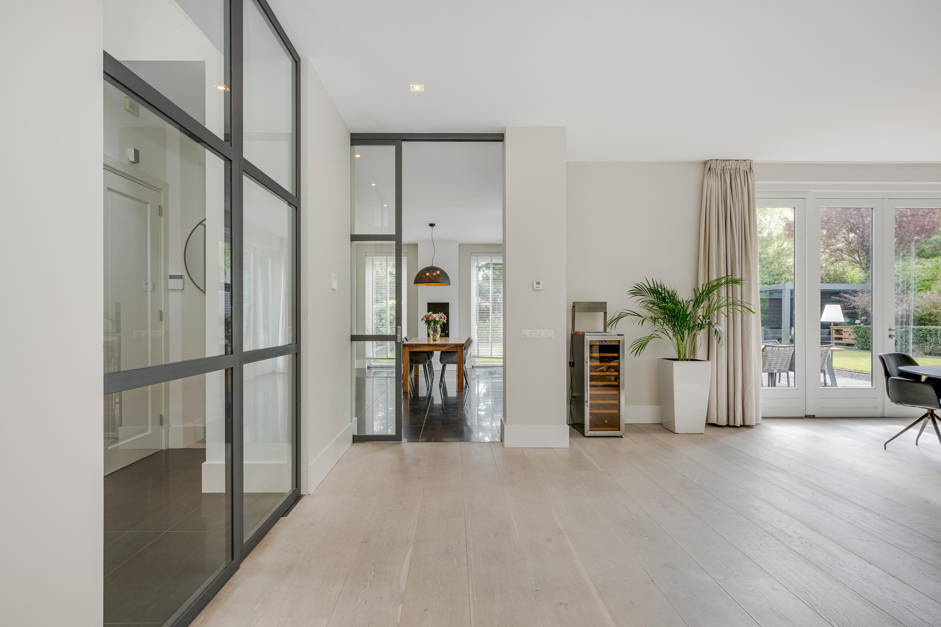 The landing with double entrance doors gives access to the spacious hall in which the stairwell and loft are centrally located. In the hall you will also find the guest toilet, a spacious wardrobe and the meter cupboard. The stairs that lead to the basement and the landing stairs to the upper floor are also located here. The double glass doors offer a view into the modern living room.