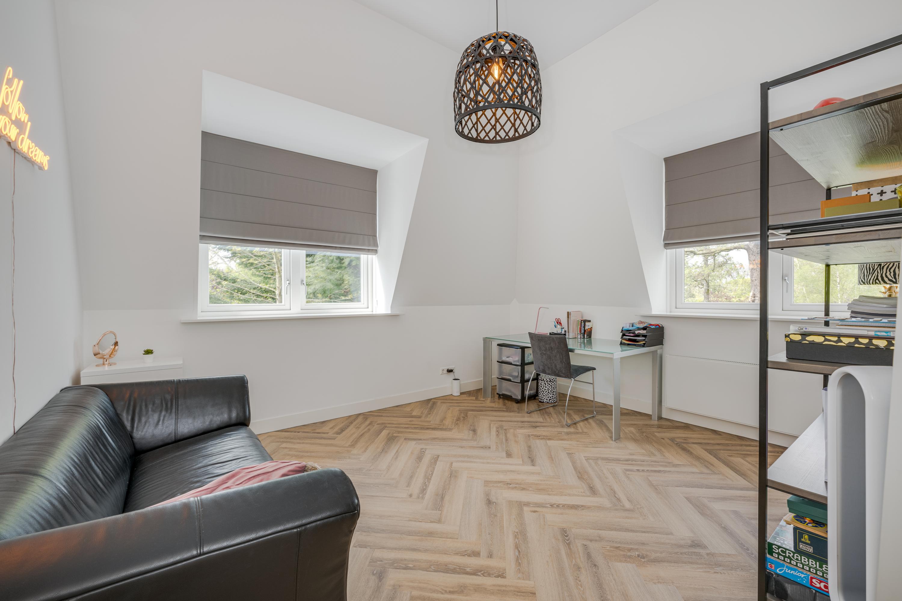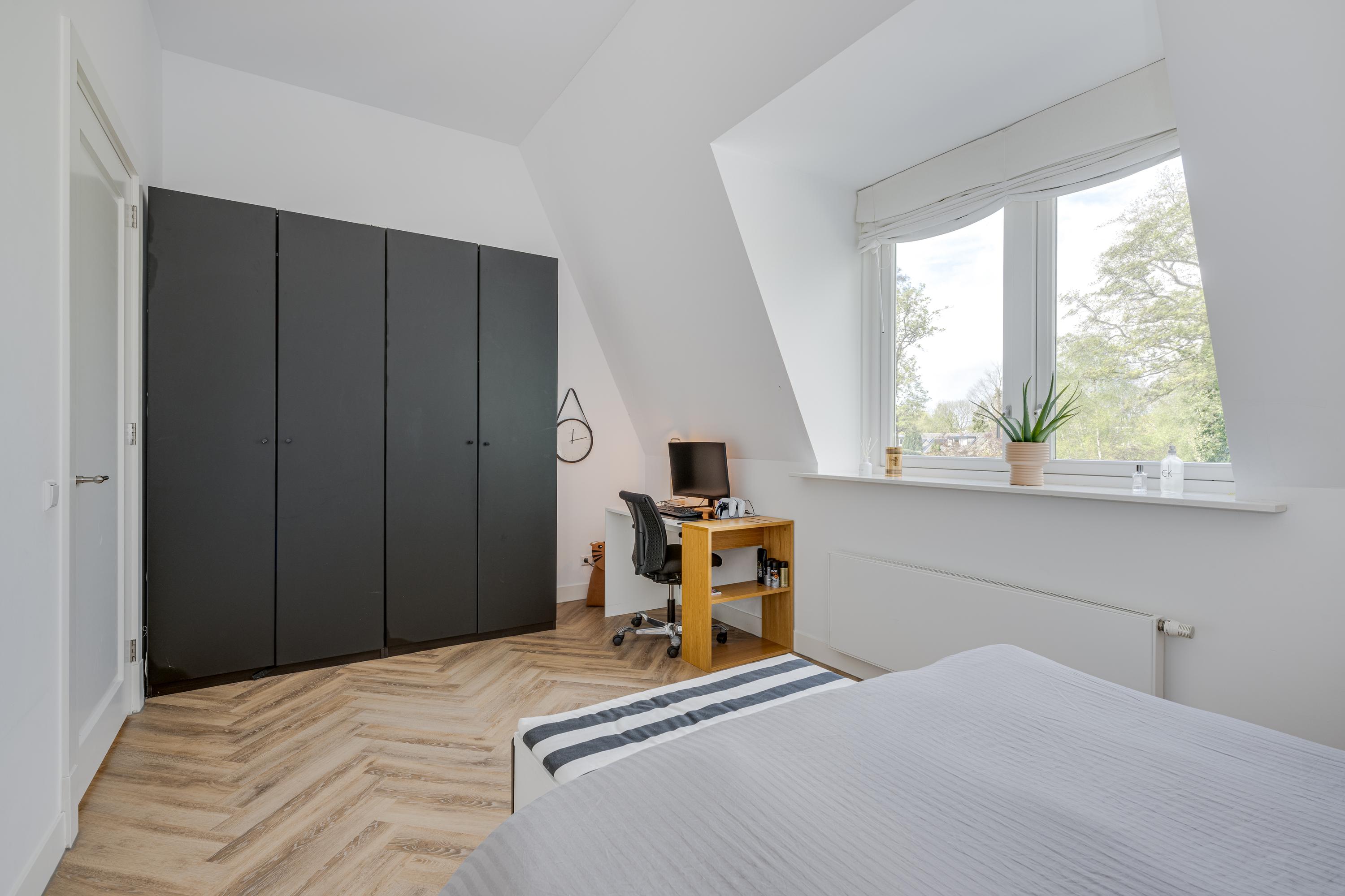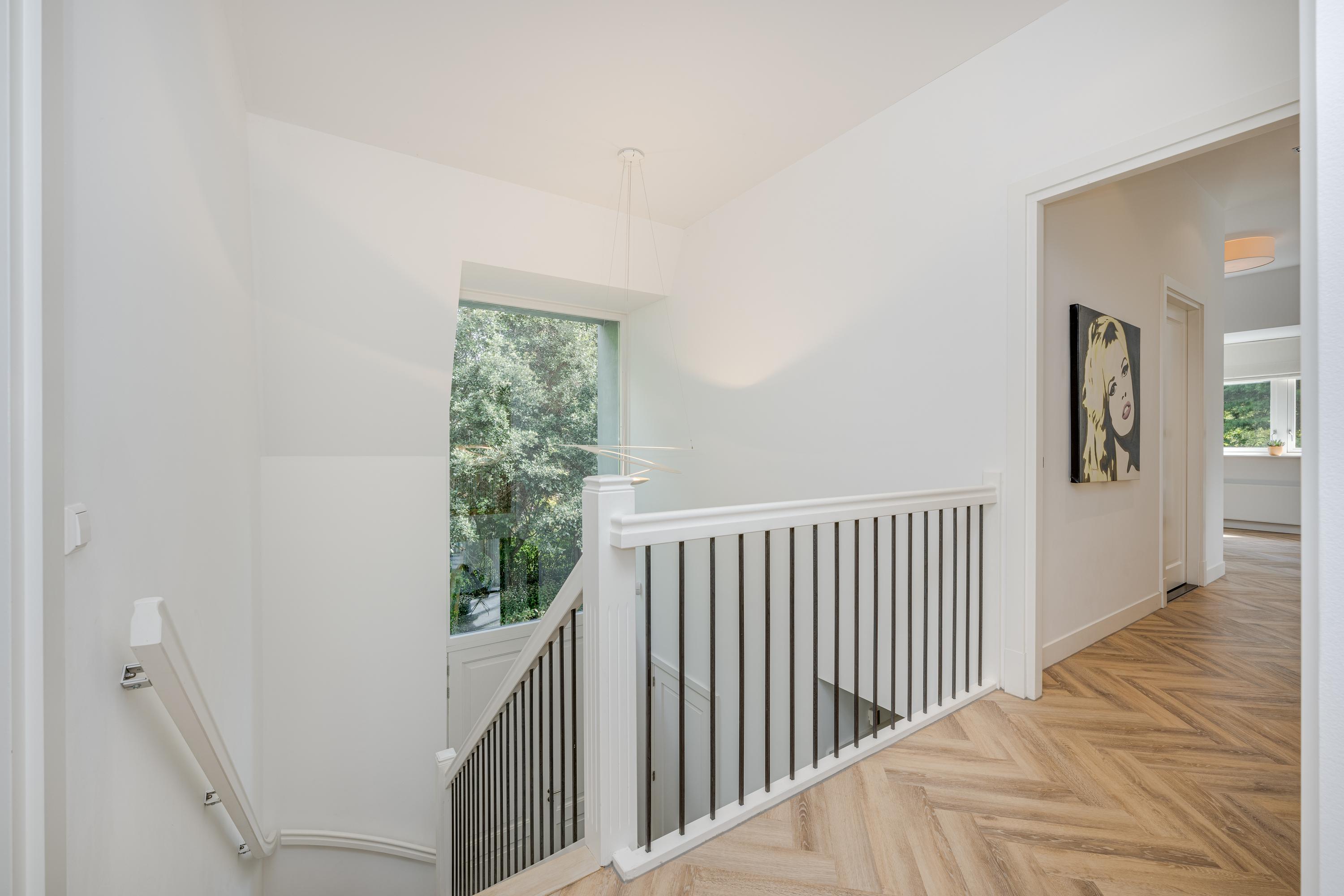 Via the beautiful stairs you reach the landing with beautiful high doors that provide access to the various rooms. Behind these doors there are a total of four large bedrooms, two bathrooms, the technical room and a room for the washing and drying facilities. Of the four bedrooms, three are used as a children's room with a shared bathroom with a double sink and a walk-in shower with rain and hand shower. There is also a separate toilet on the landing.