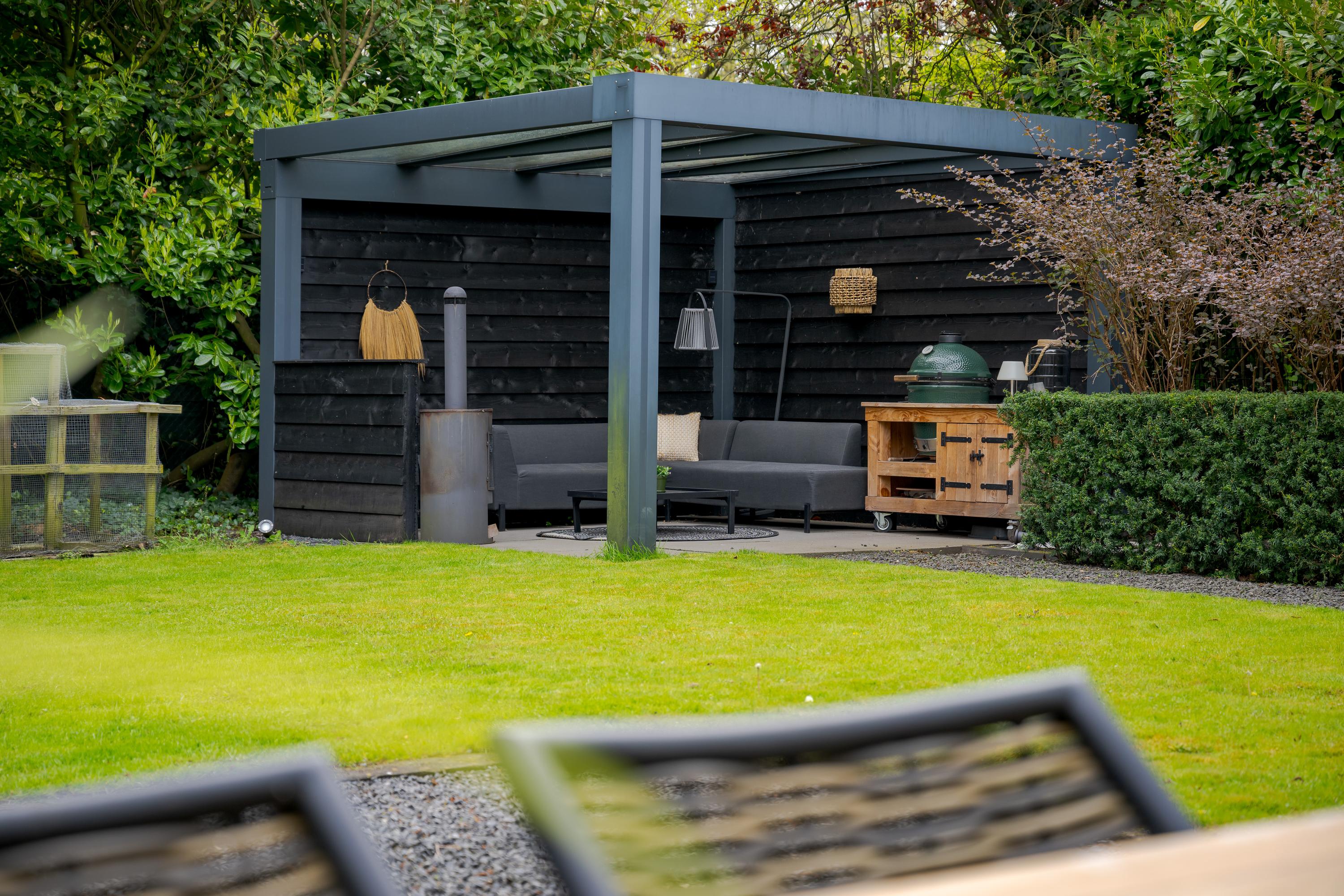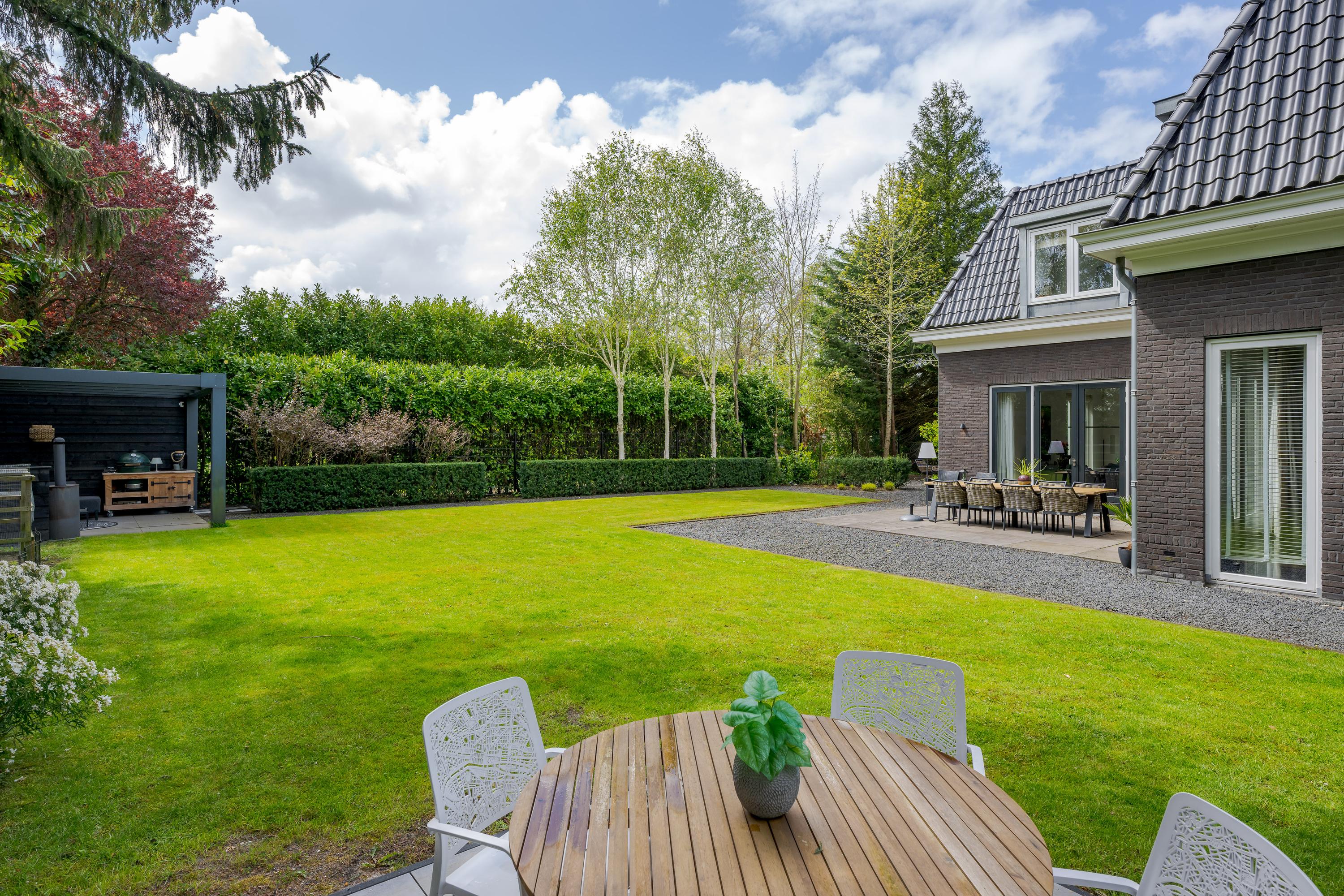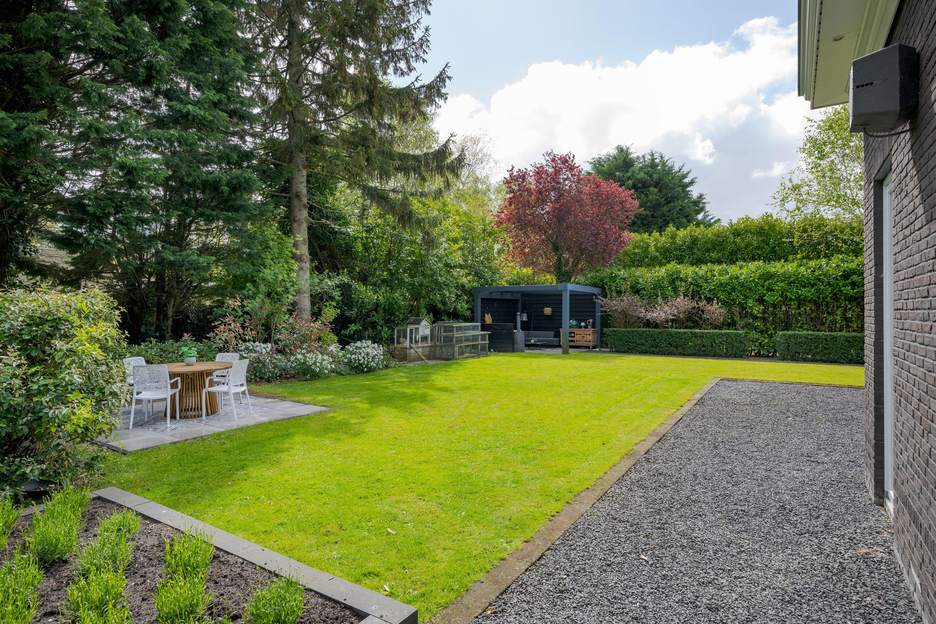 The garden has a very favorable sunny position. The sun shines on the plot from early in the morning until late in the evening. At the back of the garden is a seating area with a canopy and outdoor kitchen, a wonderfully sheltered place to have a BBQ or drink a nice glass of wine in the summer. The large terrace adjacent to the lawn faces south and various seating areas have been created around the house, so that you can enjoy the sun or shade at any time of the day.