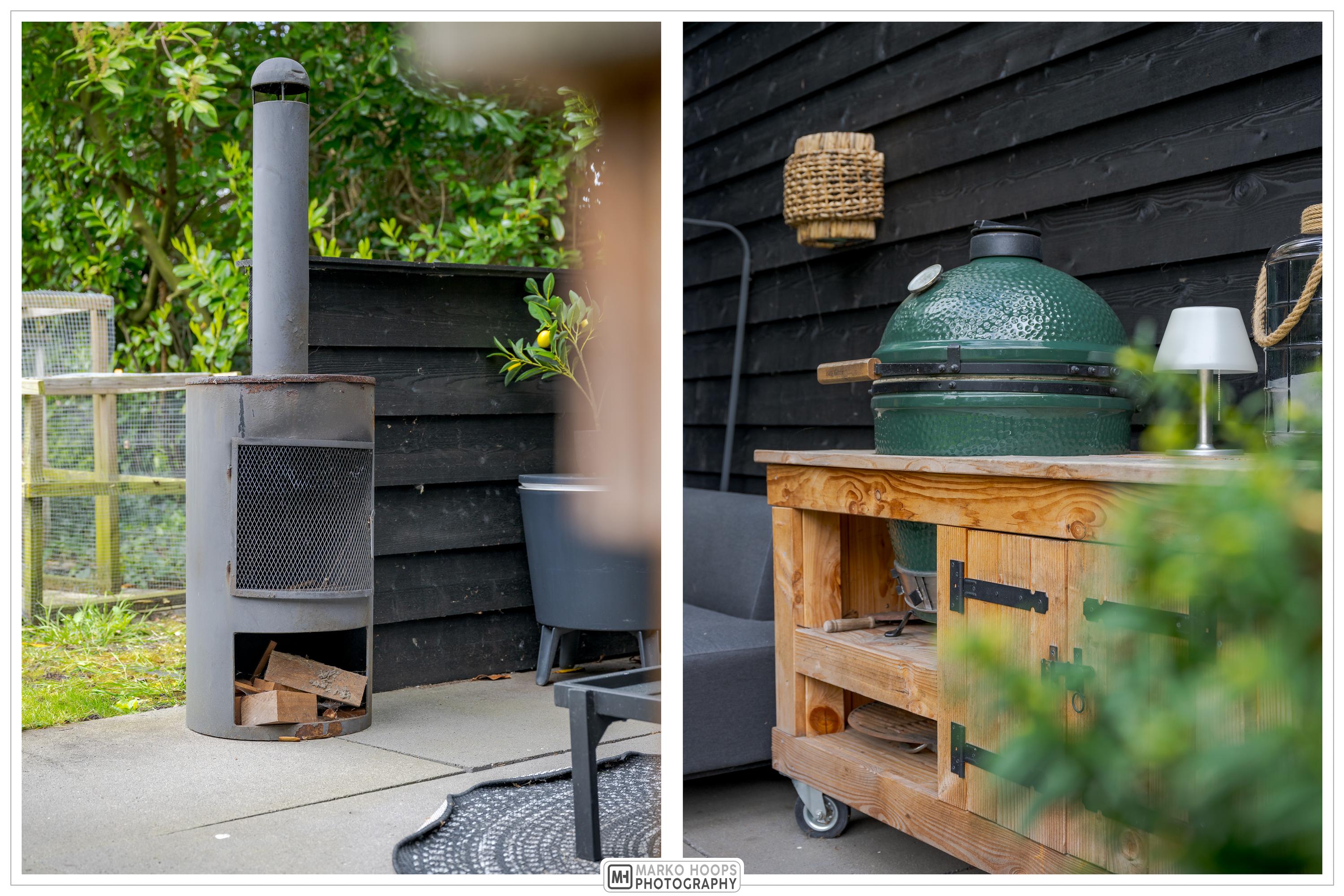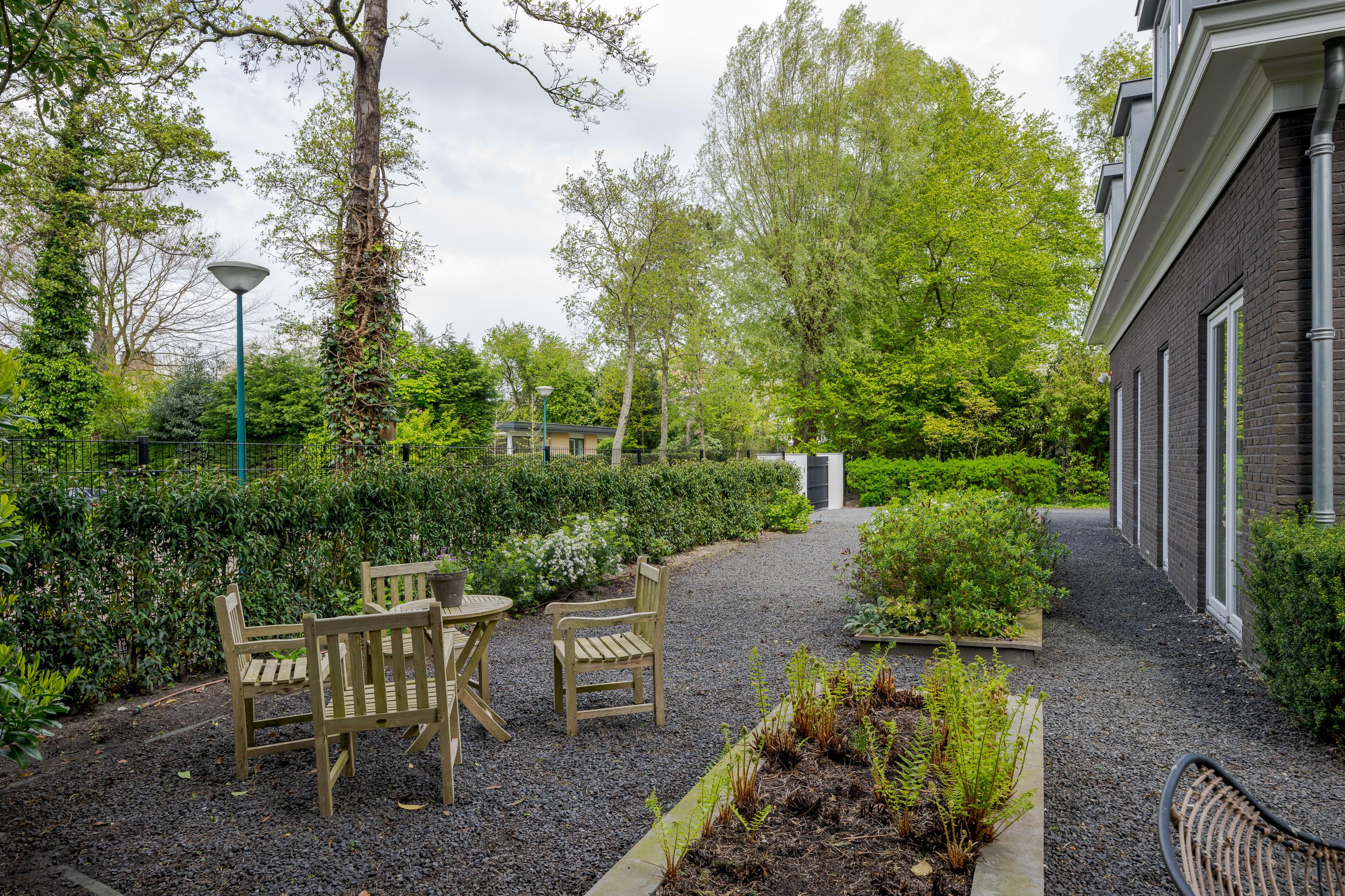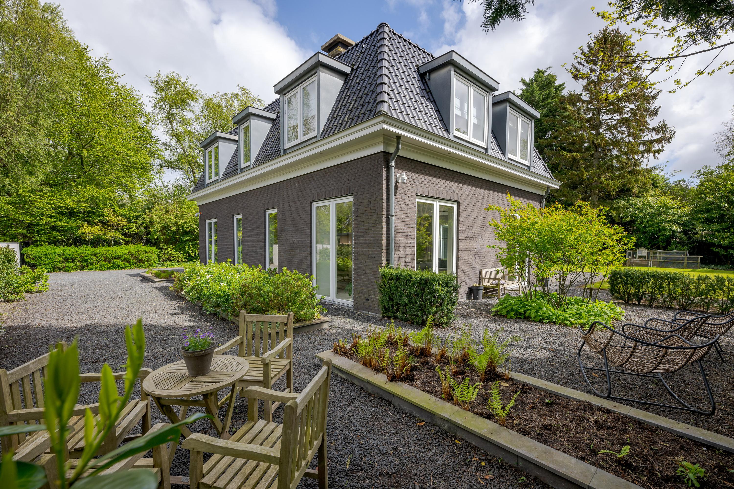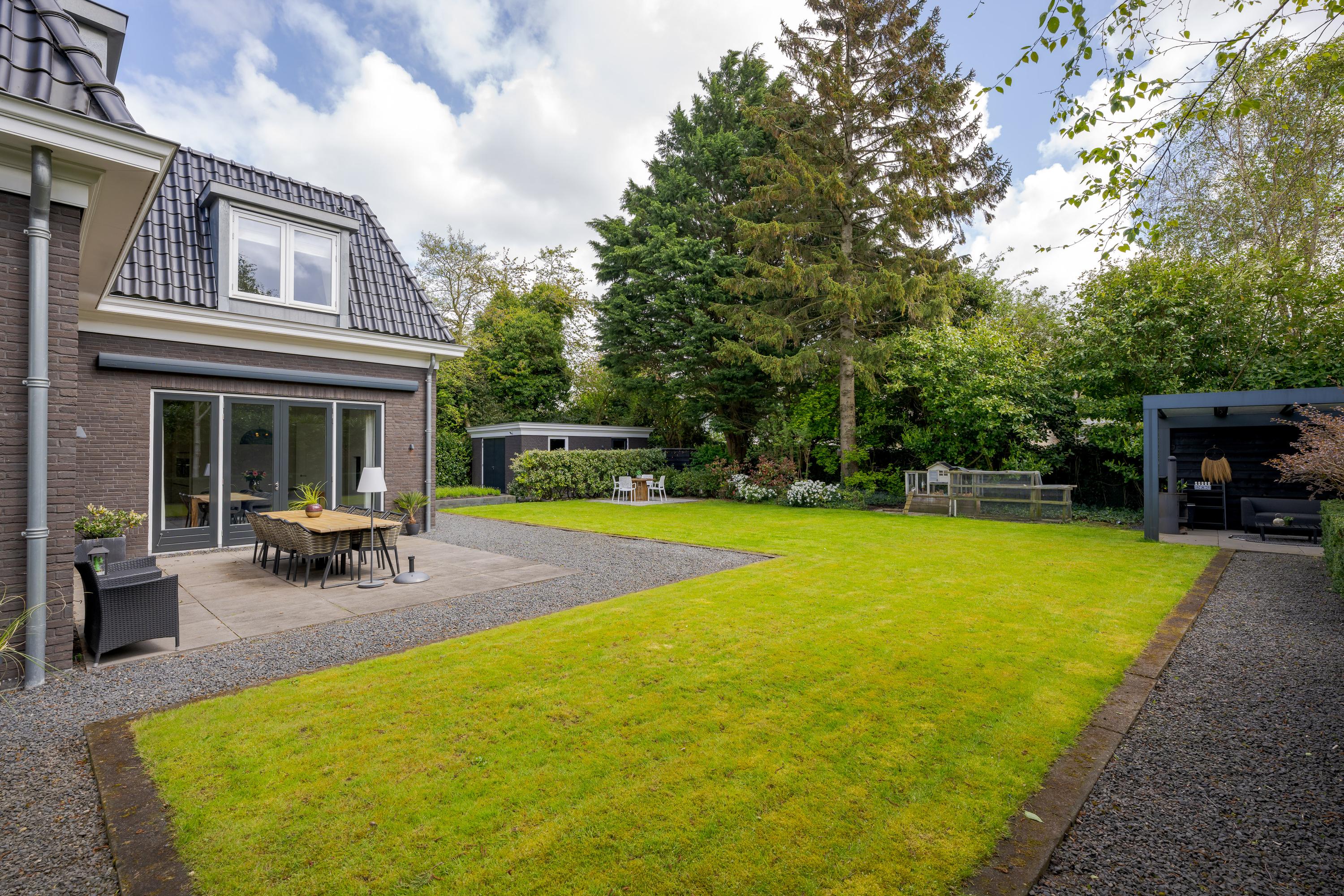 The garden has a very favorable sunny position. The sun shines on the plot from early in the morning until late in the evening. At the back of the garden is a seating area with a canopy and outdoor kitchen, a wonderfully sheltered place to have a BBQ or drink a nice glass of wine in the summer. The large terrace adjacent to the lawn faces south and various seating areas have been created around the house, so that you can enjoy the sun or shade at any time of the day.