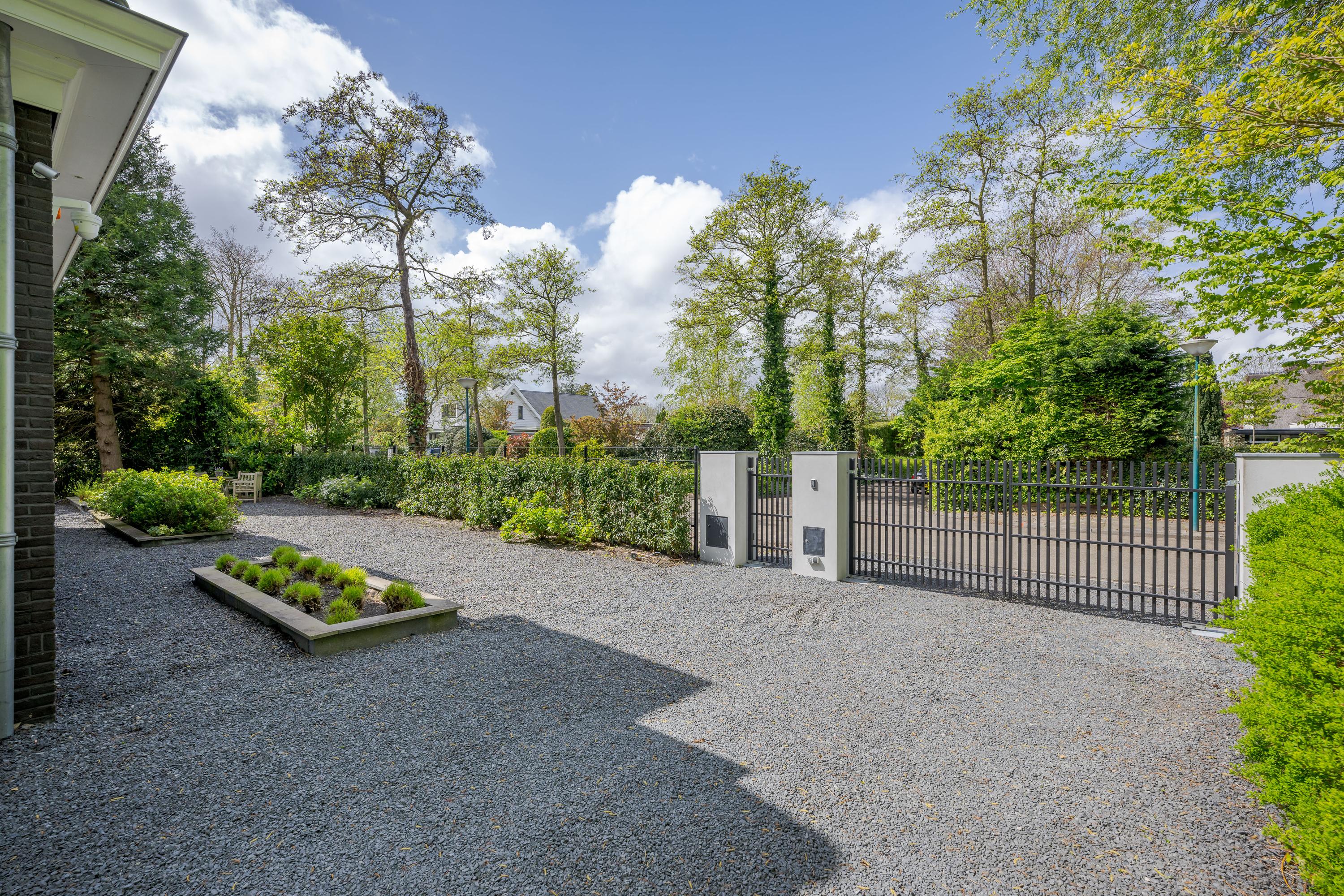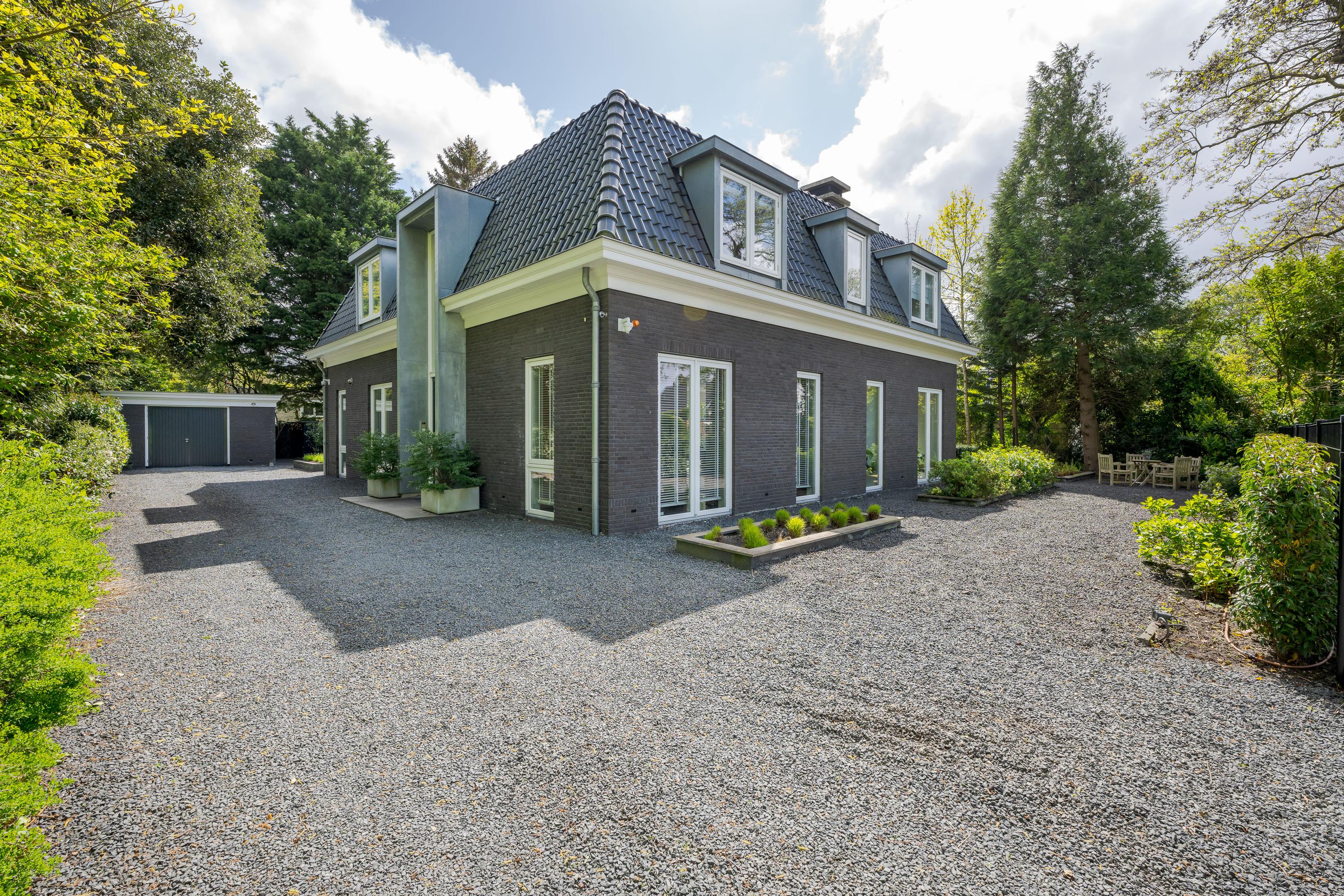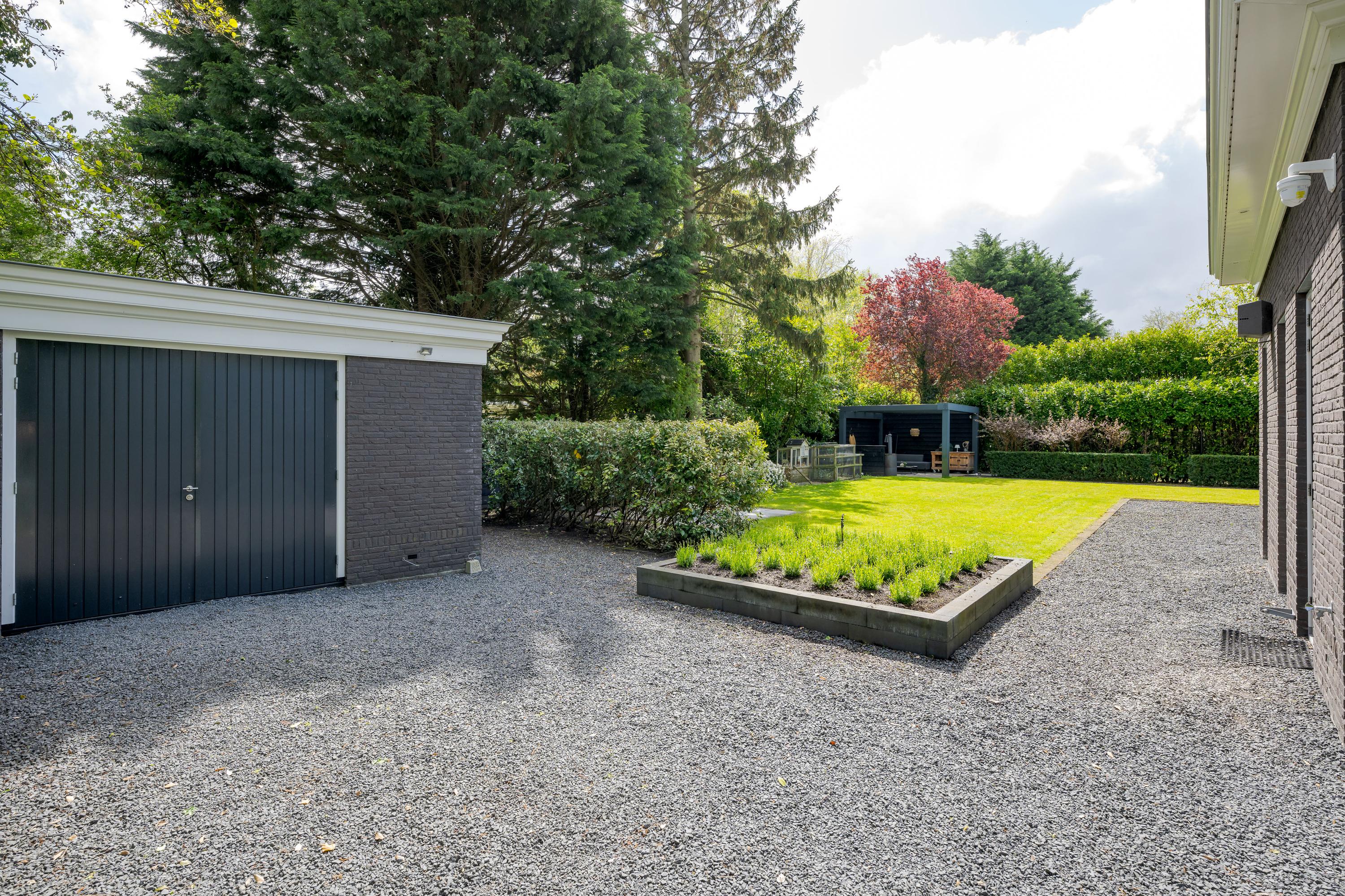 The driveway to the garage is accessible through the electric gate and offers space for several cars. At the back of the driveway is the garage, which has double doors, a window and a side door. The garage is suitable for a car, as well as bicycles and garden tools. The waste containers are located behind the garage.