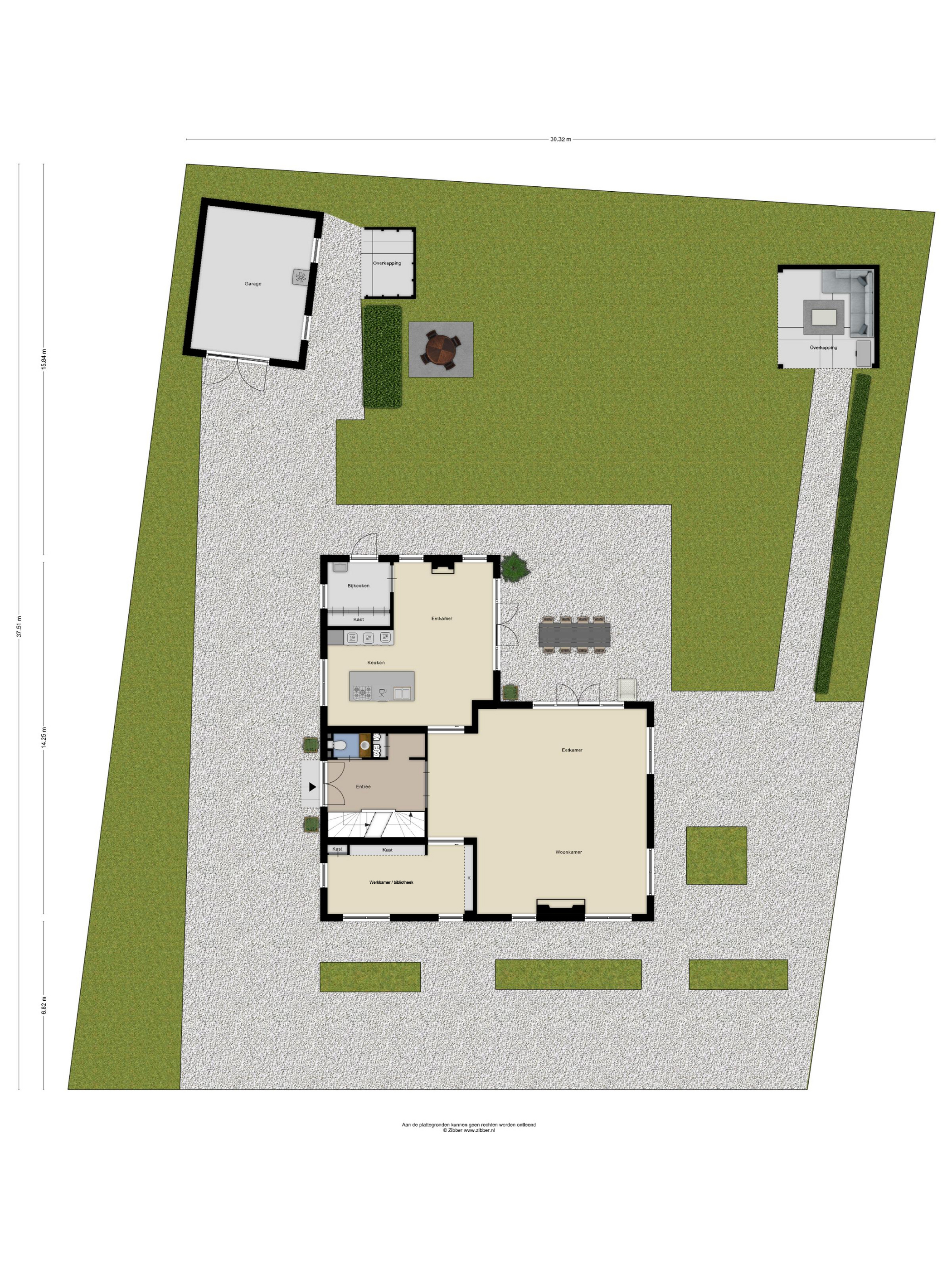 The garden is completely enclosed by a fence and equipped with an irrigation system and garden lighting. There are outdoor taps in several places on the facade.