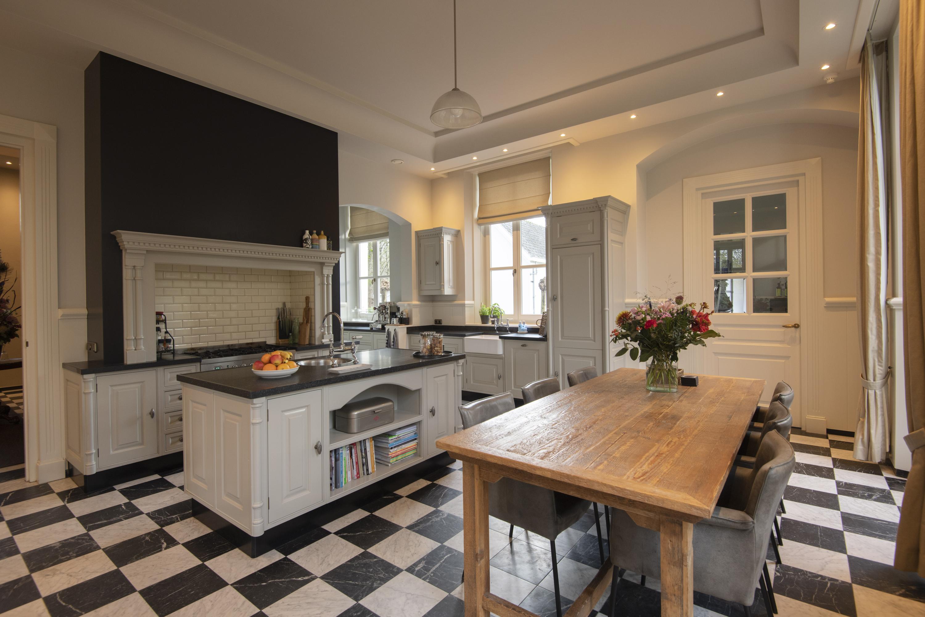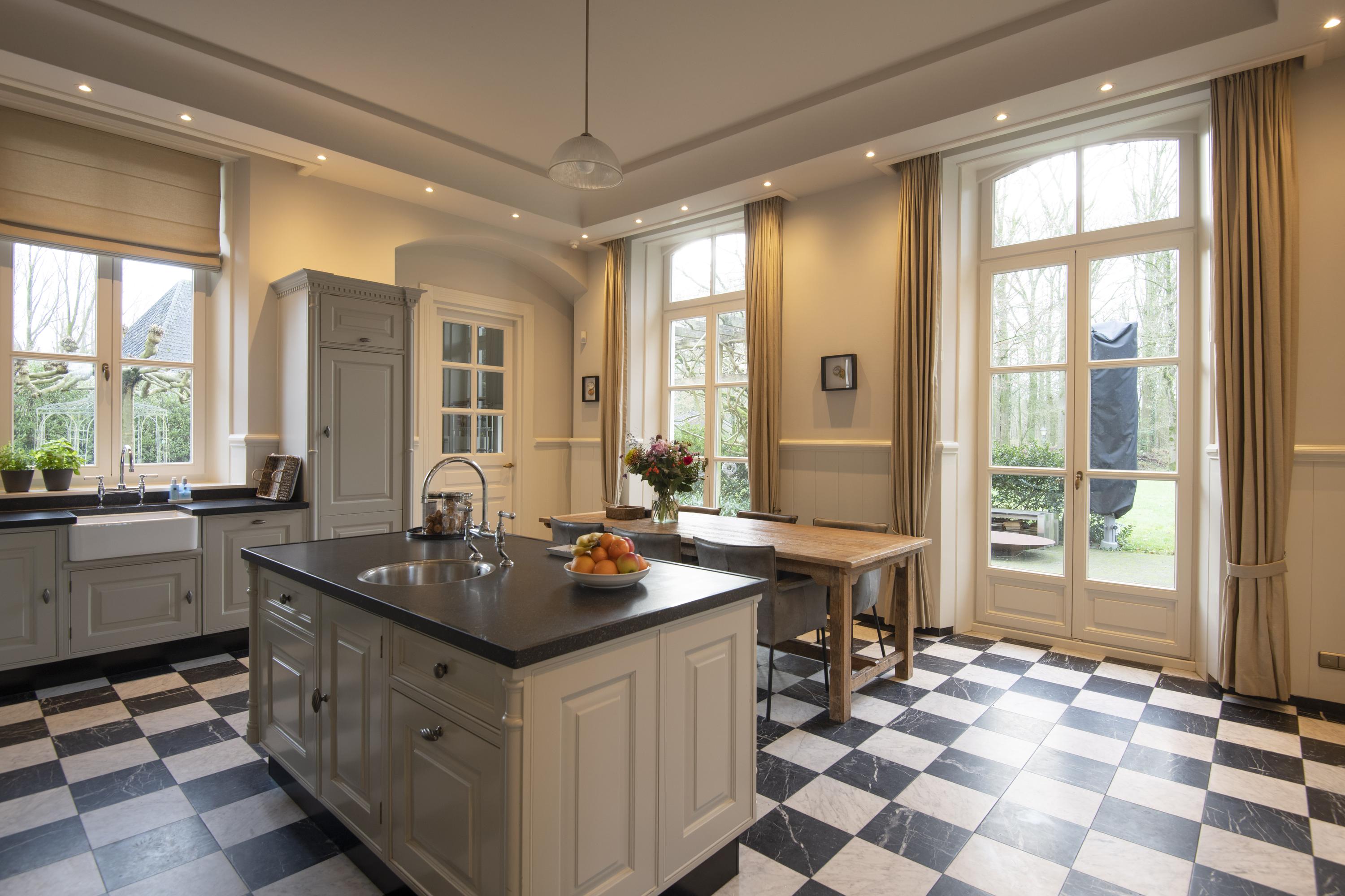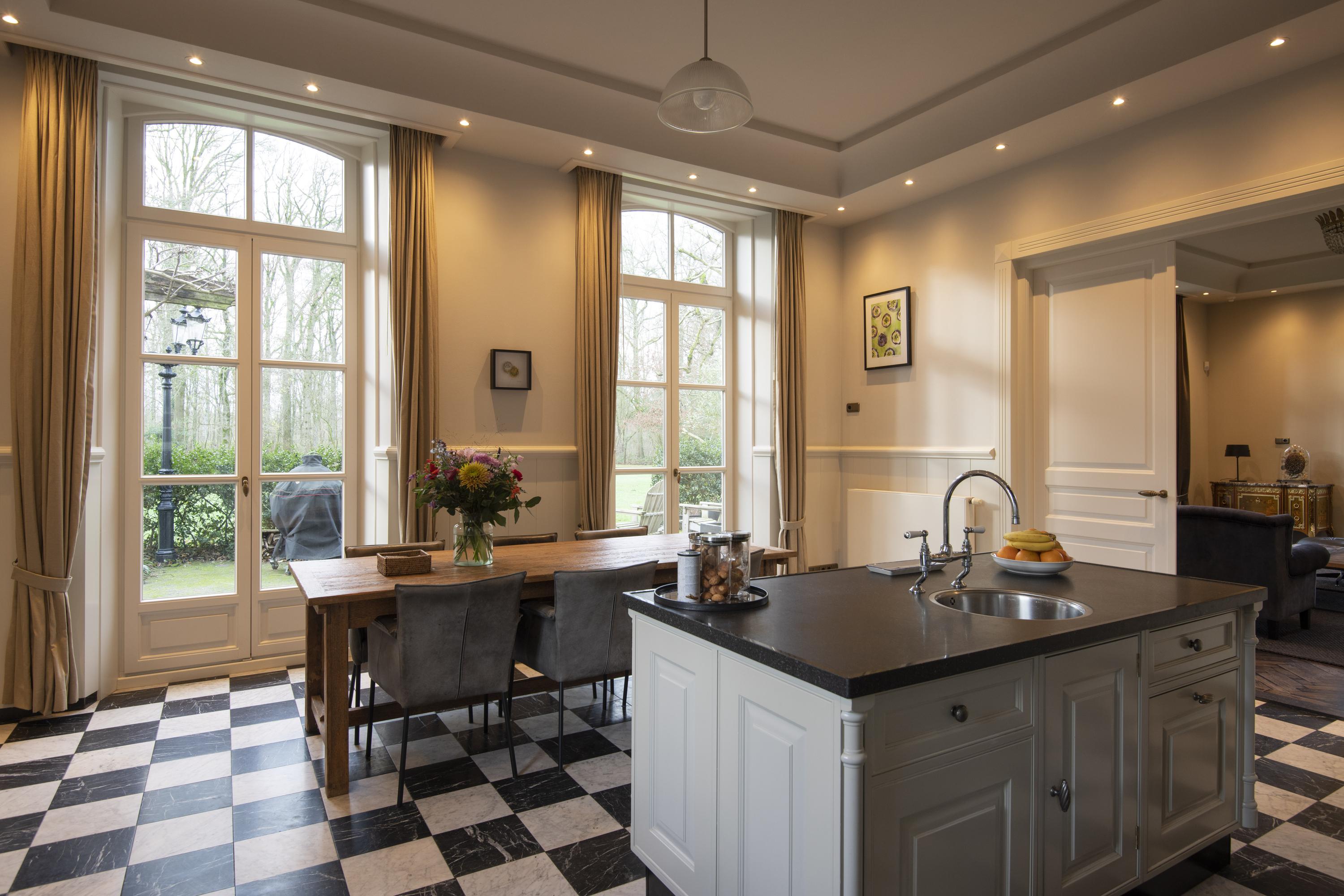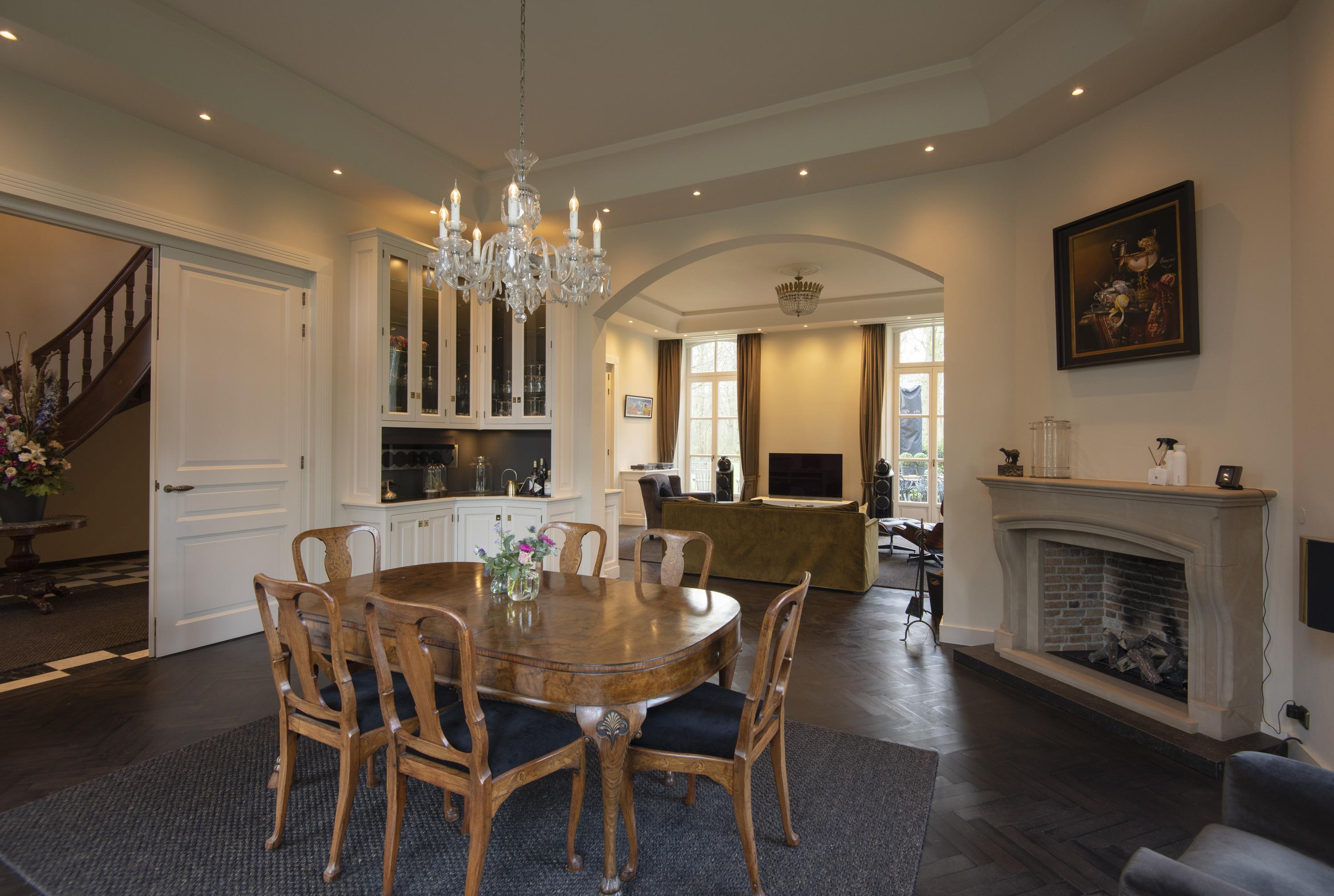 The completely nature-oriented living room consists of a sitting room and a dining room. There are two fireplaces and four pairs of French doors to the garden. The 3.60m high stucco ceilings combined with the amount of light through the high windows create a magnificent spatial experience. Double doors lead into the cozy eat-in kitchen. This fully equipped kitchen is furnished with a classic Tinello kitchen unit with a natural stone worktop, sink island and high-quality appliances. In the tower adjacent to the kitchen diner is a pantry. In the living kitchen are two pairs of double doors to the garden. The entire first floor has underfloor heating.
