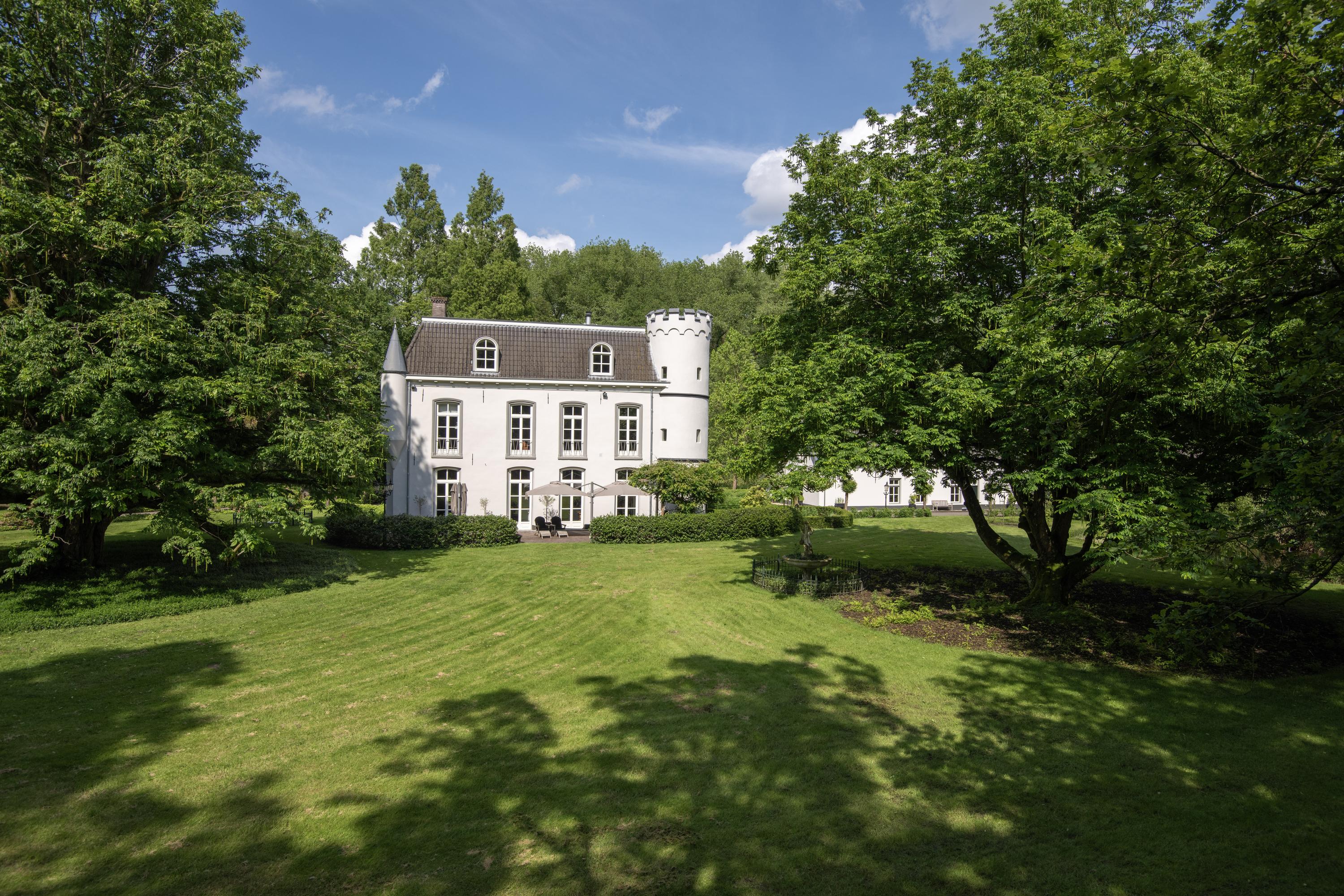 The manor house is characterised by white rendered façades, hipped roofs, corner turrets and one round corner tower with battlements. Although the original year of construction cannot be determined precisely, its history dates back to approximately 1864. In 1998, the manor house was largely destroyed by fire and subsequently rebuilt with great craftsmanship, care and attention, and fully renovated, modernised and made more sustainable. Among other features, the presence of 40 solar panels and two heat pumps has resulted in an exceptional A+ energy label.