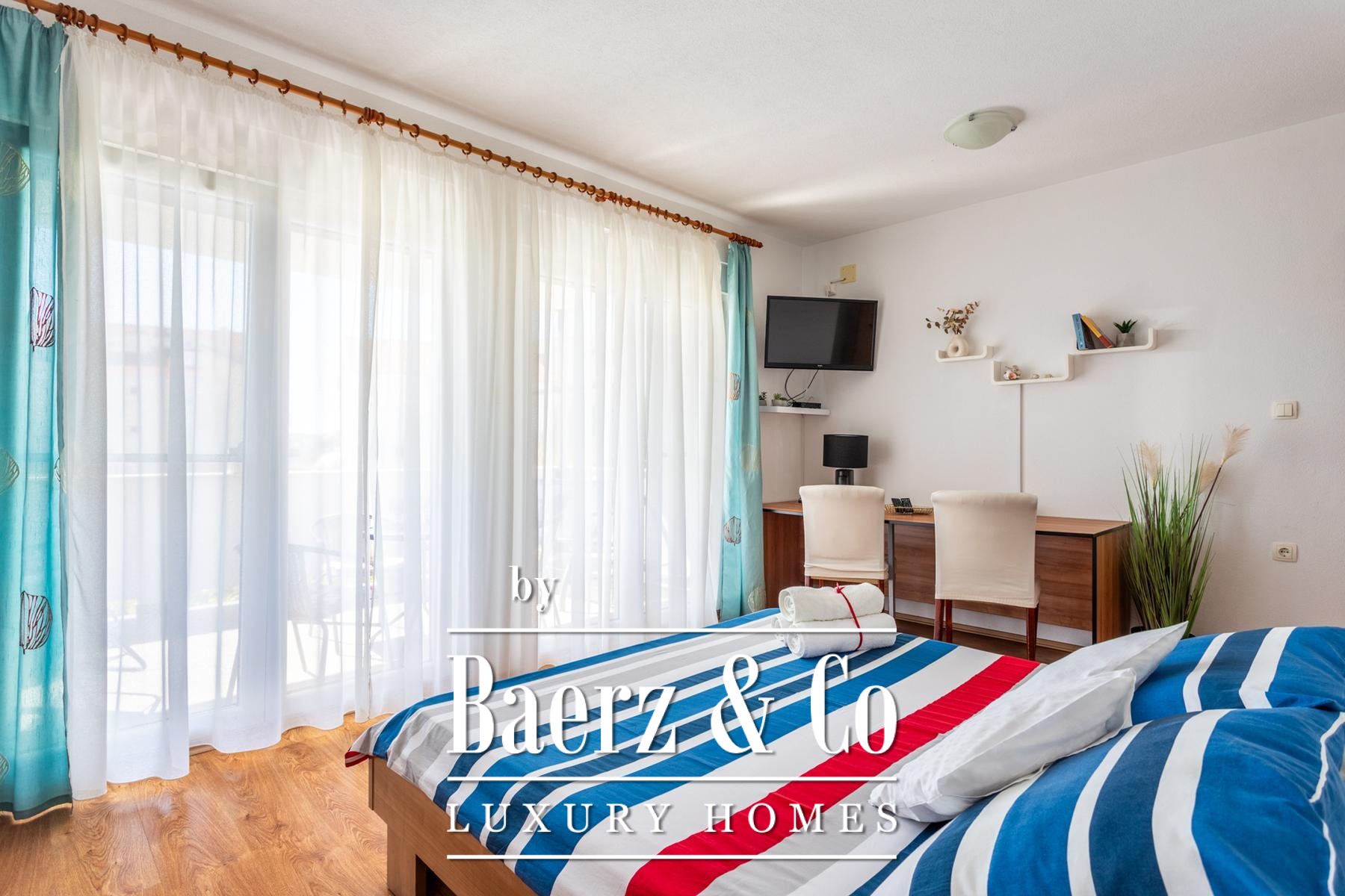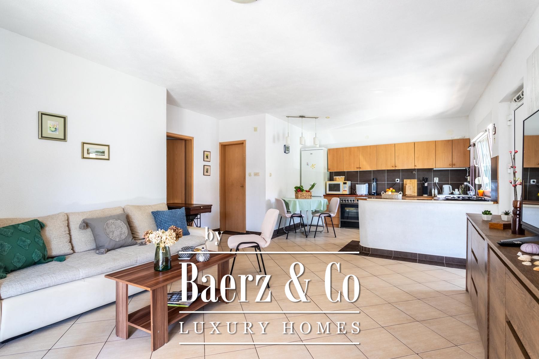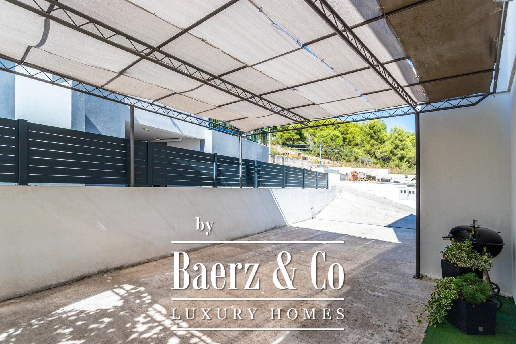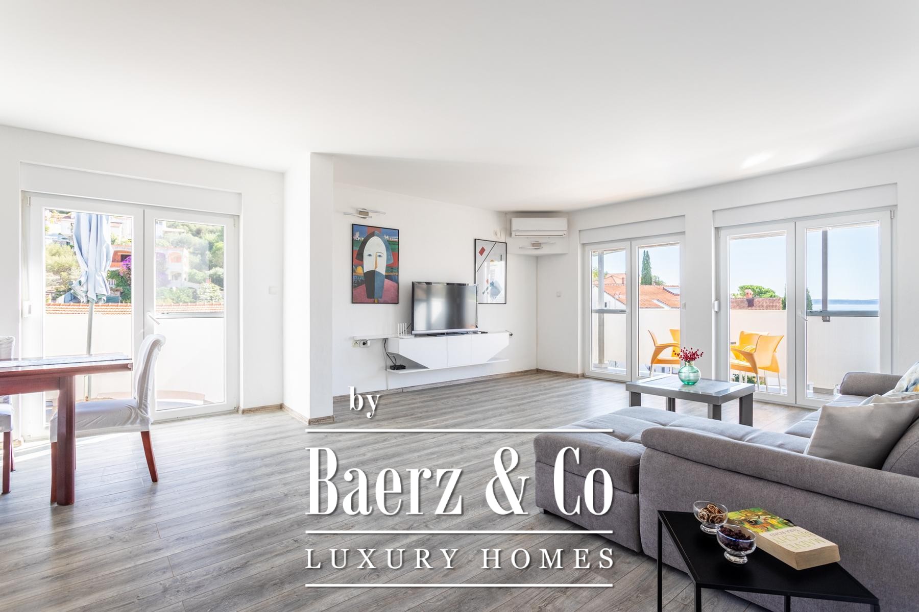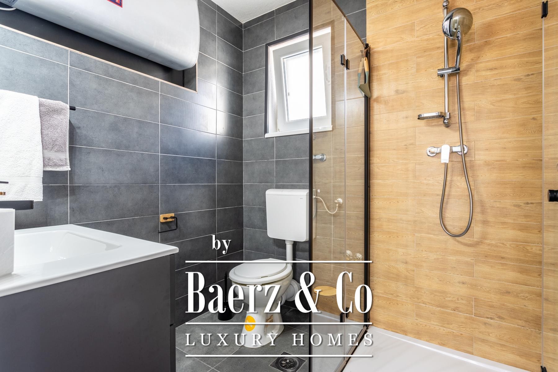 Ground floor: comprises a spacious one-bedroom apartment and a beautifully landscaped yard. The apartment includes a living room, kitchen with dining area, a large bedroom, bathroom, and a covered terrace with a dining table.Outdoor space features a well-maintained Mediterranean garden with olive trees, rosemary, grapevines, palms, and a variety of flowers, creating an ideal setting for relaxation. There is also an outdoor kitchen equipped with a fireplace, sink, and oven - perfect for gatherings in the shade of the grapevine.The apartments face east, south, and west, ensuring plenty of sunlight throughout the day, while the higher floors offer beautiful sea views.Five parking spaces are available directly next to the house.Further information available upon request.