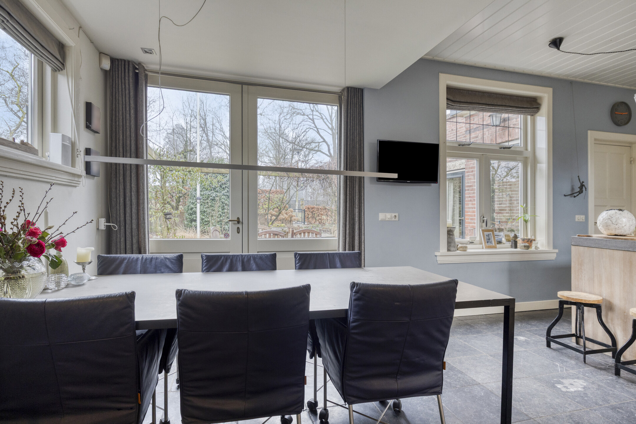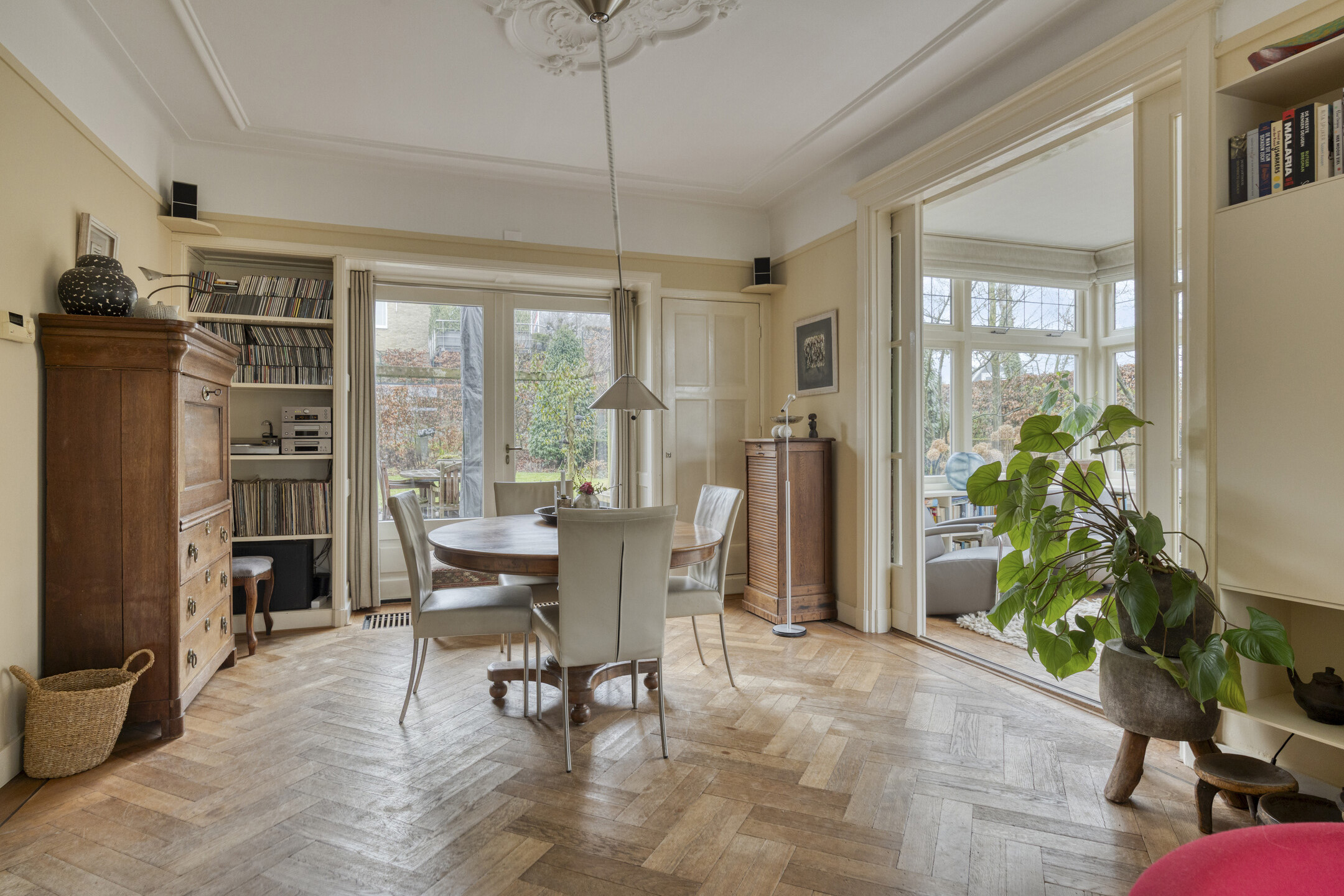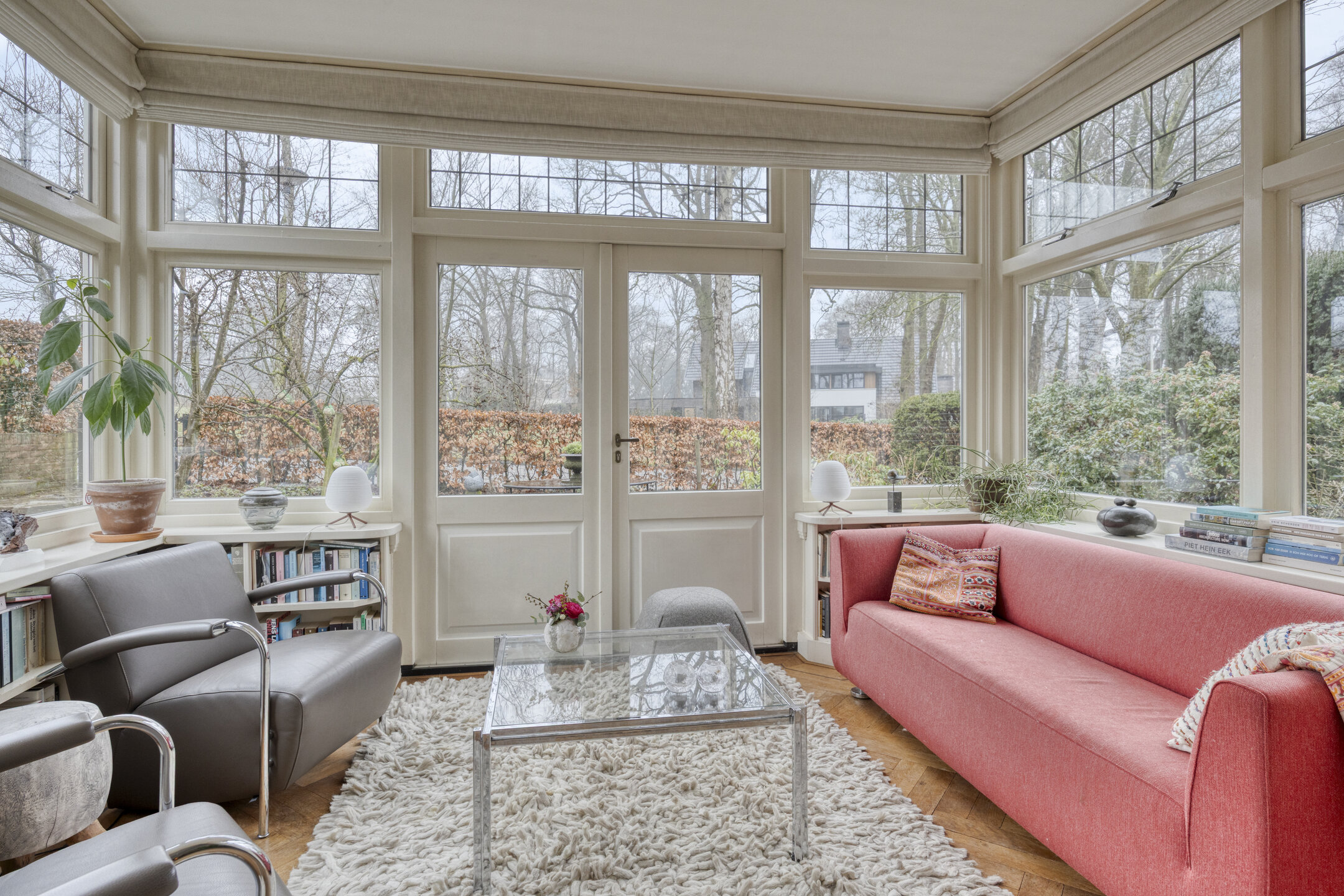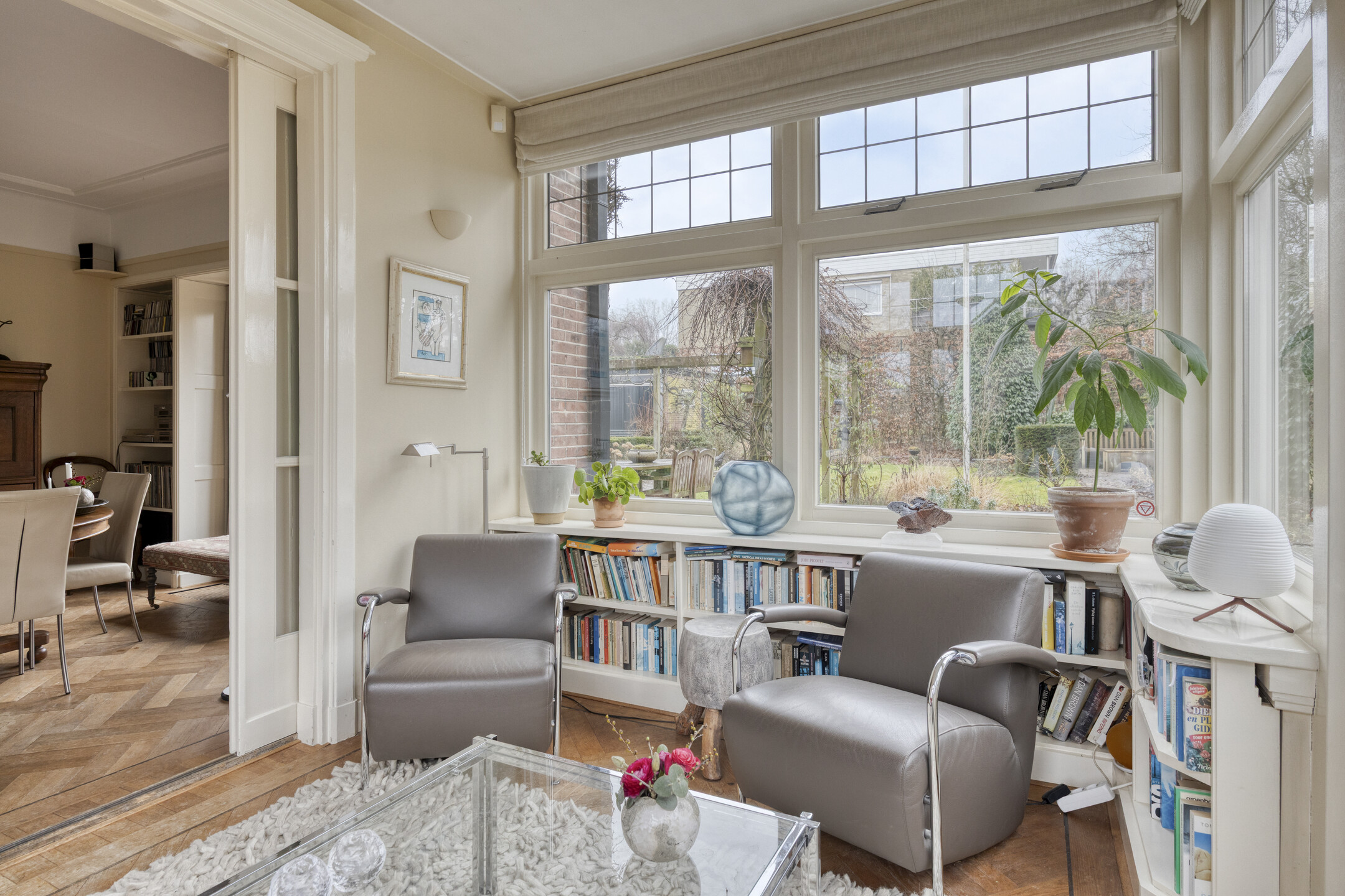 De ruime woonkamer heeft door de vele raampartijen en de karakteristieke erker een prachtige lichtinval. Vanuit de aangrenzende serre is er blijvend vrij uitzicht over het weiland. Zowel vanuit de woonkamer als vanuit de serre openen openslaande tuindeuren naar de royale tuin.