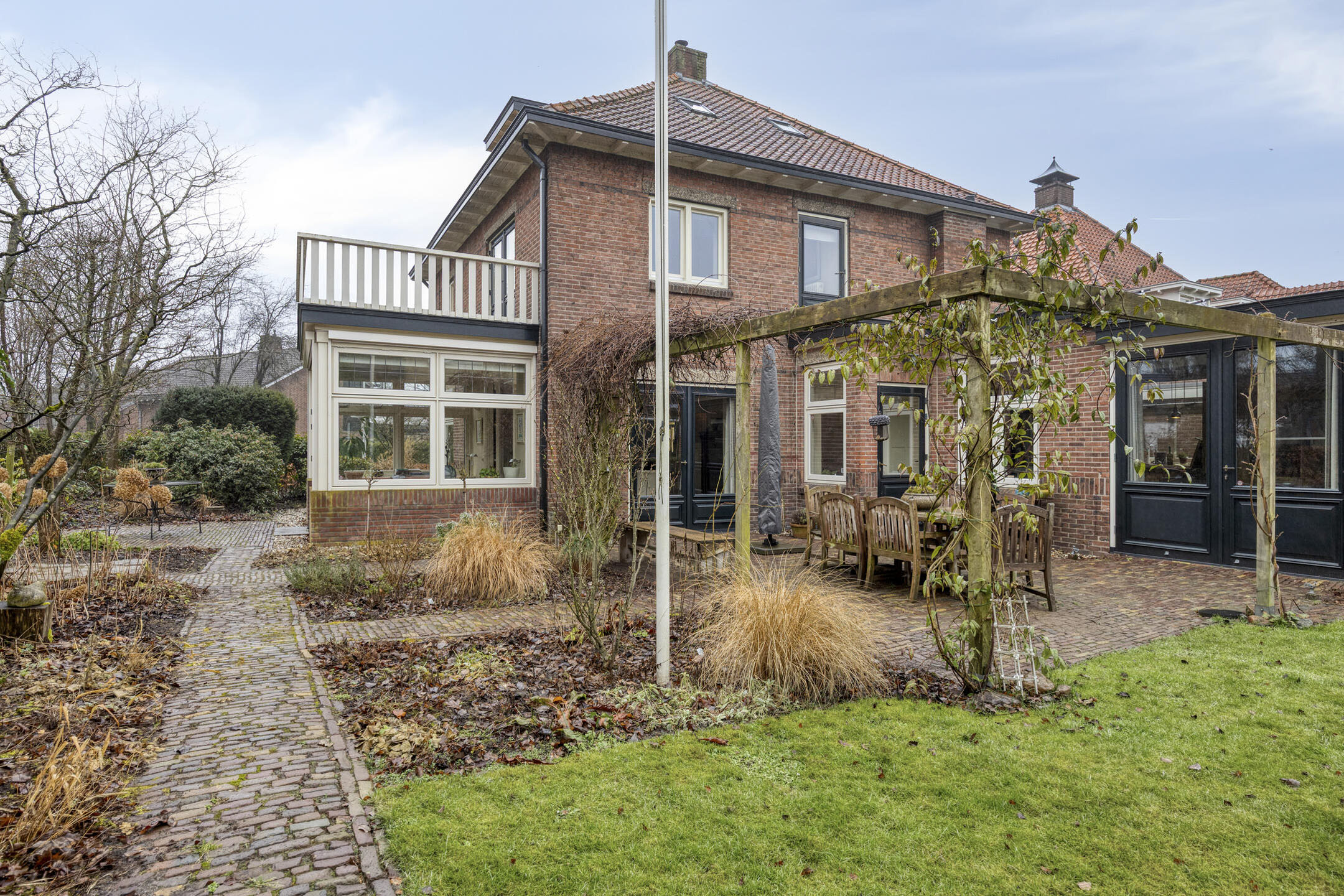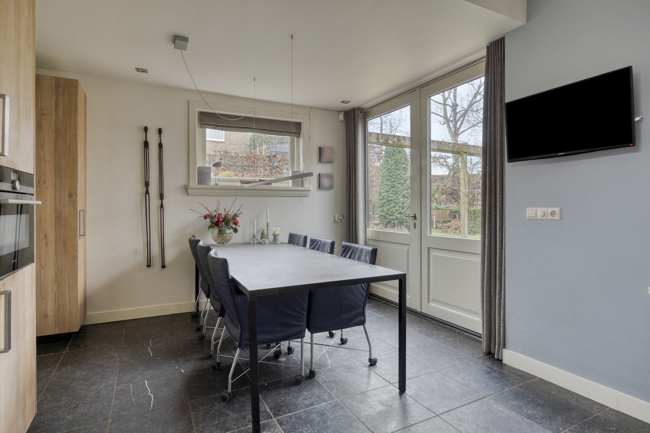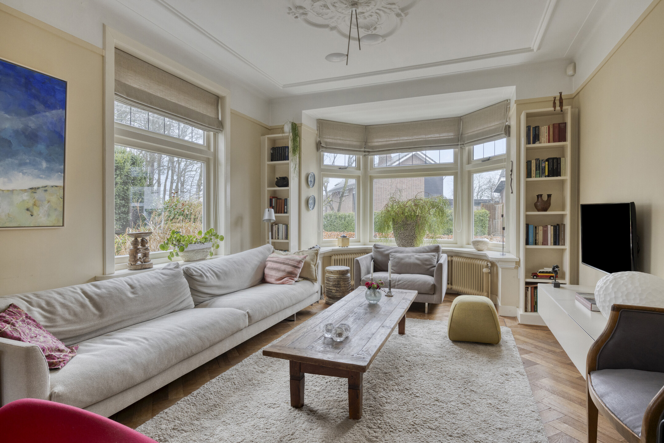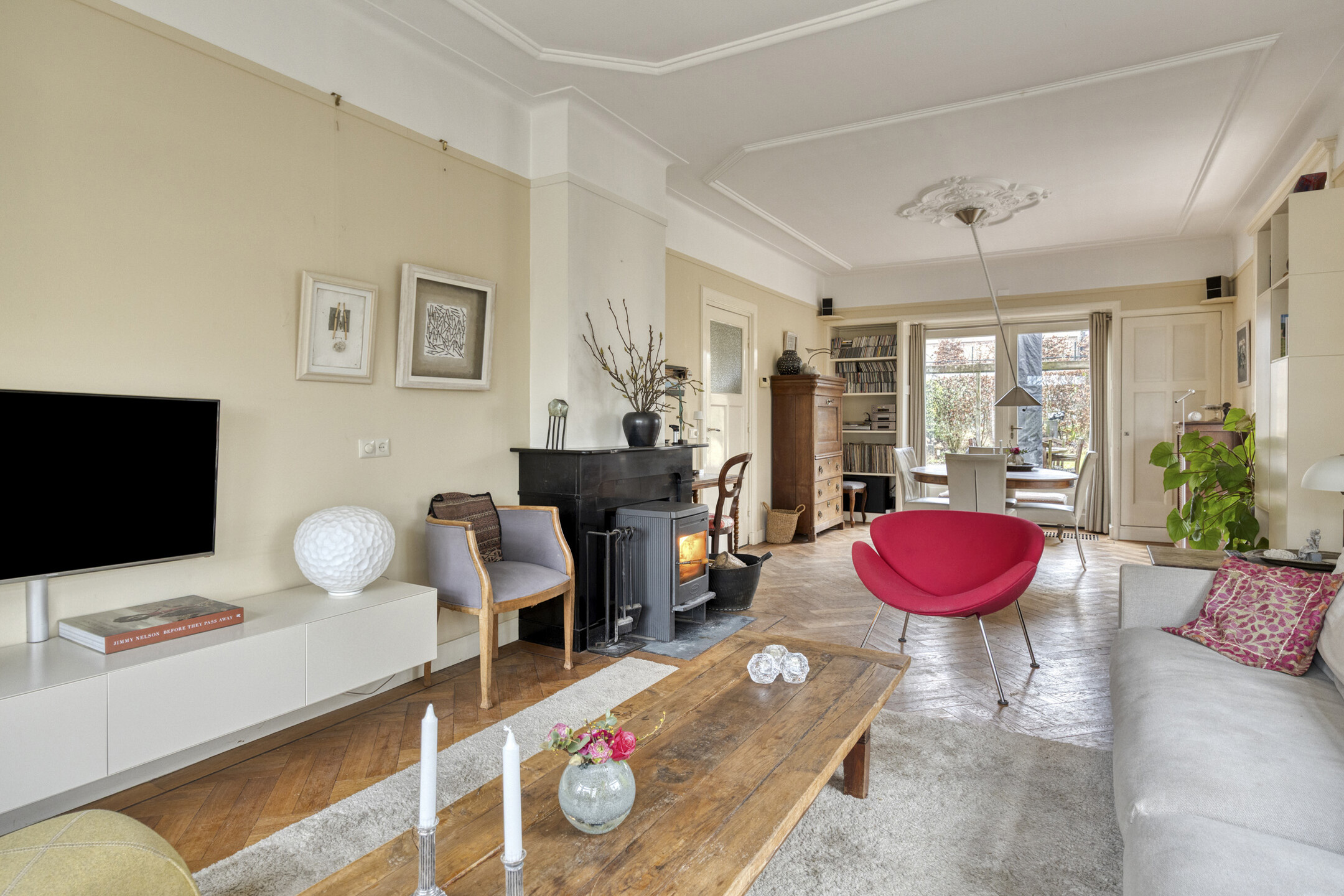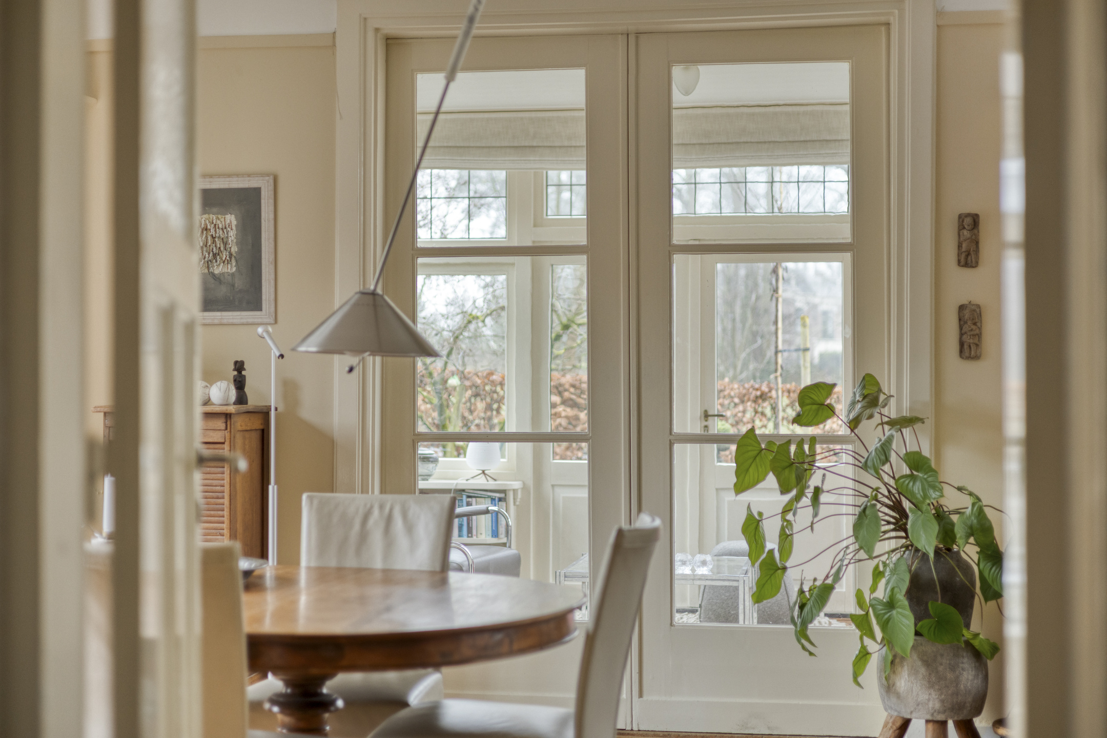 De ruime woonkamer heeft door de vele raampartijen en de karakteristieke erker een prachtige lichtinval. Vanuit de aangrenzende serre is er blijvend vrij uitzicht over het weiland. Zowel vanuit de woonkamer als vanuit de serre openen openslaande tuindeuren naar de royale tuin.